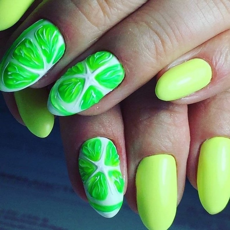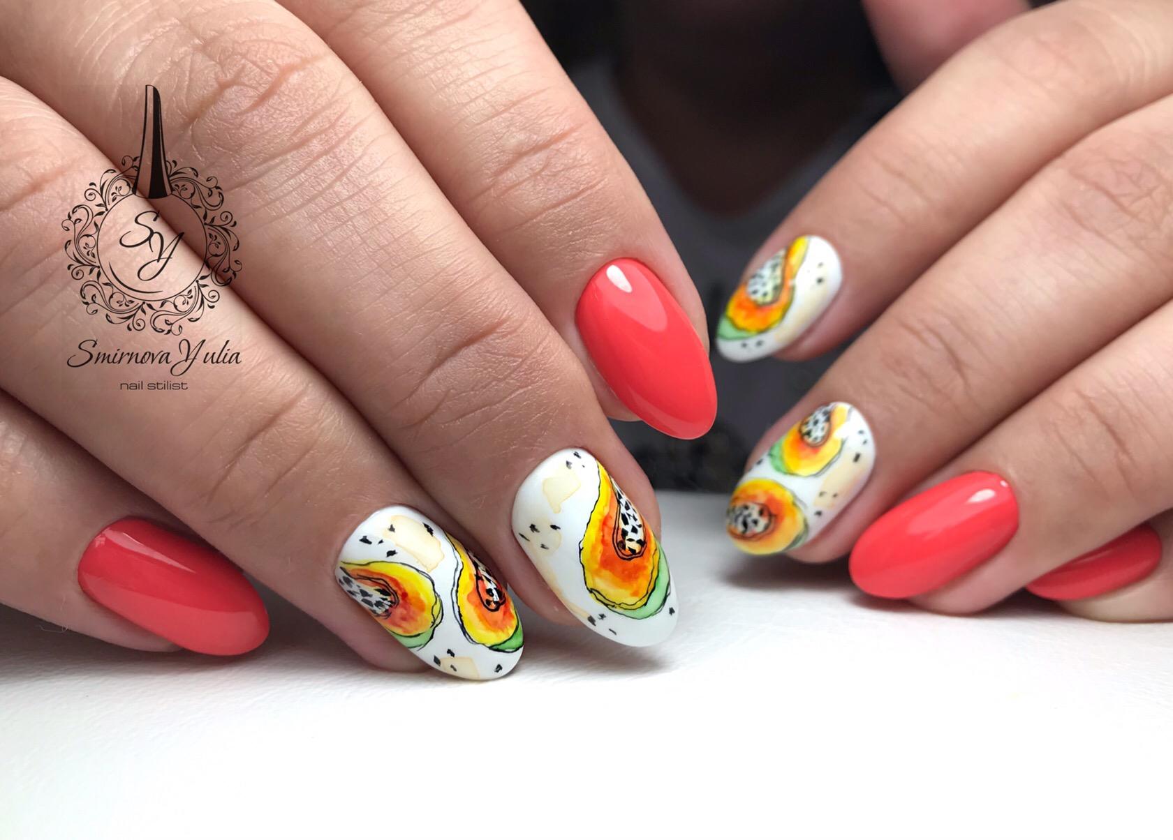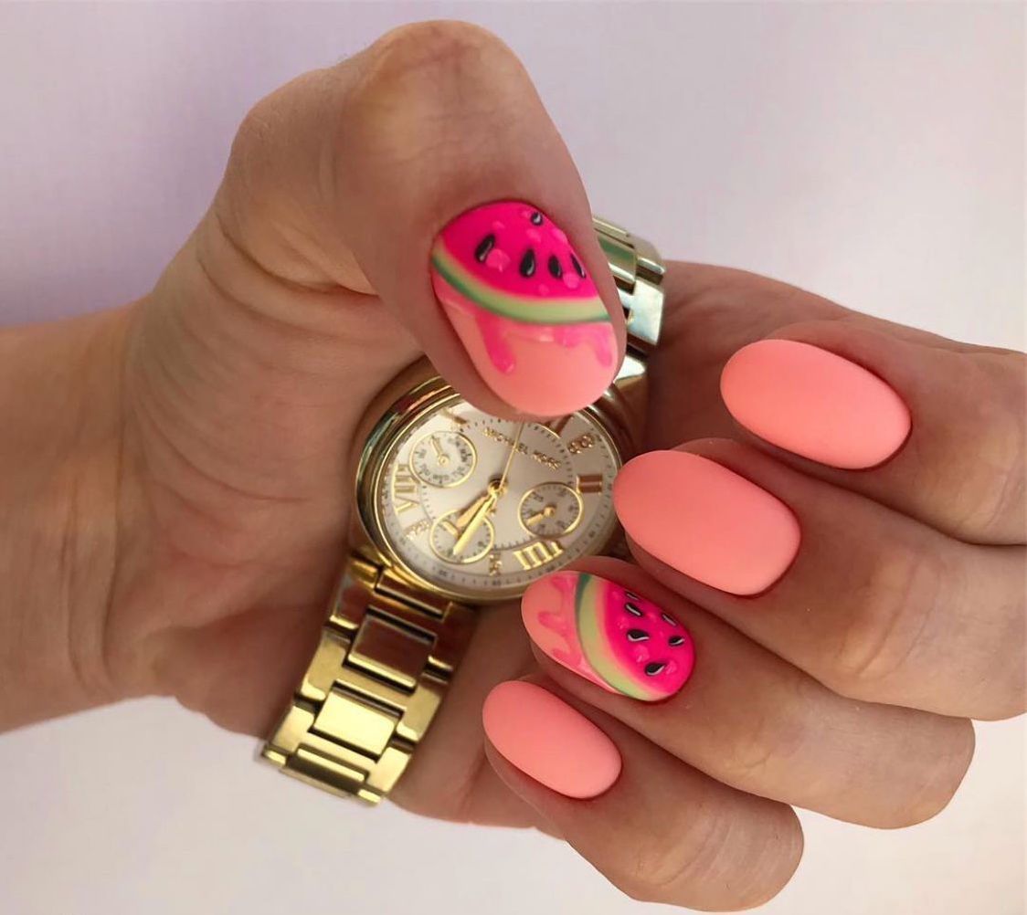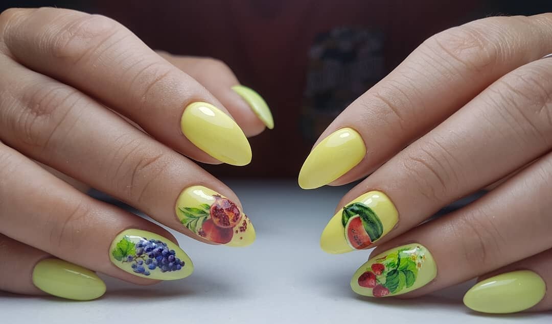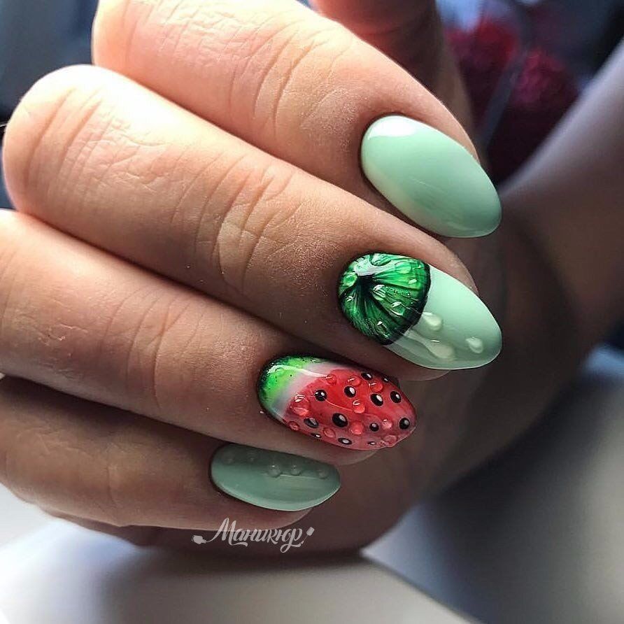 Не хотите цветочный дизайн в июле? Рассмотрите вариант с фруктами на ногтях. Их можно нарисовать целыми или в разрезе. Кстати, для создания такого дизайна можно использовать трафареты, наклейки.