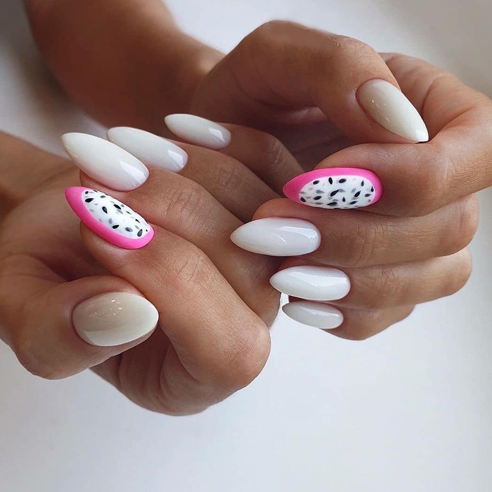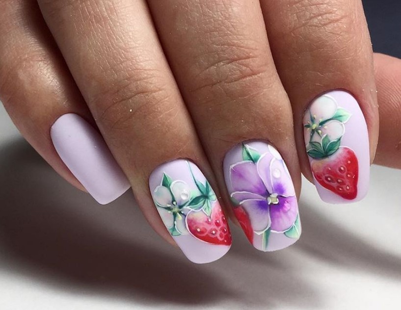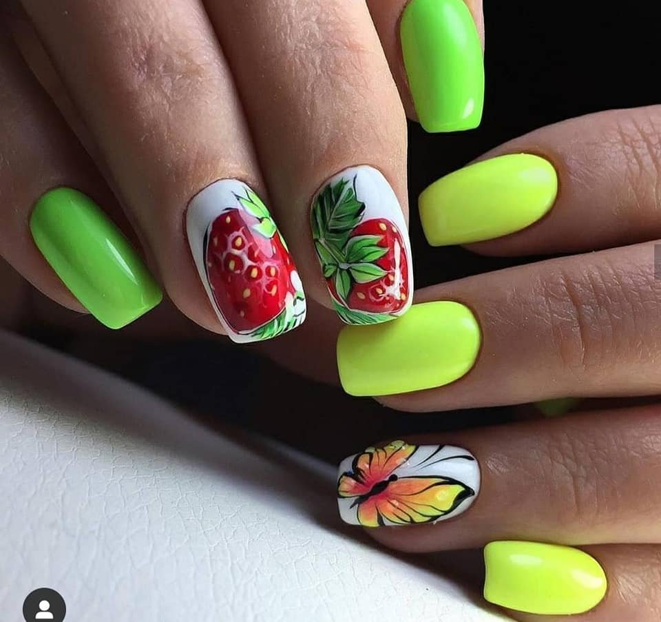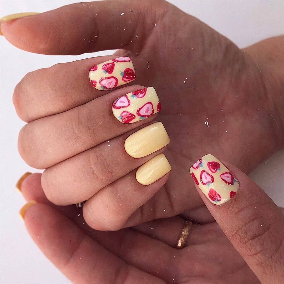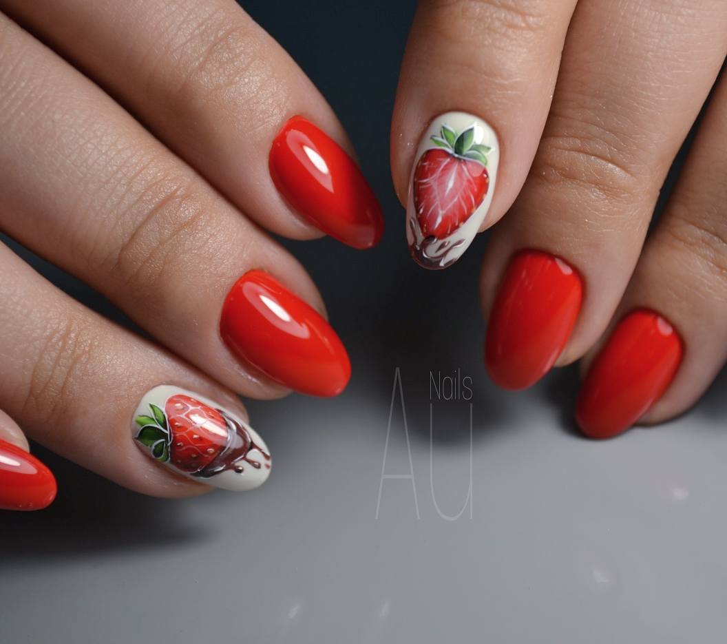 Не хотите цветочный дизайн в июле? Рассмотрите вариант с фруктами на ногтях. Их можно нарисовать целыми или в разрезе. Кстати, для создания такого дизайна можно использовать трафареты, наклейки.