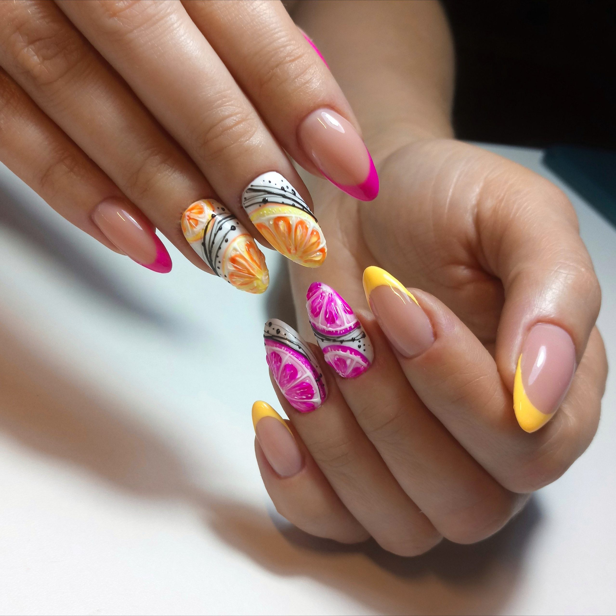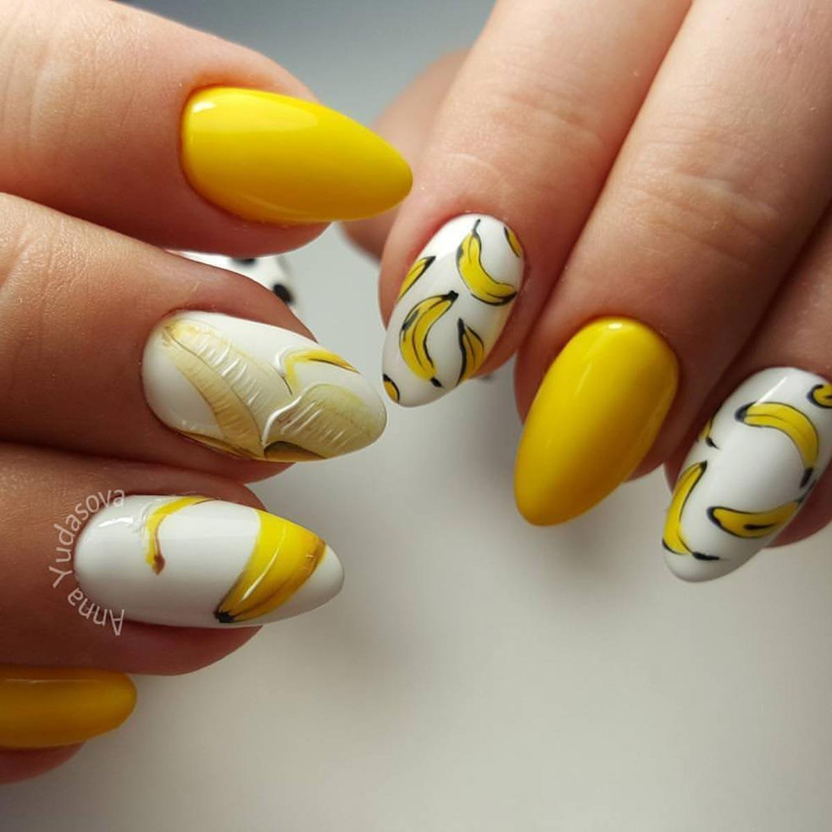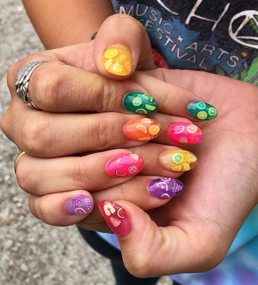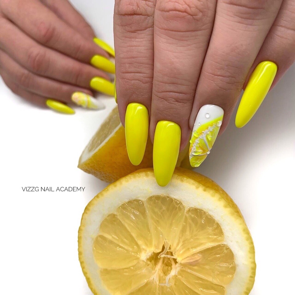 Не хотите цветочный дизайн в июле? Рассмотрите вариант с фруктами на ногтях. Их можно нарисовать целыми или в разрезе. Кстати, для создания такого дизайна можно использовать трафареты, наклейки.