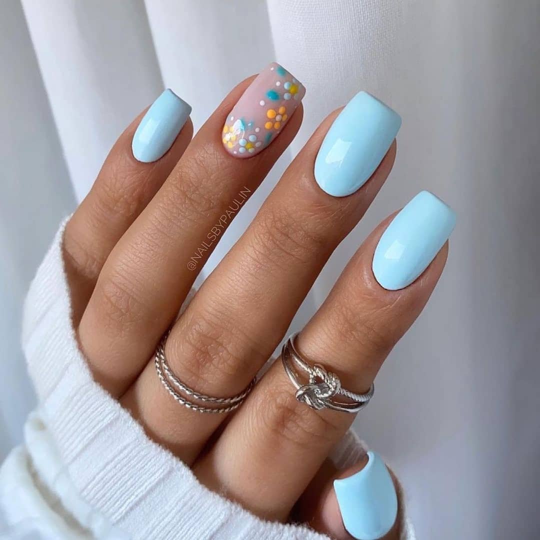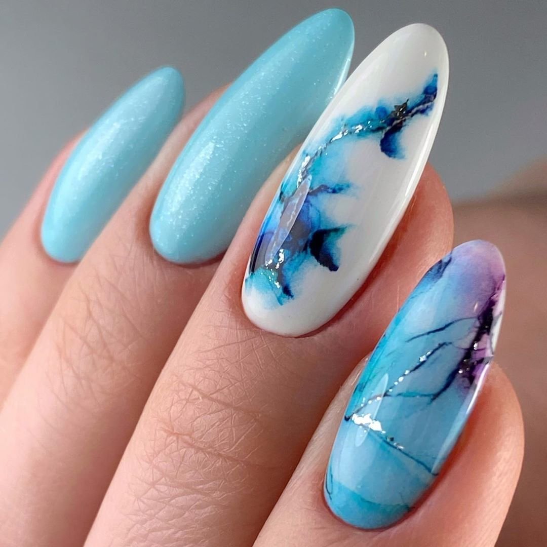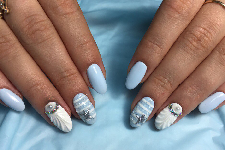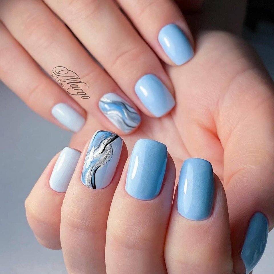 Только летом небо бывает таким высоким и голубым. Отразите это в маникюре. Яркие оттенки голубого отлично смотрятся на любой длине и форме ногтей. Обратите внимание на морской дизайн или маникюр с облаками — это один из трендов этого сезона.