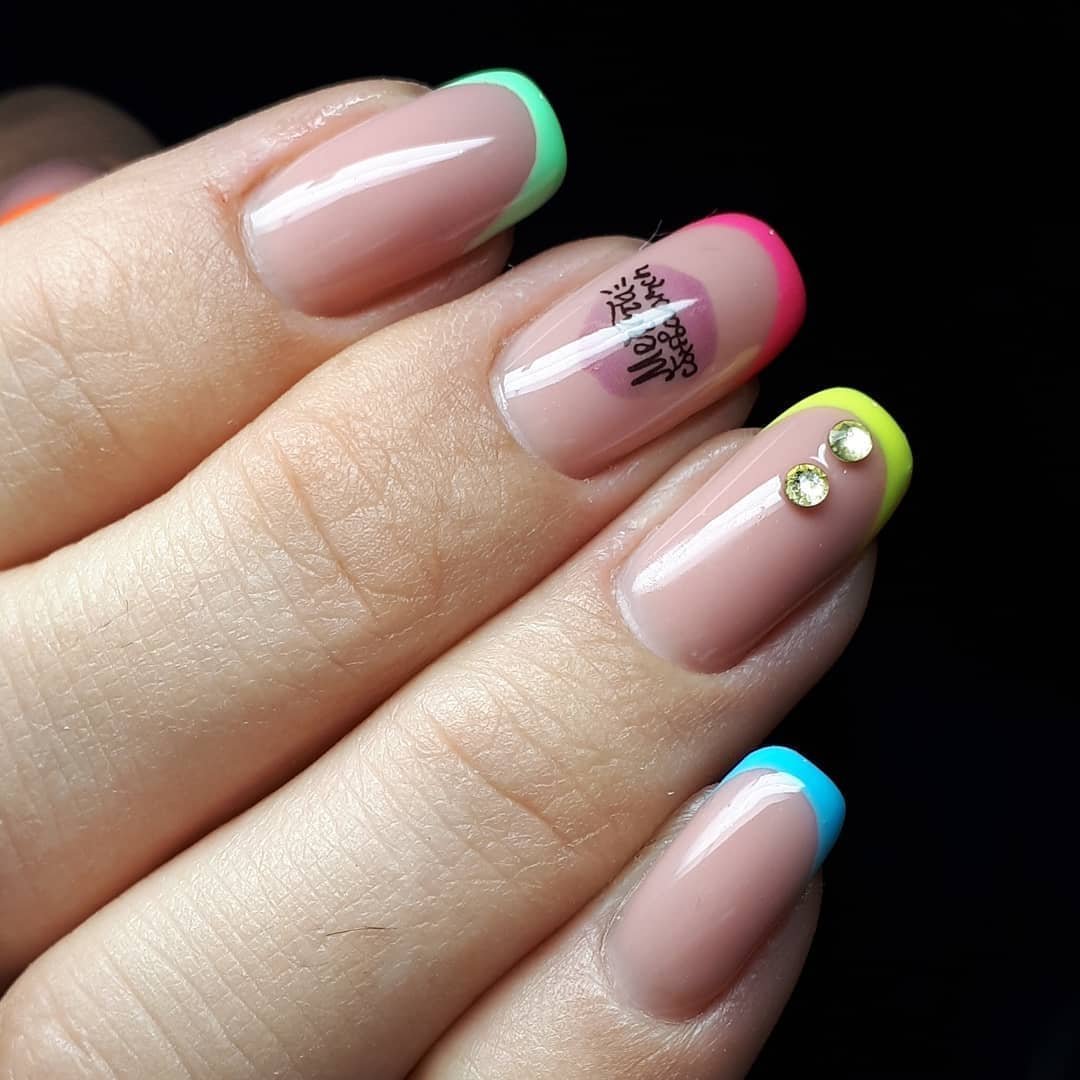 Каким френч должен быть в июле? Конечно, ярким и цветным. Для базы можно взять молочный оттенок, а кончик оформить в любой оттенок. Дополните френч рисунками, фольгой или блестками.