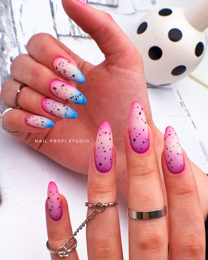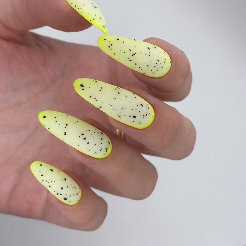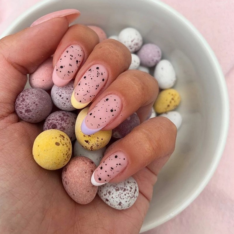 Изначально этот дизайн был не настолько смелым, а просто имитировал фактуру яичной скорлупки перепелок. Сейчас он уже мало похож на оригинал. Используйте самые яркие краски. А фактуру можно нарисовать любым цветом. То есть и здесь можно проявлять фантазию и создавать июльский маникюр удивительным и индивидуальным.