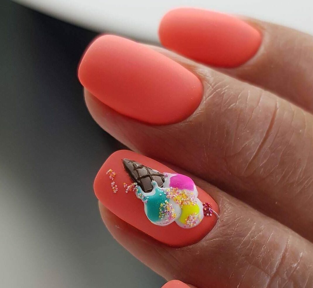 Одна из фишек маникюра в июле — использование объемного декора. Но мы говорим не о 3д огромных цветах и других фигурах из полимерной глины. В этом сезоне мастера используют прозрачные топы для придания дизайну особого шарма. Например, прозрачные капли на сладких свежих фруктах или объемное выделение лепестков нежных цветков.