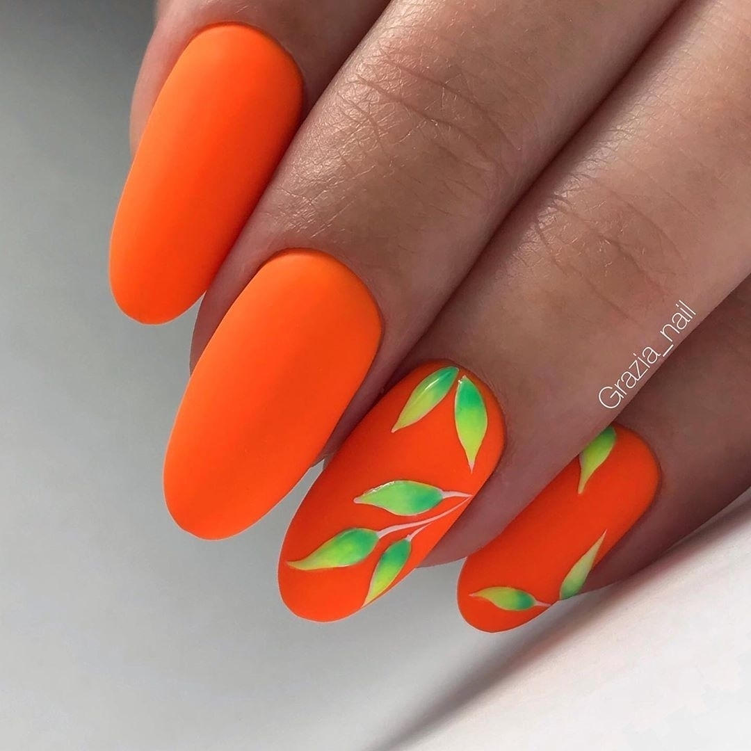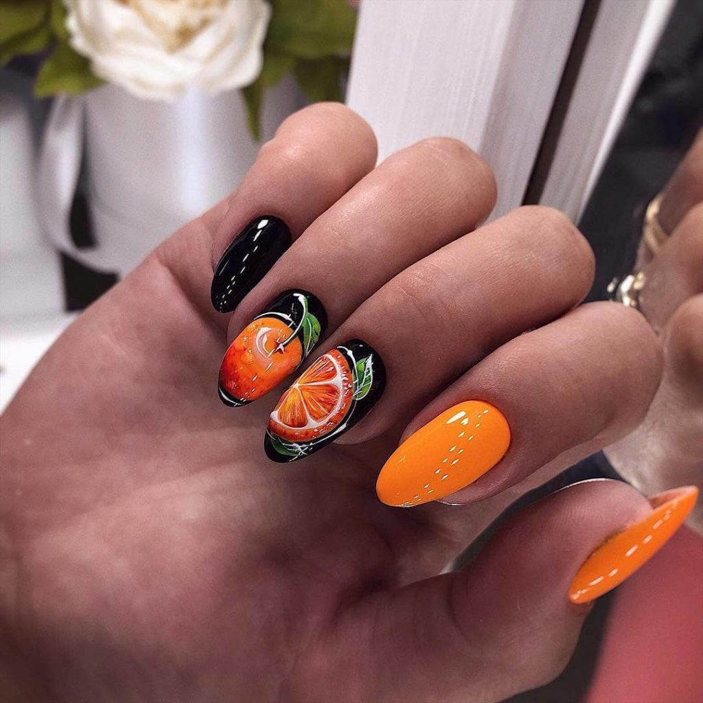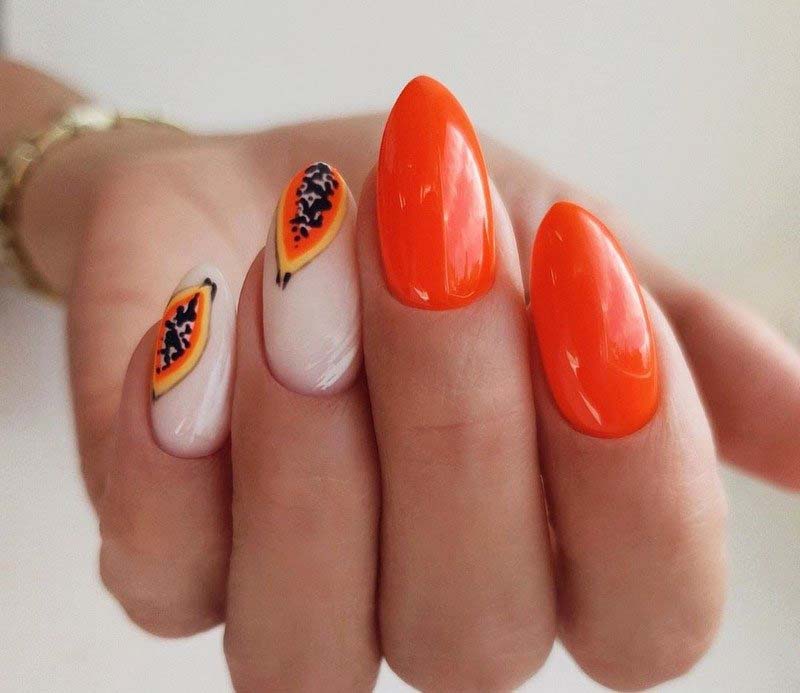 Сочные цитрусы мы привыкли есть зимой. Но оранжевый цвет отлично вписываются в летний маникюр. Кстати, один из несомненных трендов этого сезона — маникюр с фруктами.