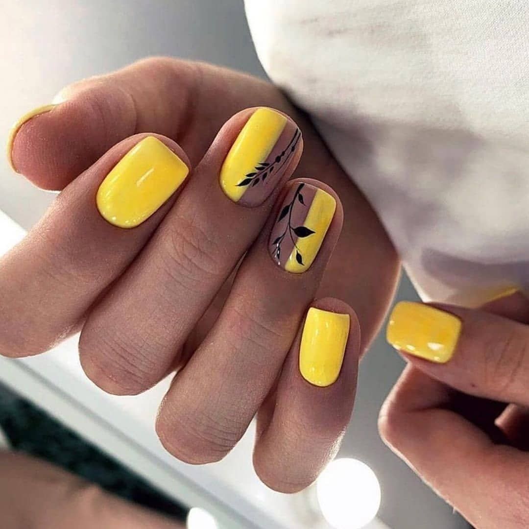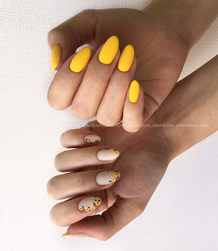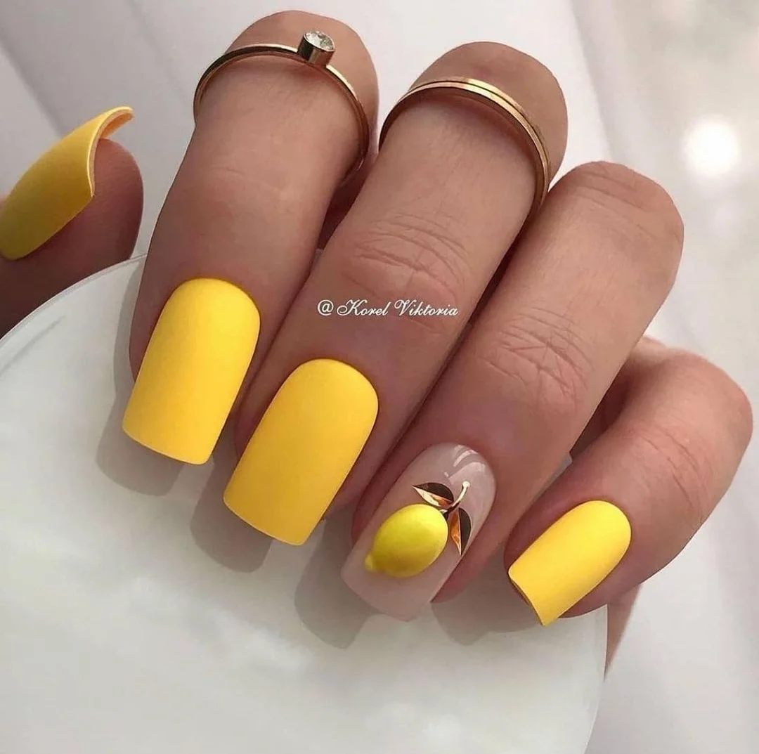 Яркое солнце так активно в июле, поэтому мы рекомендуем использовать желтый цвет в маникюре. Например, сделать матовый дизайн или нарисовать веселое солнышко на нейтральной базе.