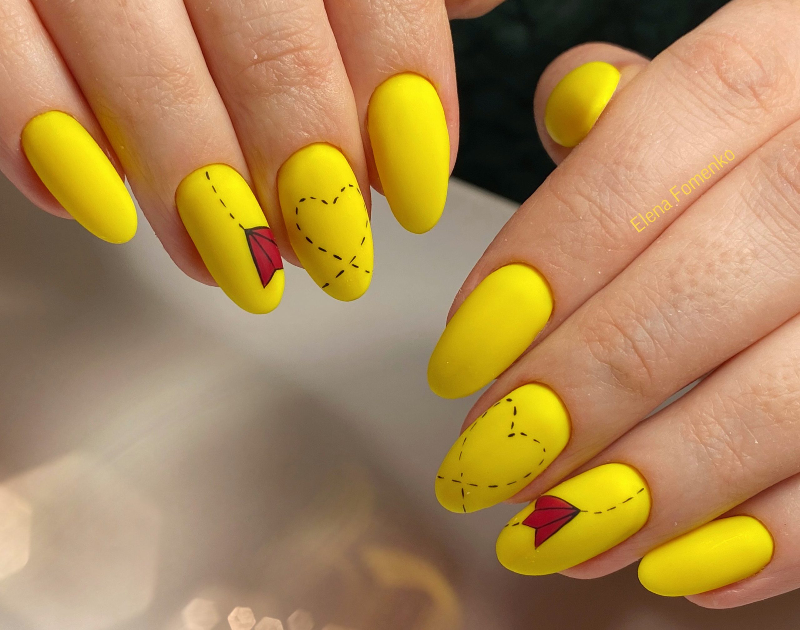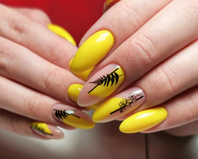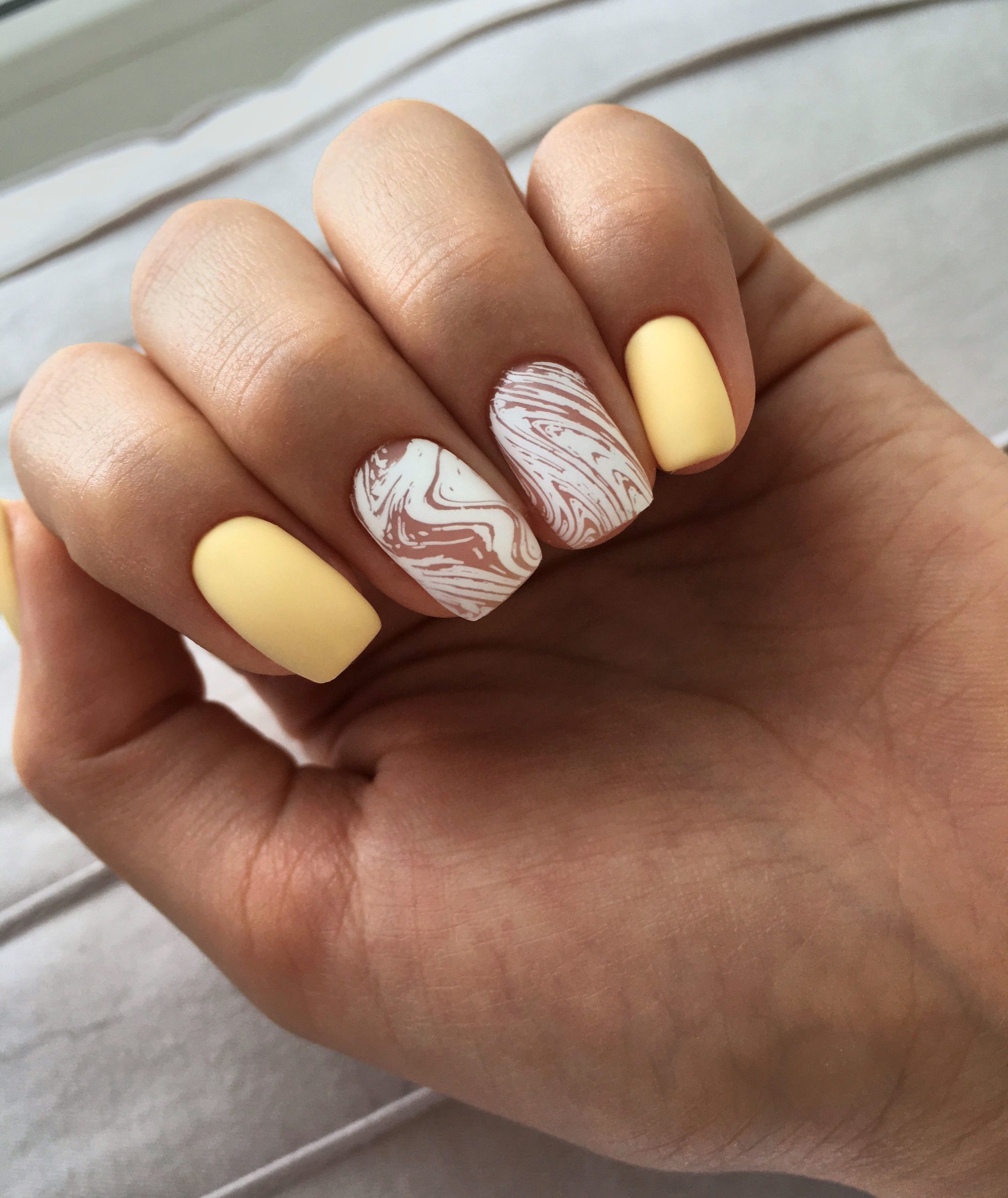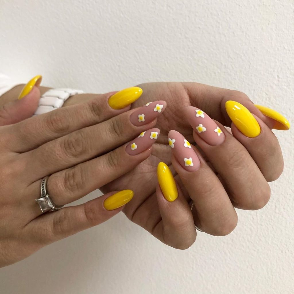 Яркое солнце так активно в июле, поэтому мы рекомендуем использовать желтый цвет в маникюре. Например, сделать матовый дизайн или нарисовать веселое солнышко на нейтральной базе.
