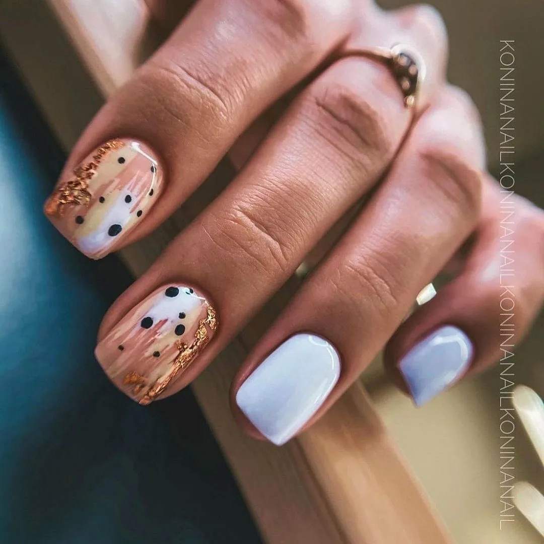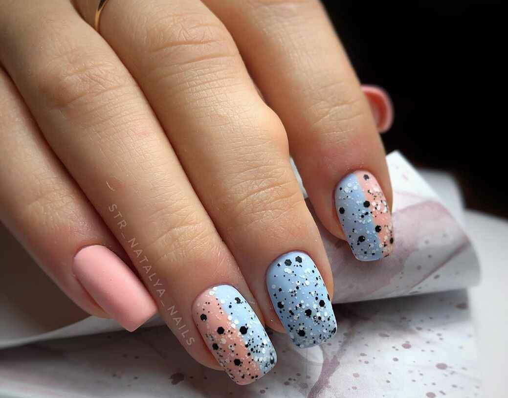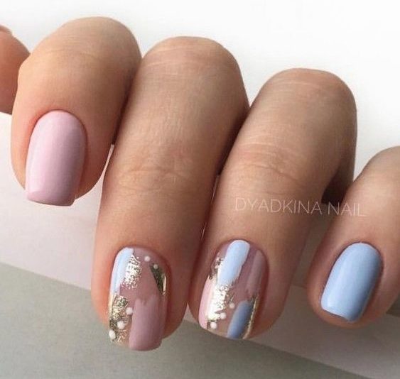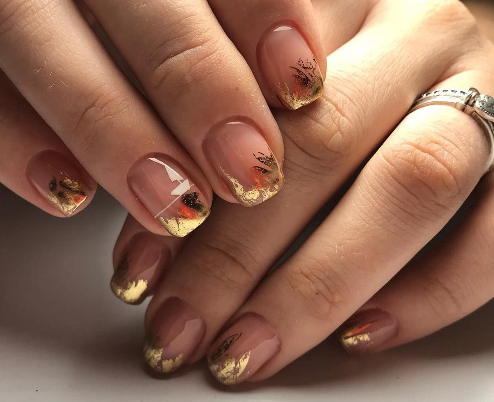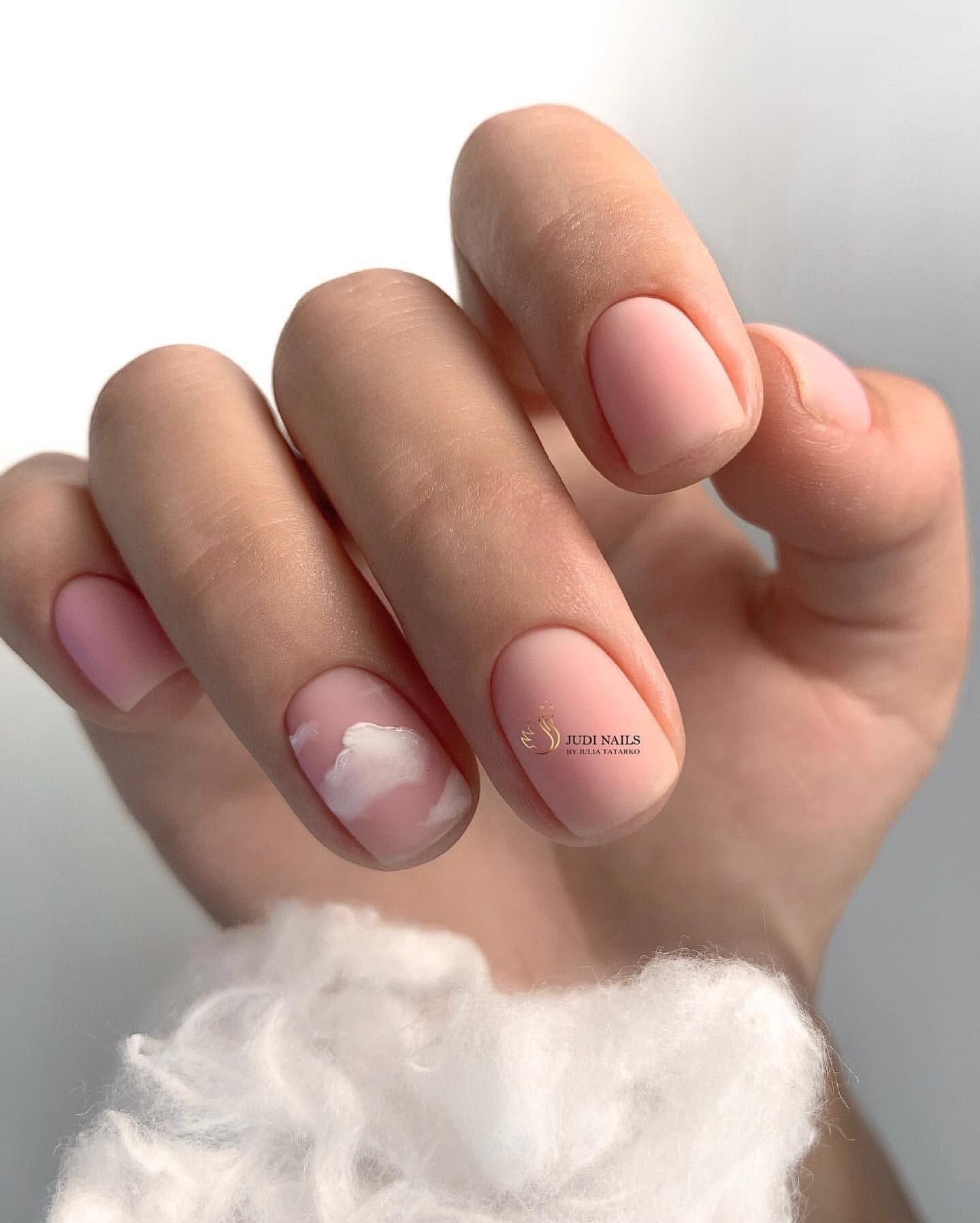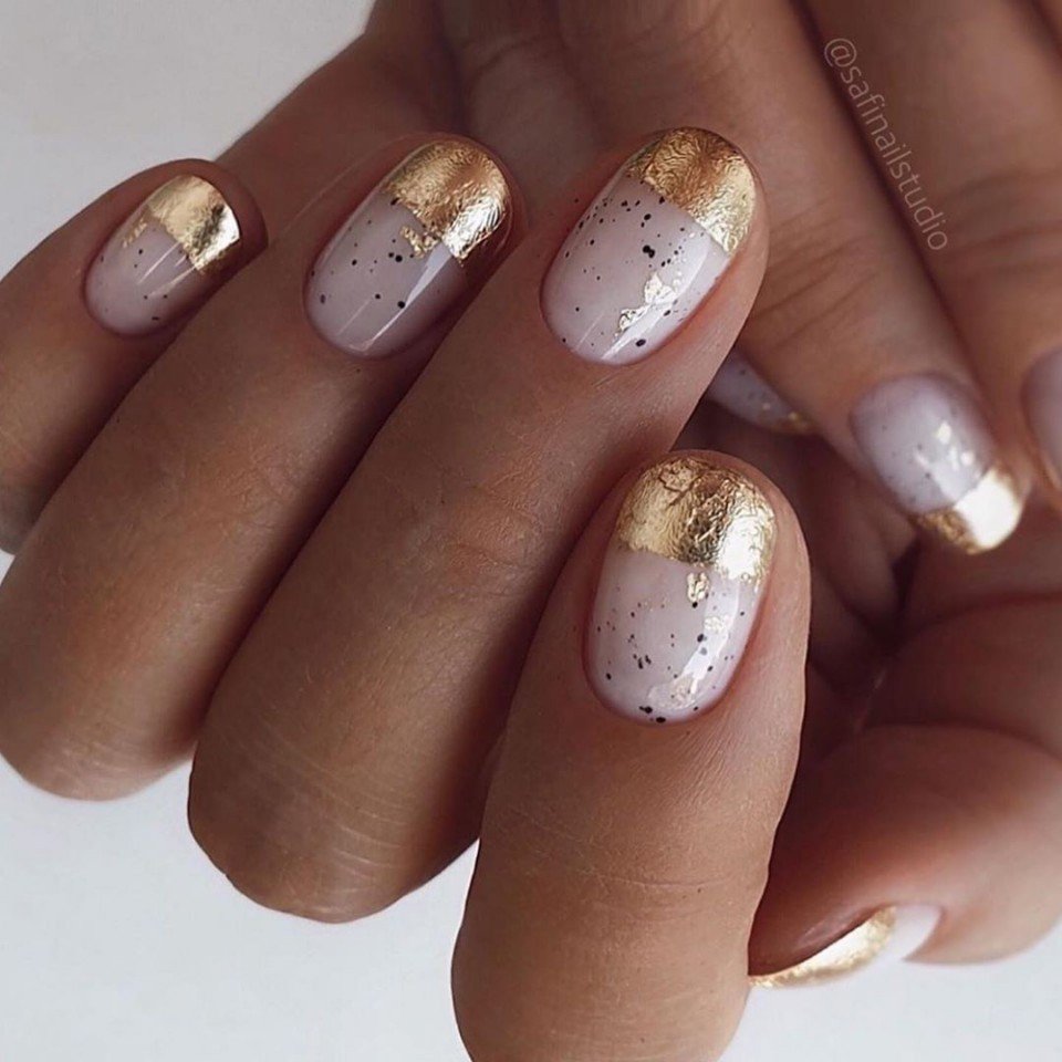 Этот нежный дизайн в лидерах уже не первый сезон. Его можно сочетать с рисунками и фольгированными участками — все в ваших руках. Оттенки могут быть любые. Этот вид декора очень подходит коротким ногтям, особенно если оформить их в технике омбре.