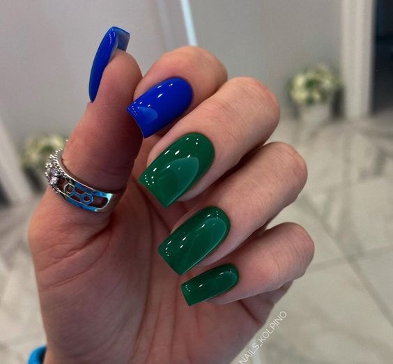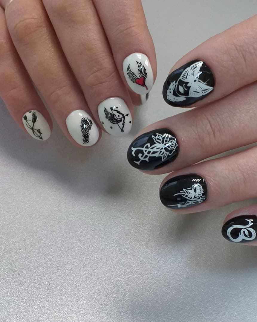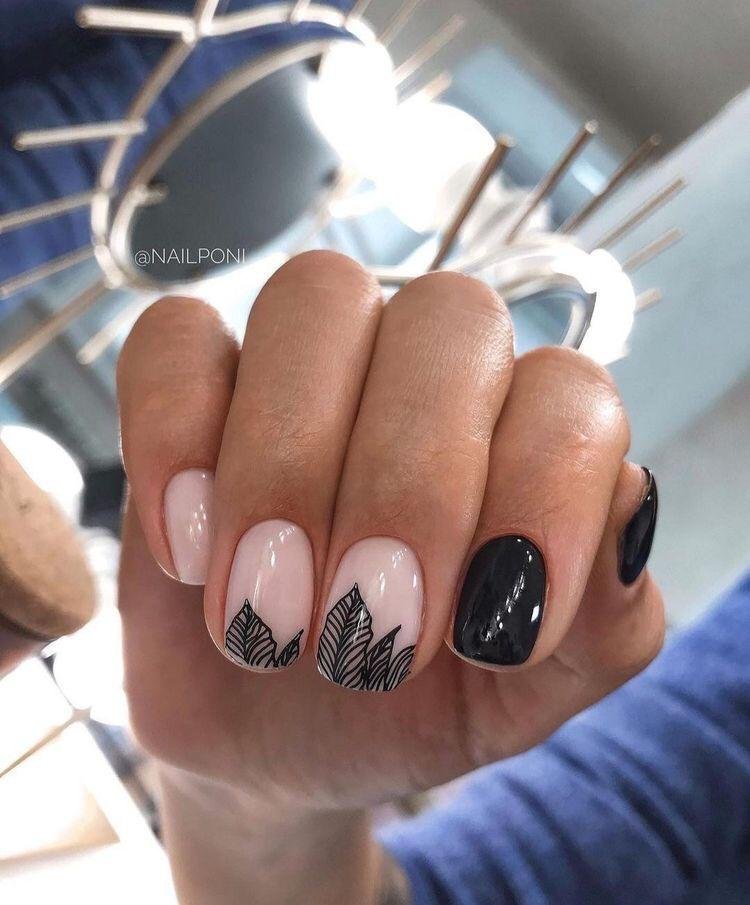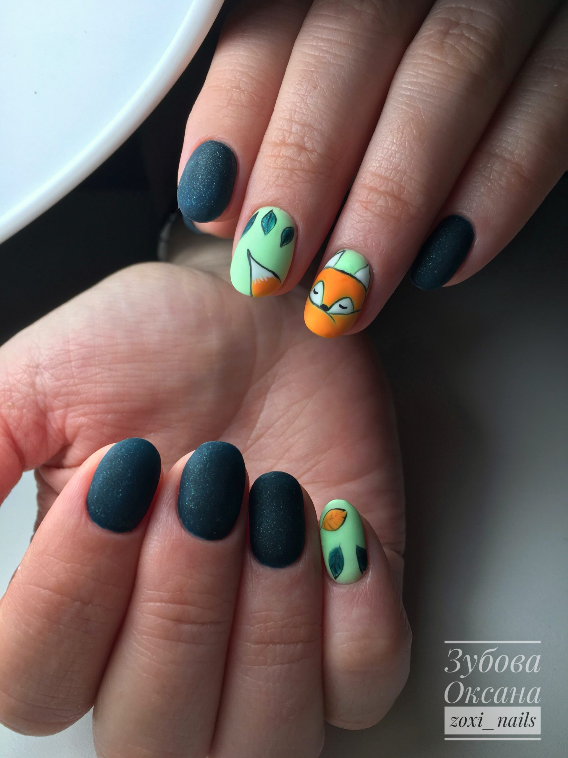 Это очень интересный прием для дизайна коротких ногтей. Здесь можно дать волю фантазии и создать действительно уникальный маникюр. Вы можете оформить одну руку однотонным покрытием, на ноготки второй нанести интересный рисунок. Другой вариант — чередование декора в произвольном стиле, без симметрии. Кроме того, вы можете оформить все пальчики в разный оттенок. Эффектно смотрится сочетание техники разные руки и омбре, когда растяжку цвета мастер проводит от пальчика к пальчику.