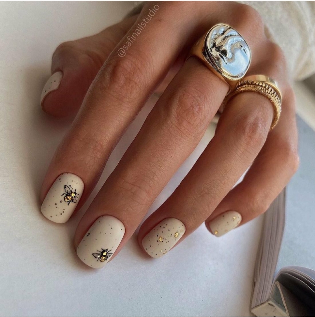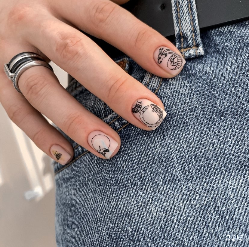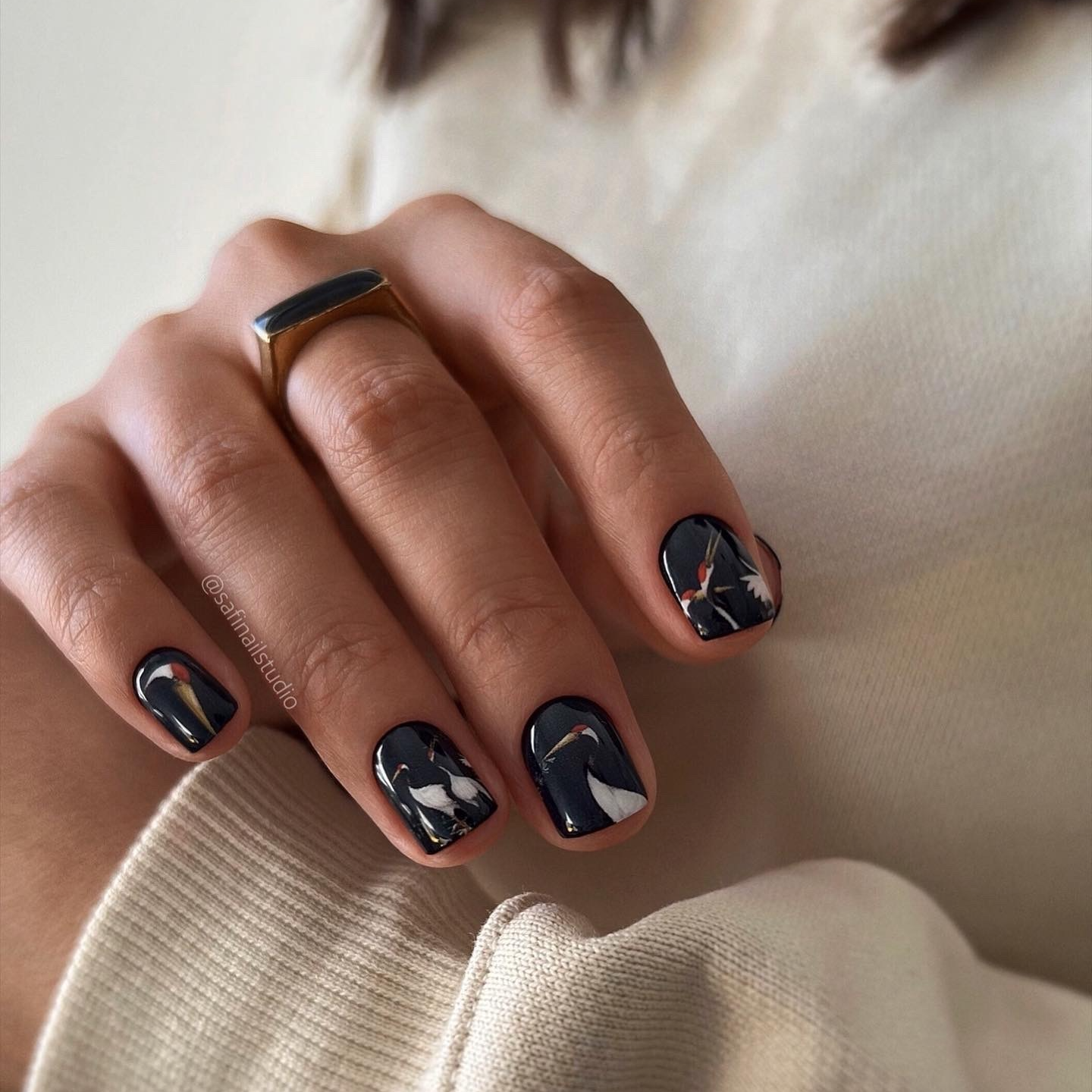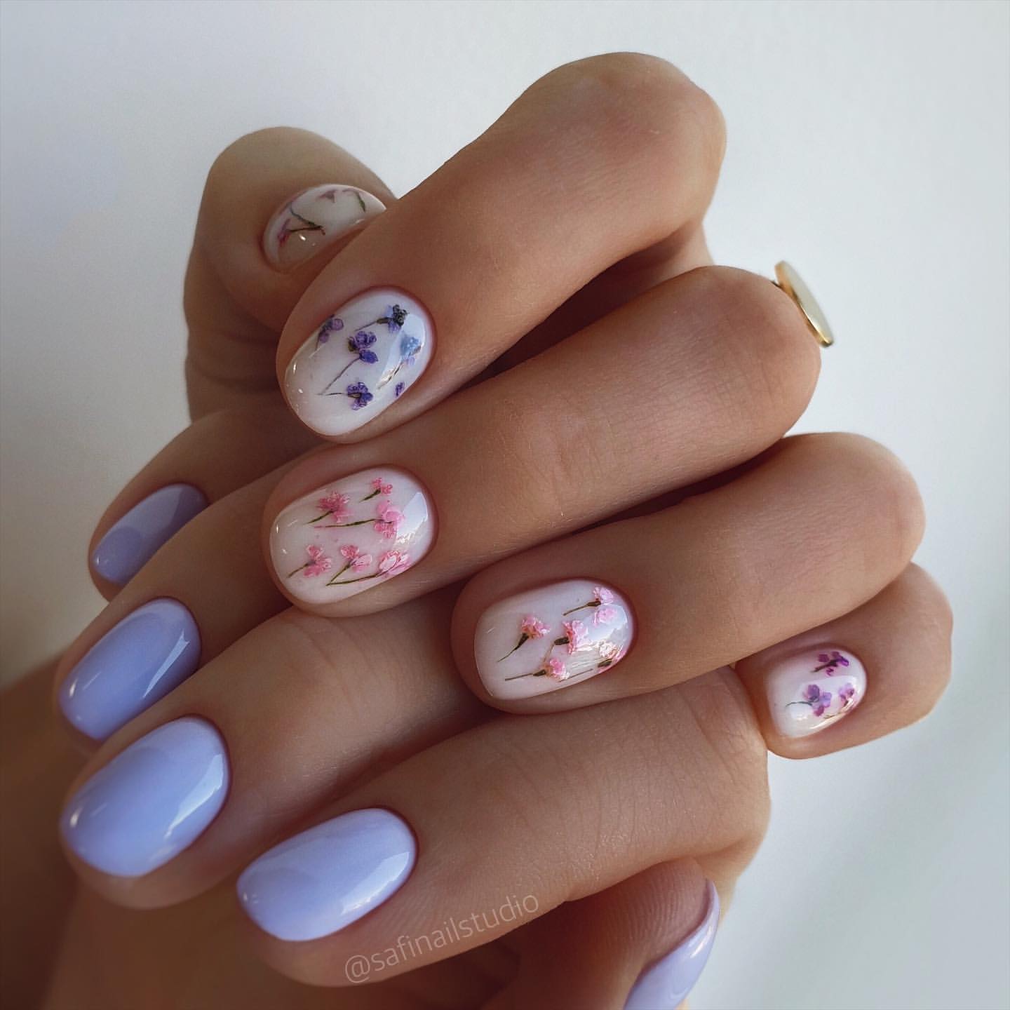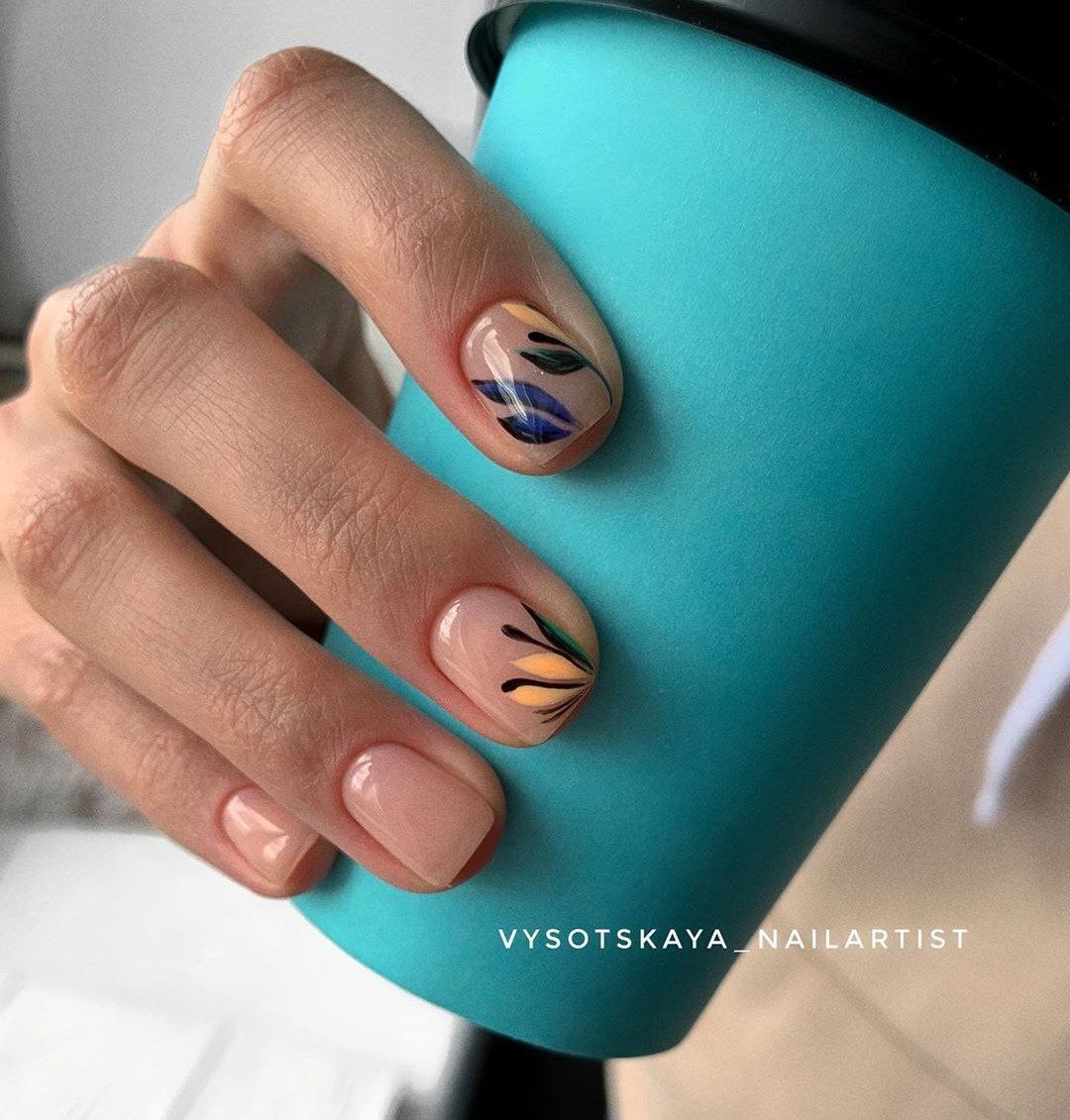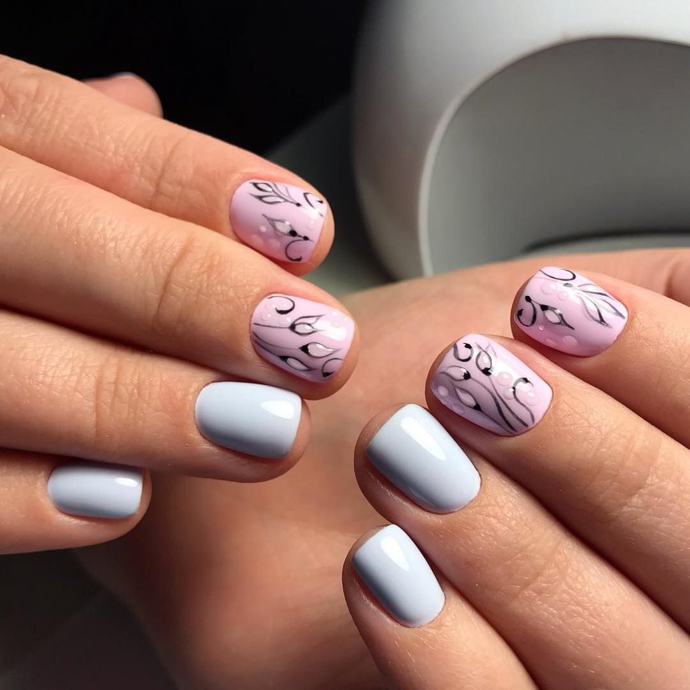 Маникюр с рисунком — один из несомненных трендов этого сезона. Весной особенно актуален цветочный дизайн. Для коротких ногтей рекомендуем выбирать мелкие цветы, которыми можно заполнить всю площадь пластины. Их можно нарисовать, нанести с помощью стемпинга или использовать наклейку. Какие еще рисунки актуальны? Флористика, животные, сердечки, насекомые и др. Все это актуально в теплое время года. А вот зимой выбирают новогоднюю тематику, снежинки. Осенью актуально смотрится маникюр с прозрачными капельками на ногтях.