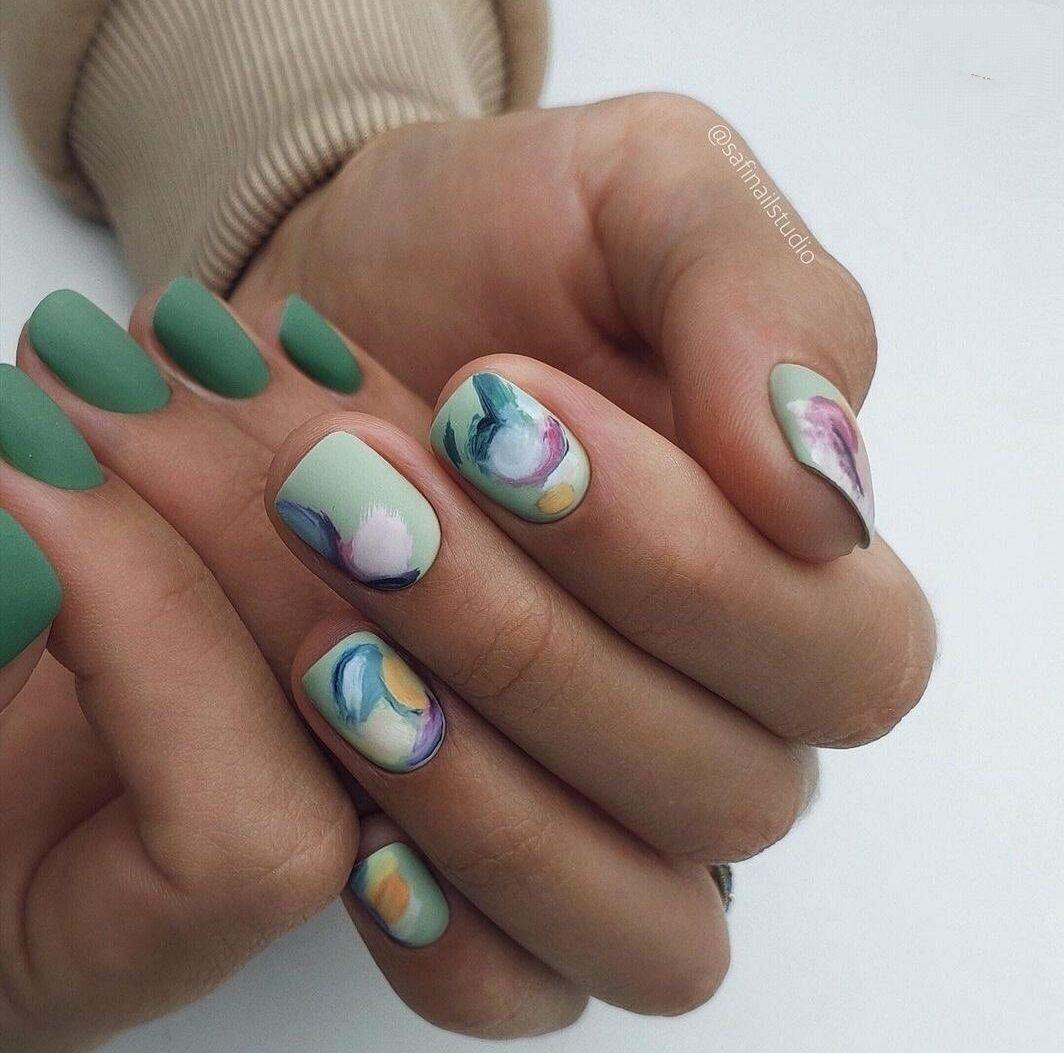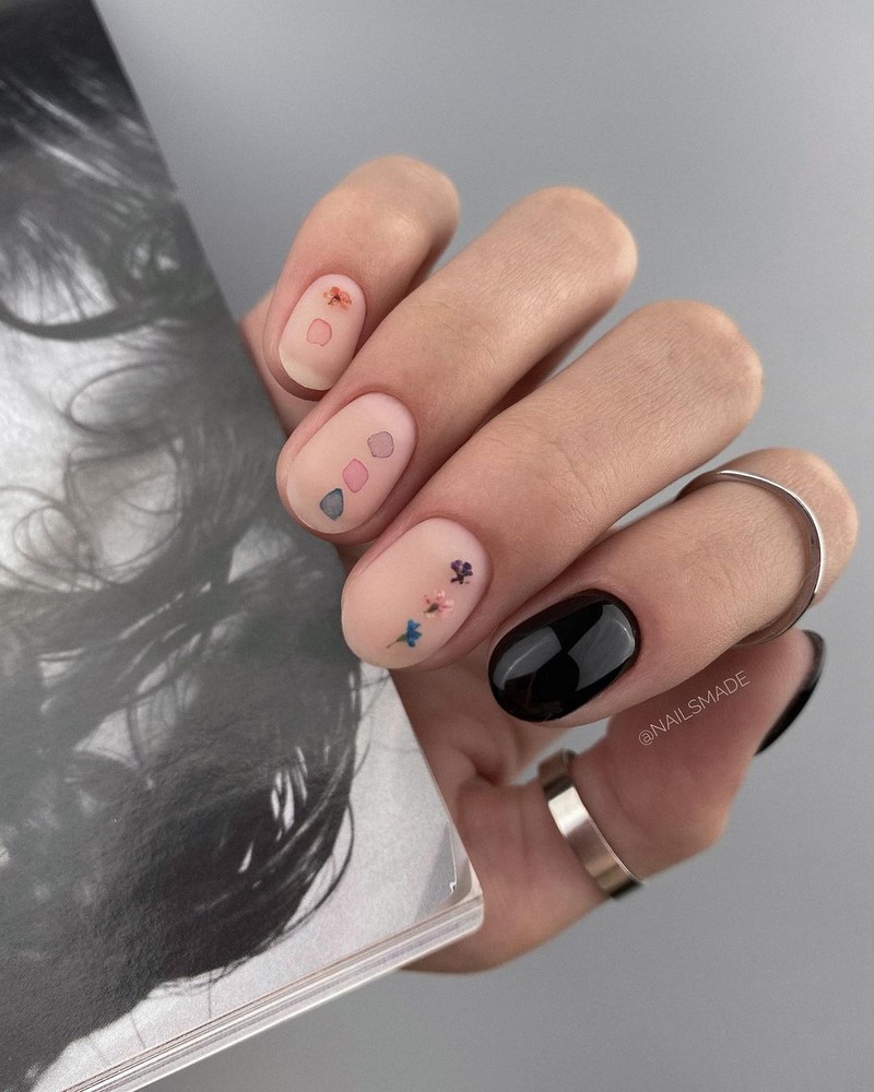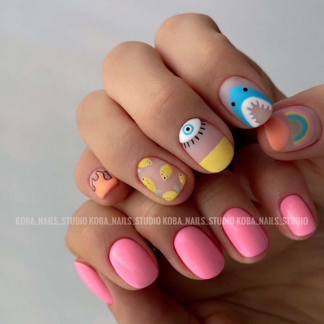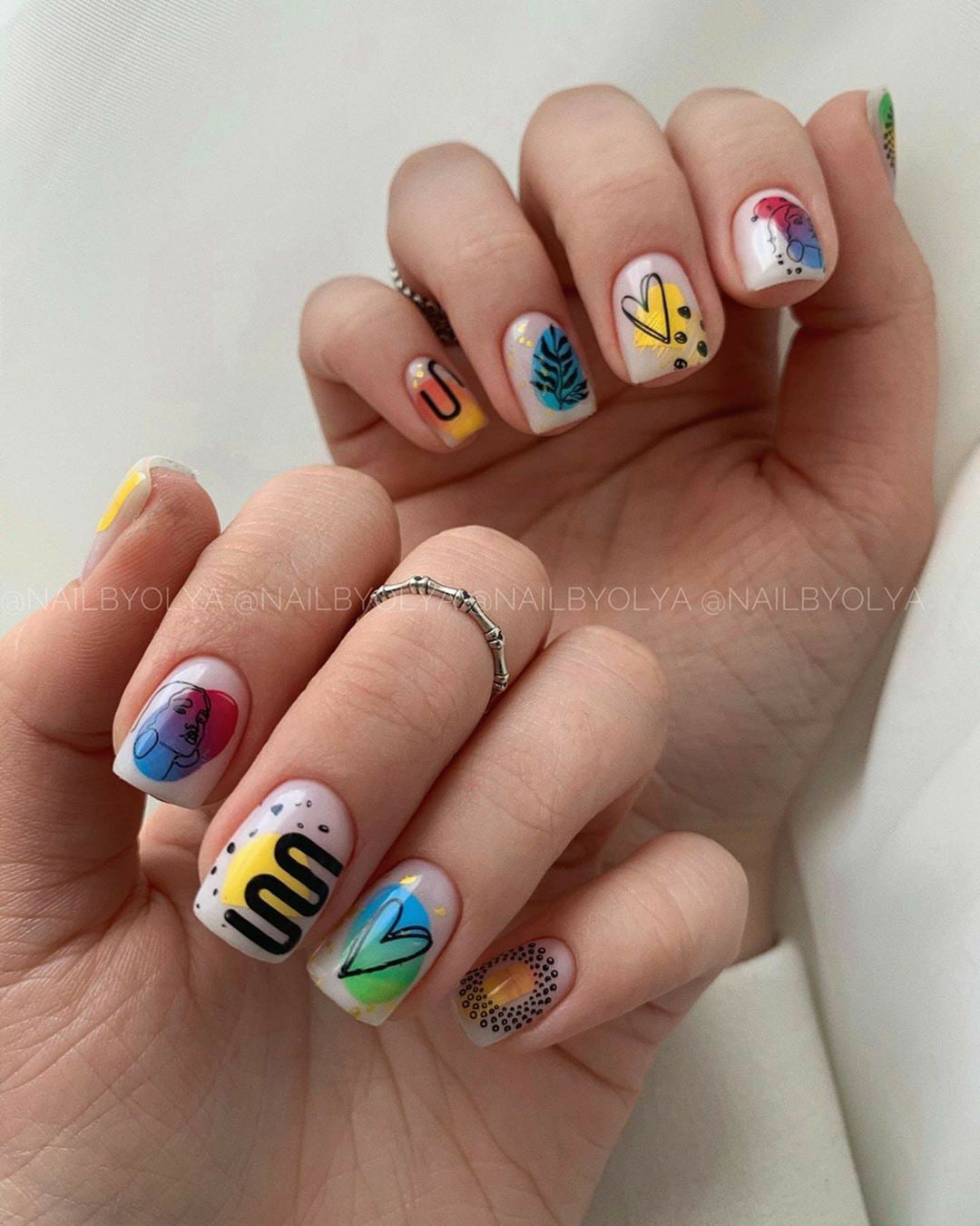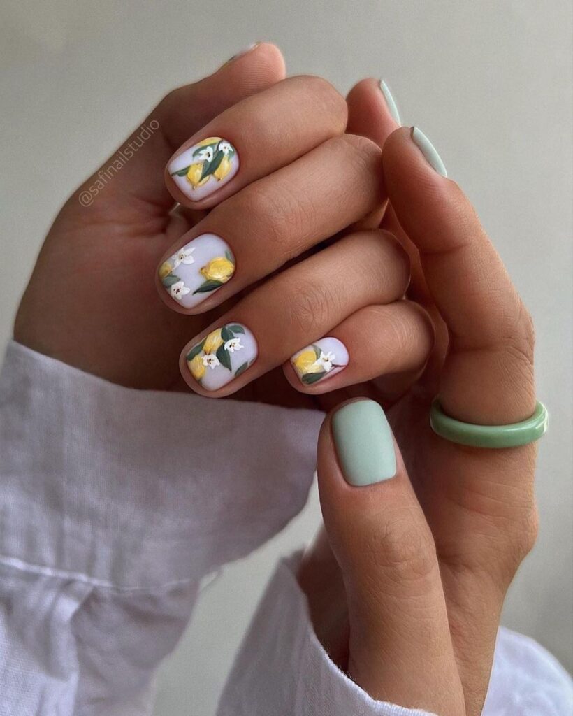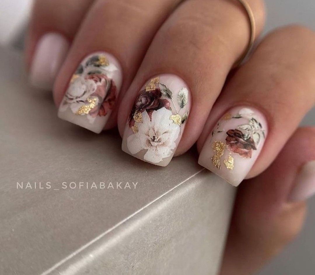 Маникюр с рисунком — один из несомненных трендов этого сезона. Весной особенно актуален цветочный дизайн. Для коротких ногтей рекомендуем выбирать мелкие цветы, которыми можно заполнить всю площадь пластины. Их можно нарисовать, нанести с помощью стемпинга или использовать наклейку. Какие еще рисунки актуальны? Флористика, животные, сердечки, насекомые и др. Все это актуально в теплое время года. А вот зимой выбирают новогоднюю тематику, снежинки. Осенью актуально смотрится маникюр с прозрачными капельками на ногтях.