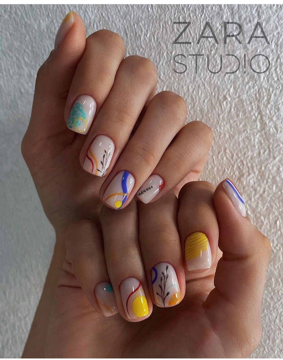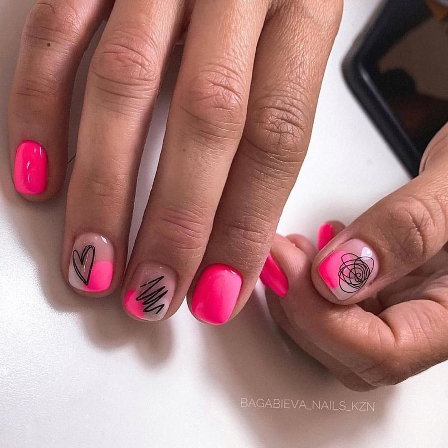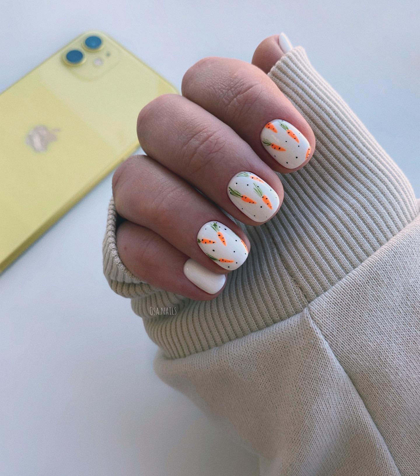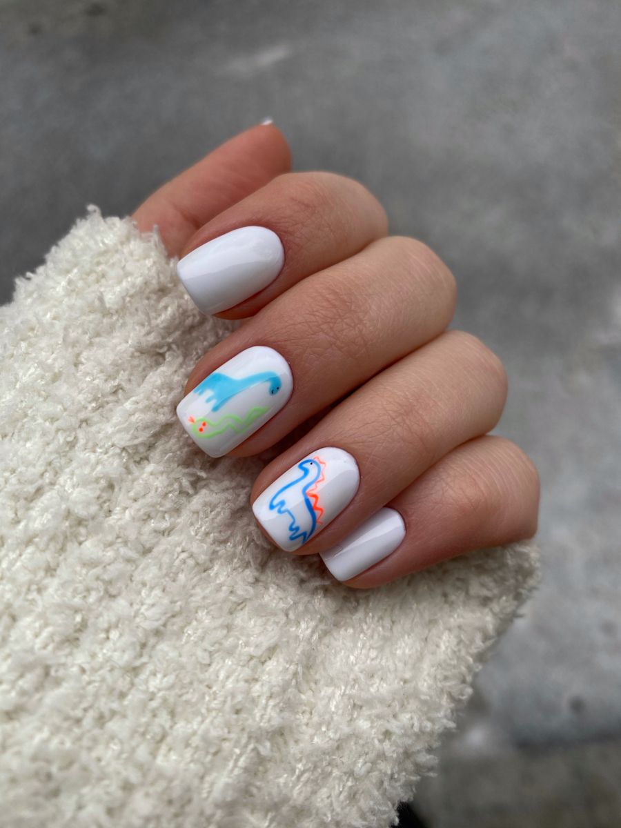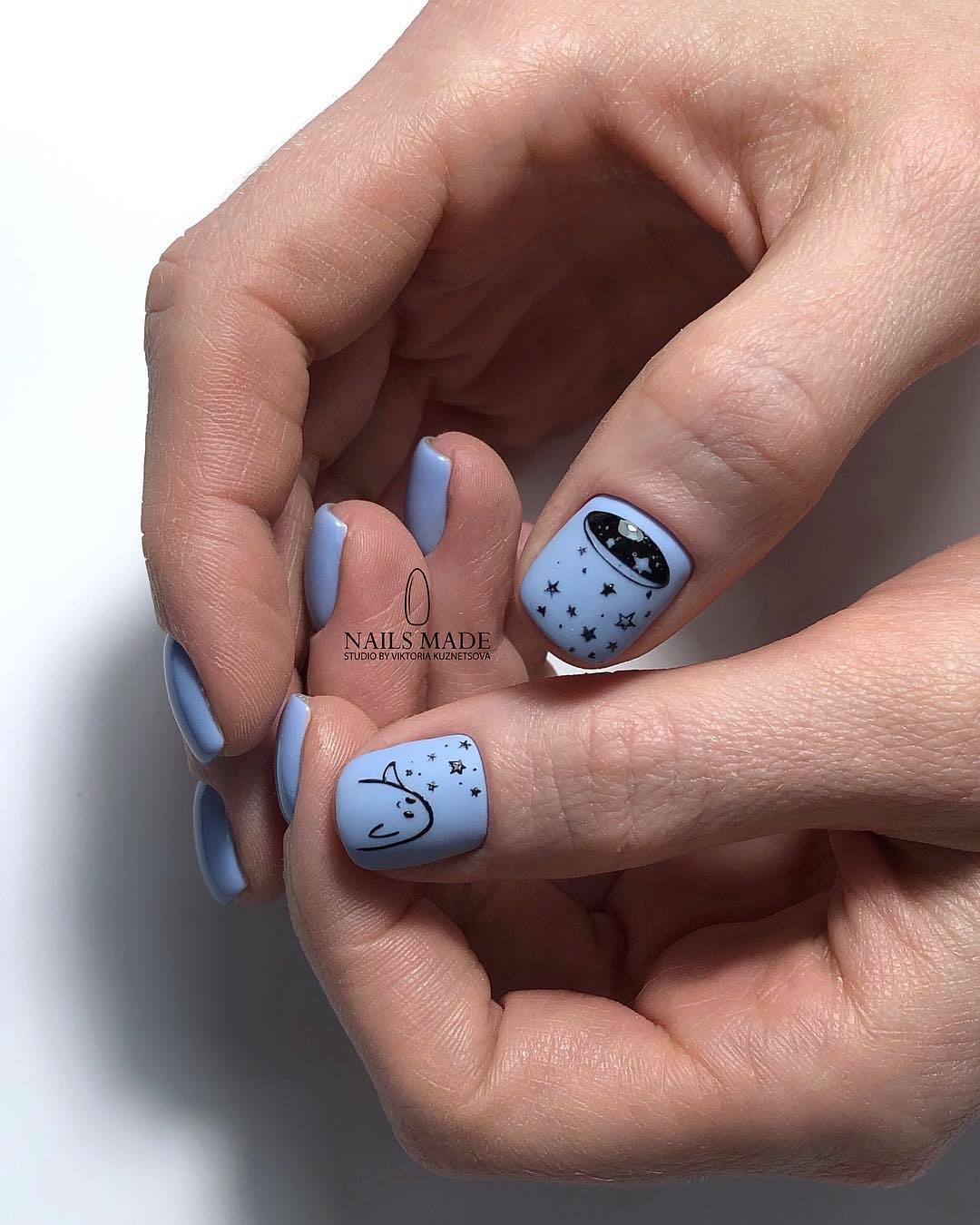 Маникюр с рисунком — один из несомненных трендов этого сезона. Весной особенно актуален цветочный дизайн. Для коротких ногтей рекомендуем выбирать мелкие цветы, которыми можно заполнить всю площадь пластины. Их можно нарисовать, нанести с помощью стемпинга или использовать наклейку. Какие еще рисунки актуальны? Флористика, животные, сердечки, насекомые и др. Все это актуально в теплое время года. А вот зимой выбирают новогоднюю тематику, снежинки. Осенью актуально смотрится маникюр с прозрачными капельками на ногтях.