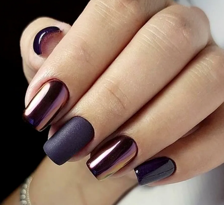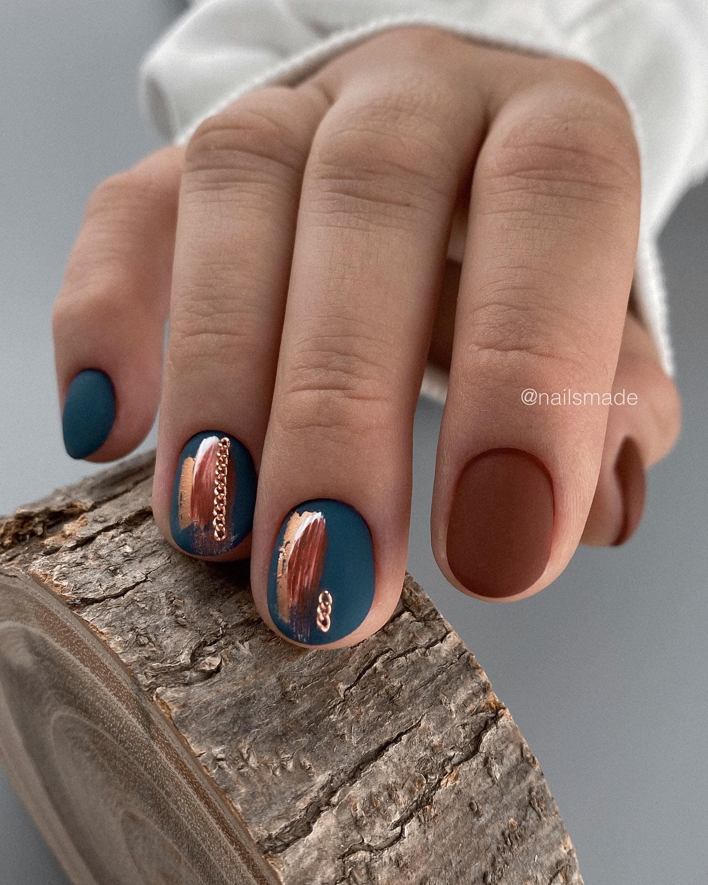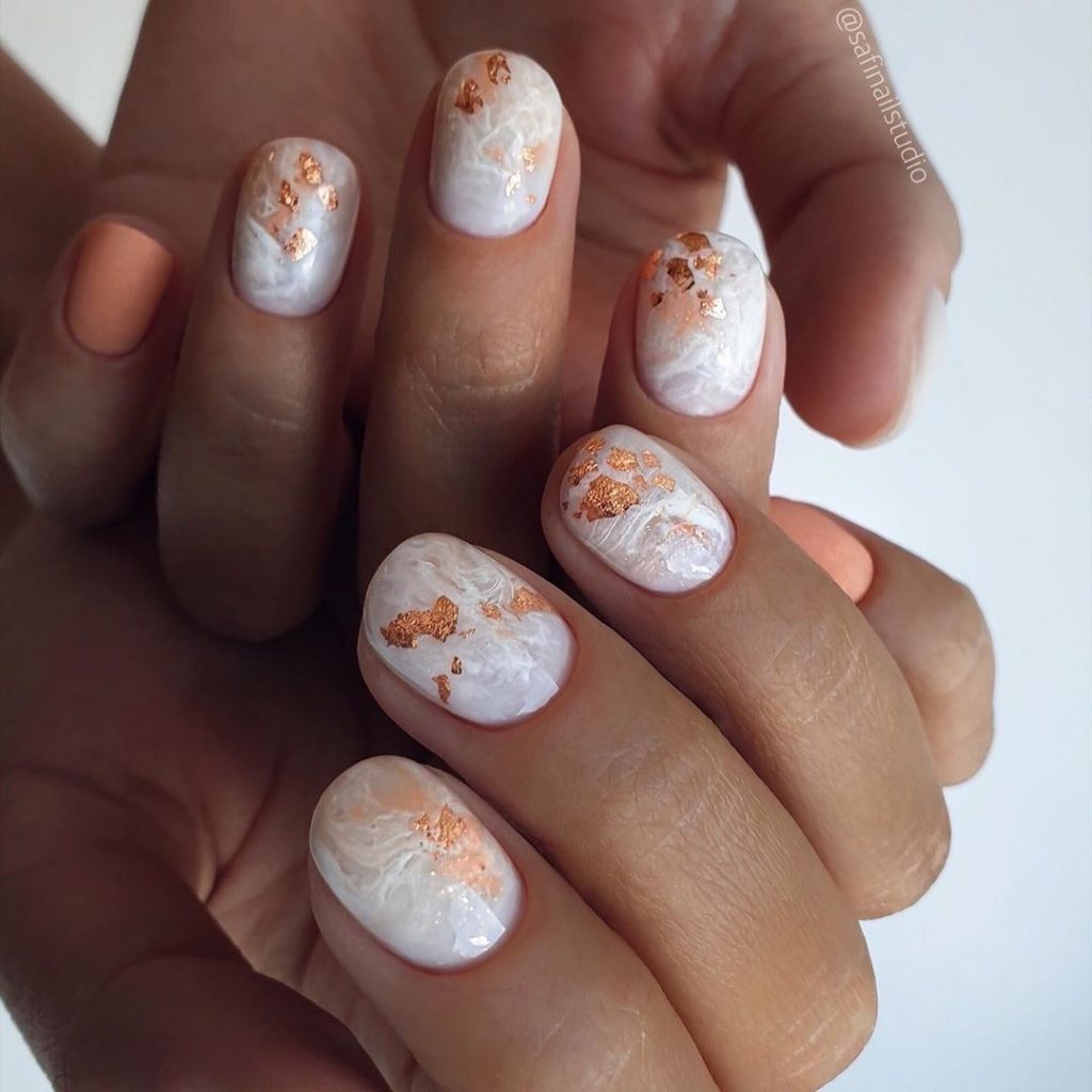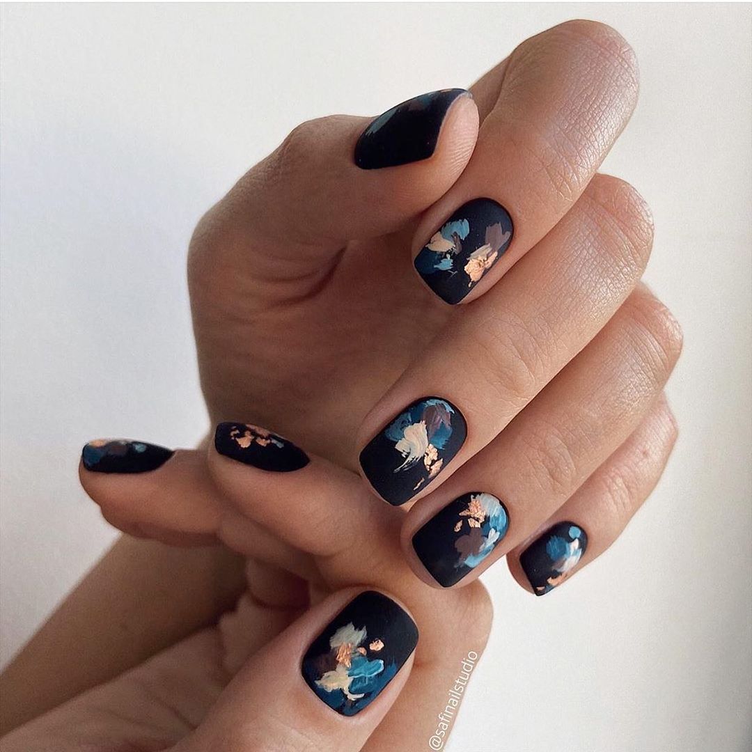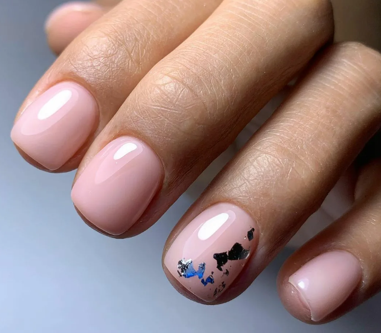 Фольга — универсальный декор. Она подходит для коротких и длинных ногтей. Кусочки фольгированного материала можно размещать на пластине хаотично. В нашем случае важно использовать маленькие кусочки, чтобы они не закрывали всю пластину целиком. Интересно смотрится маникюр, где мастер совмещает два вида дизайна — матовое покрытие на одной руке с фольгированными акцентами, а вторая рука покрывается глянцевым лаком.