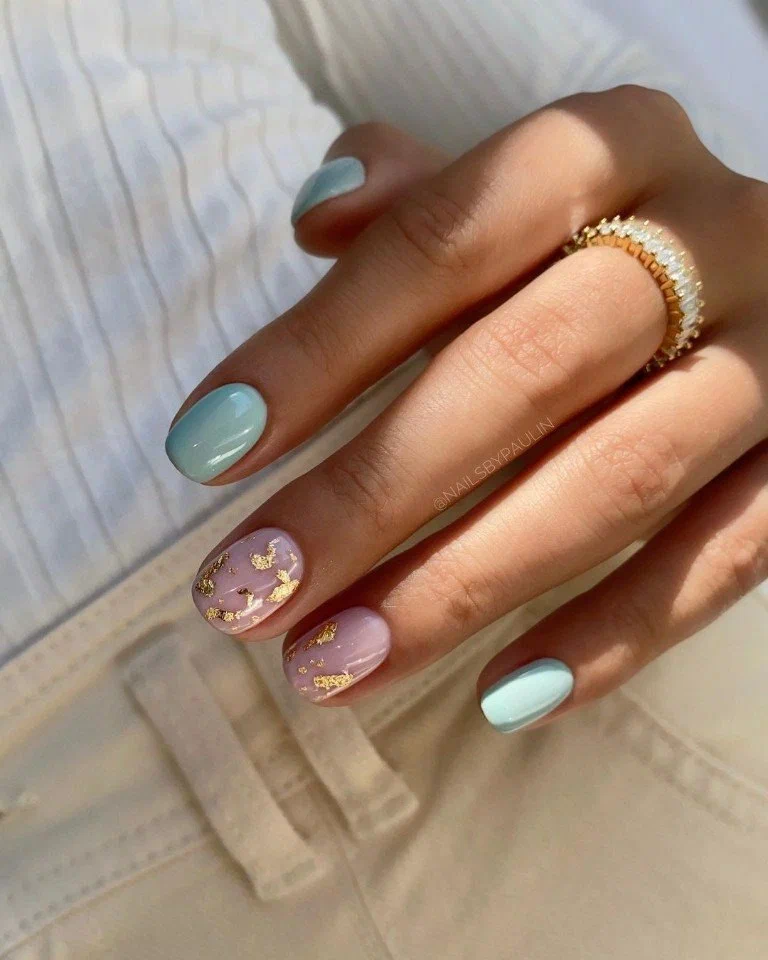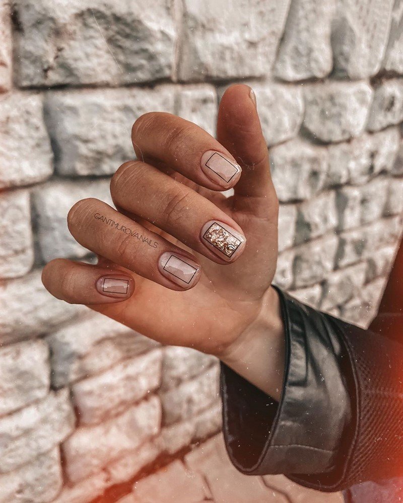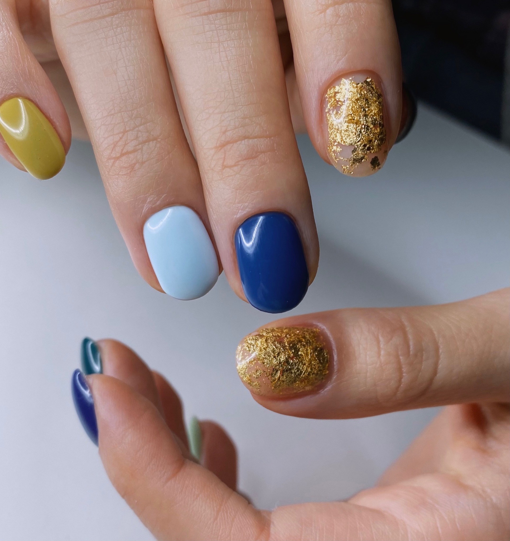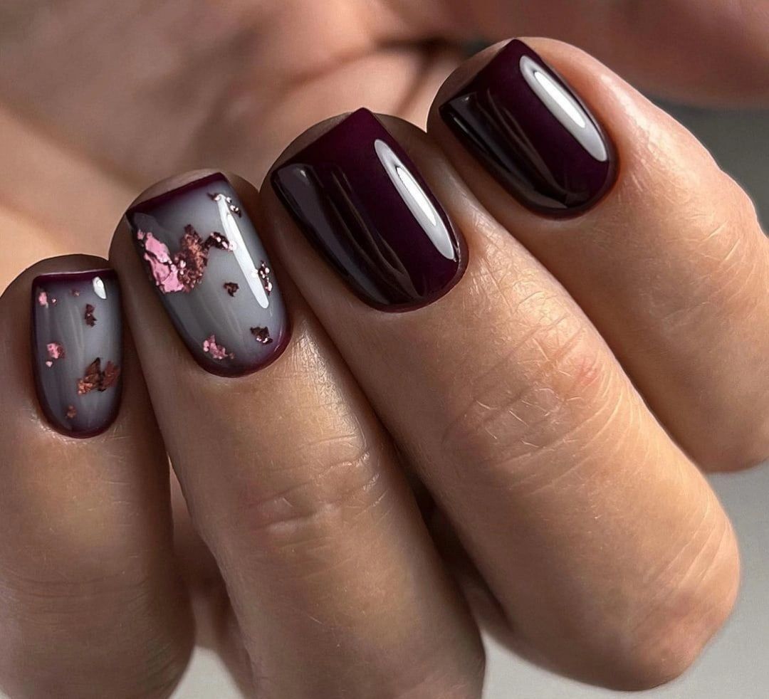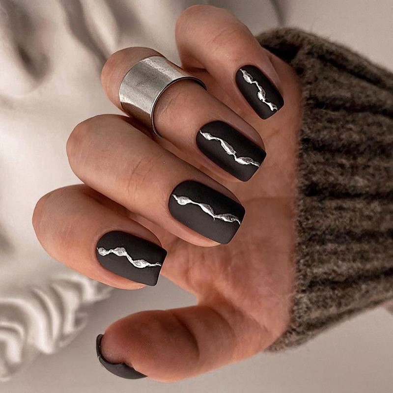 Фольга — универсальный декор. Она подходит для коротких и длинных ногтей. Кусочки фольгированного материала можно размещать на пластине хаотично. В нашем случае важно использовать маленькие кусочки, чтобы они не закрывали всю пластину целиком. Интересно смотрится маникюр, где мастер совмещает два вида дизайна — матовое покрытие на одной руке с фольгированными акцентами, а вторая рука покрывается глянцевым лаком.