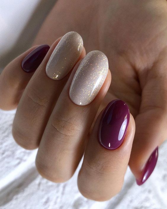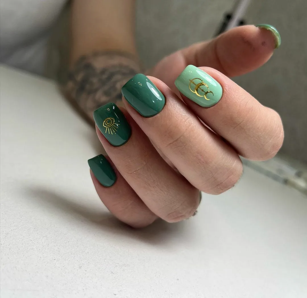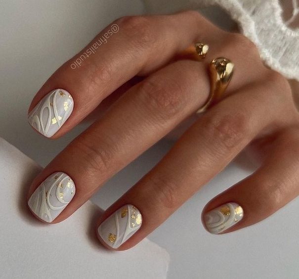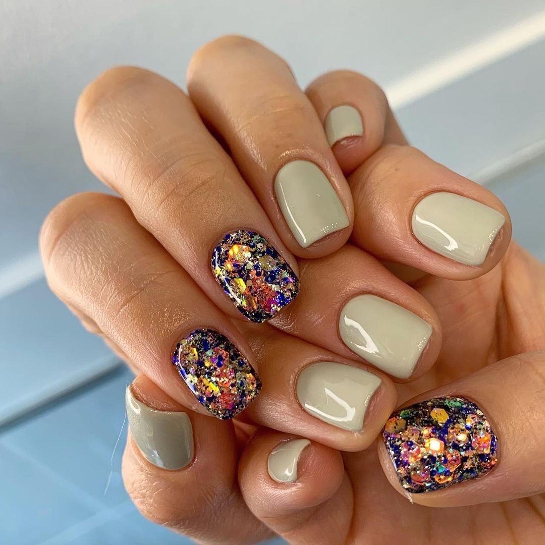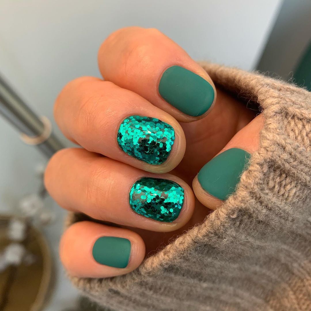 Фольга — универсальный декор. Она подходит для коротких и длинных ногтей. Кусочки фольгированного материала можно размещать на пластине хаотично. В нашем случае важно использовать маленькие кусочки, чтобы они не закрывали всю пластину целиком. Интересно смотрится маникюр, где мастер совмещает два вида дизайна — матовое покрытие на одной руке с фольгированными акцентами, а вторая рука покрывается глянцевым лаком.