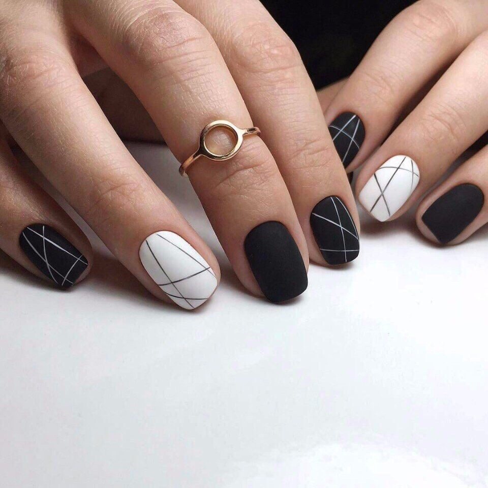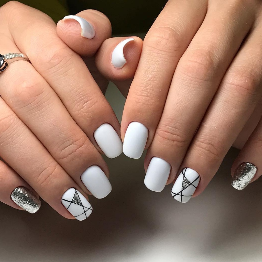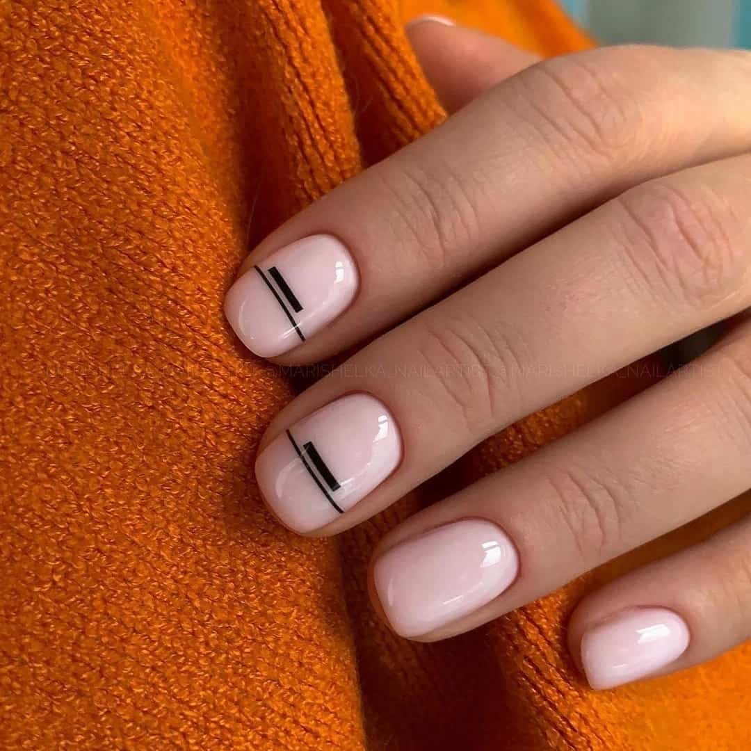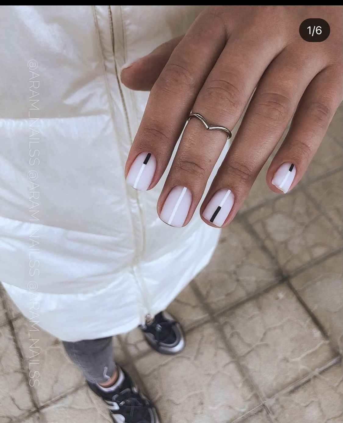 - геометрия. Этот вариант дизайна давно и прочно вошел в моду. Но для короткой длины он имеет свои особенности. Откажитесь от горизонтальных полос, отдав предпочтение вертикальным. Они визуально вытянут пластину и сделают пальцы более изящными. Кроме того, обратите внимание и на толщину линий. Они должны быть максимально тонкими;