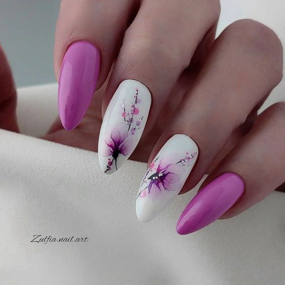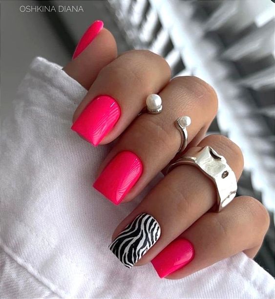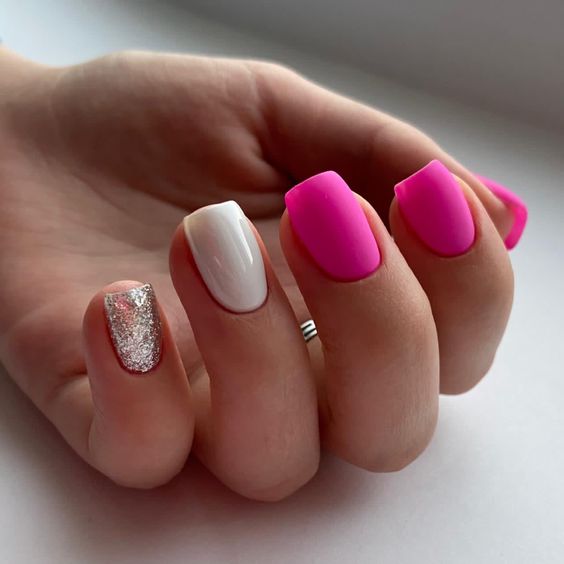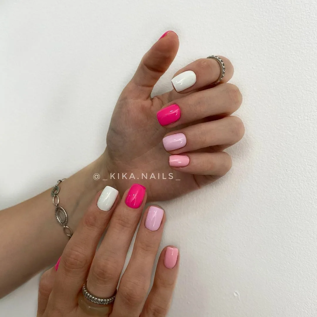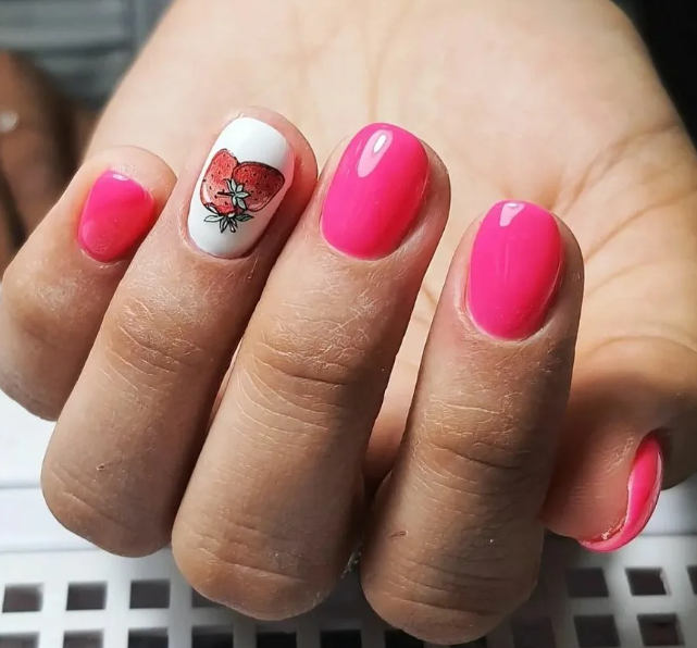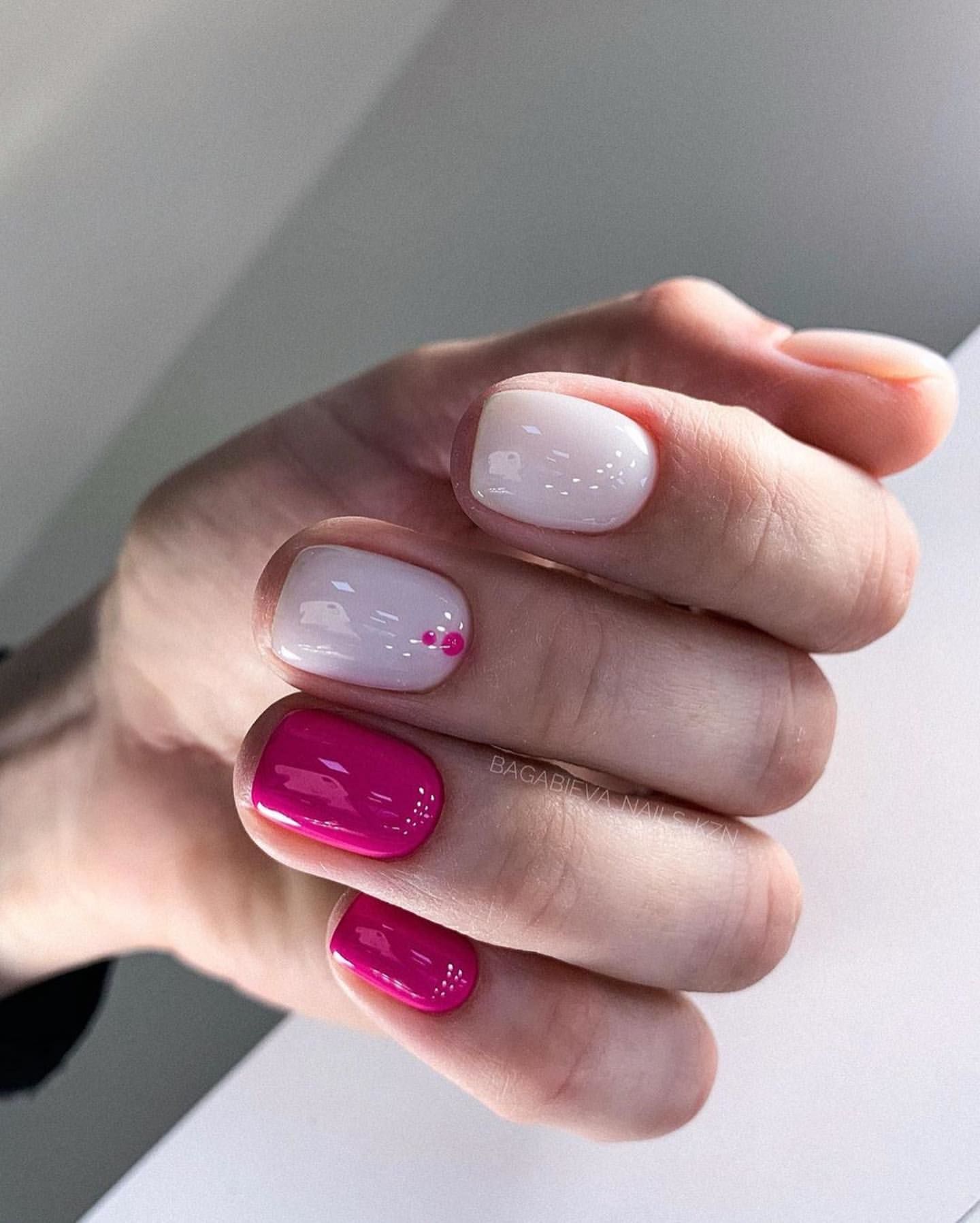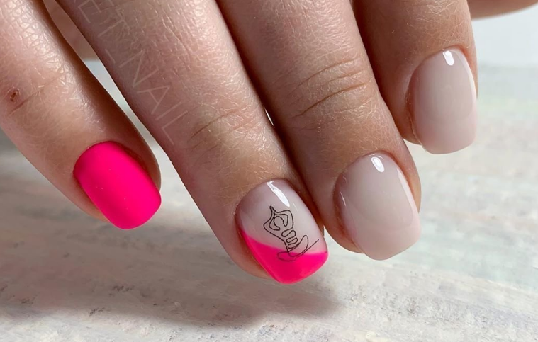 Совет: напомним, что главным оттенком года признан viva magenta. Это цвет красной палитры. Его можно охарактеризовать как насыщенный малиновый. И он очень удачно подходит для коротких ноготков как для моно маникюра, так и акцентного декора. Маджента сочетается с классическим розовым, белым, черным оранжевым и др. Словом, с ним можно создавать самые смелые миксы и сочетания. В том числе в технике омбре.