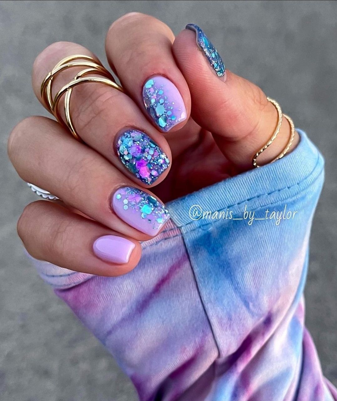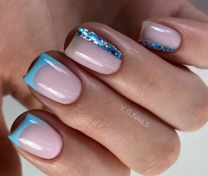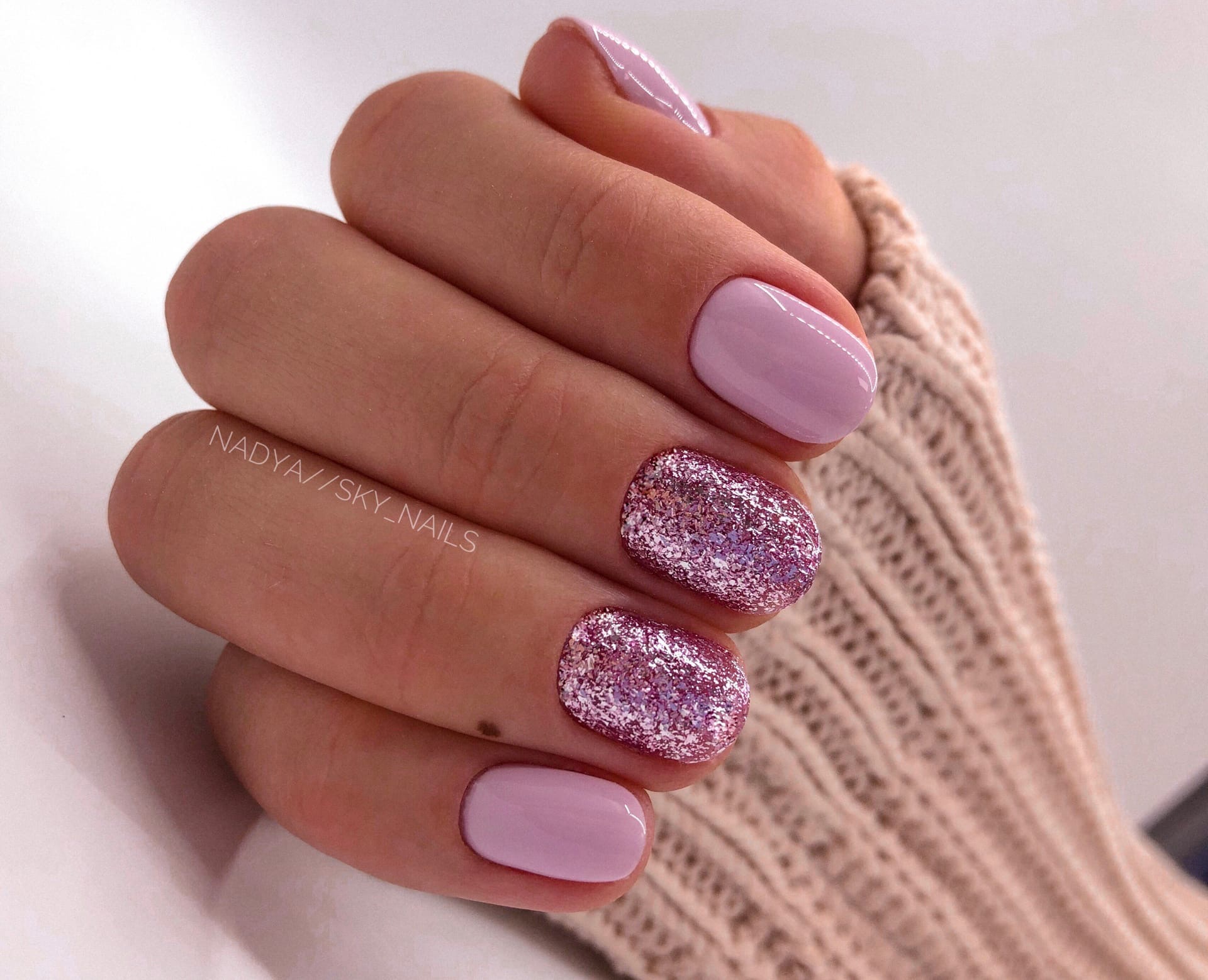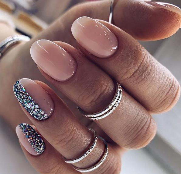 Придать немного блеска ноготкам можно с помощью ярких блесток. Мастера нейл-арта рекомендуют выделять таким образом один пальчик (чаще всего это мизинец). Этого достаточно для создания эффектного дизайна. Это отличный вариант, если вы планируете сделать праздничный маникюр.