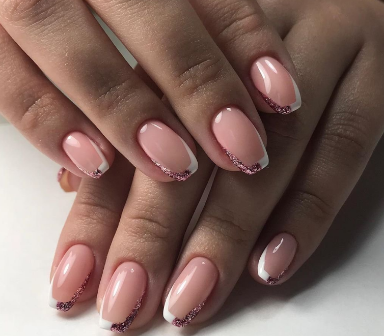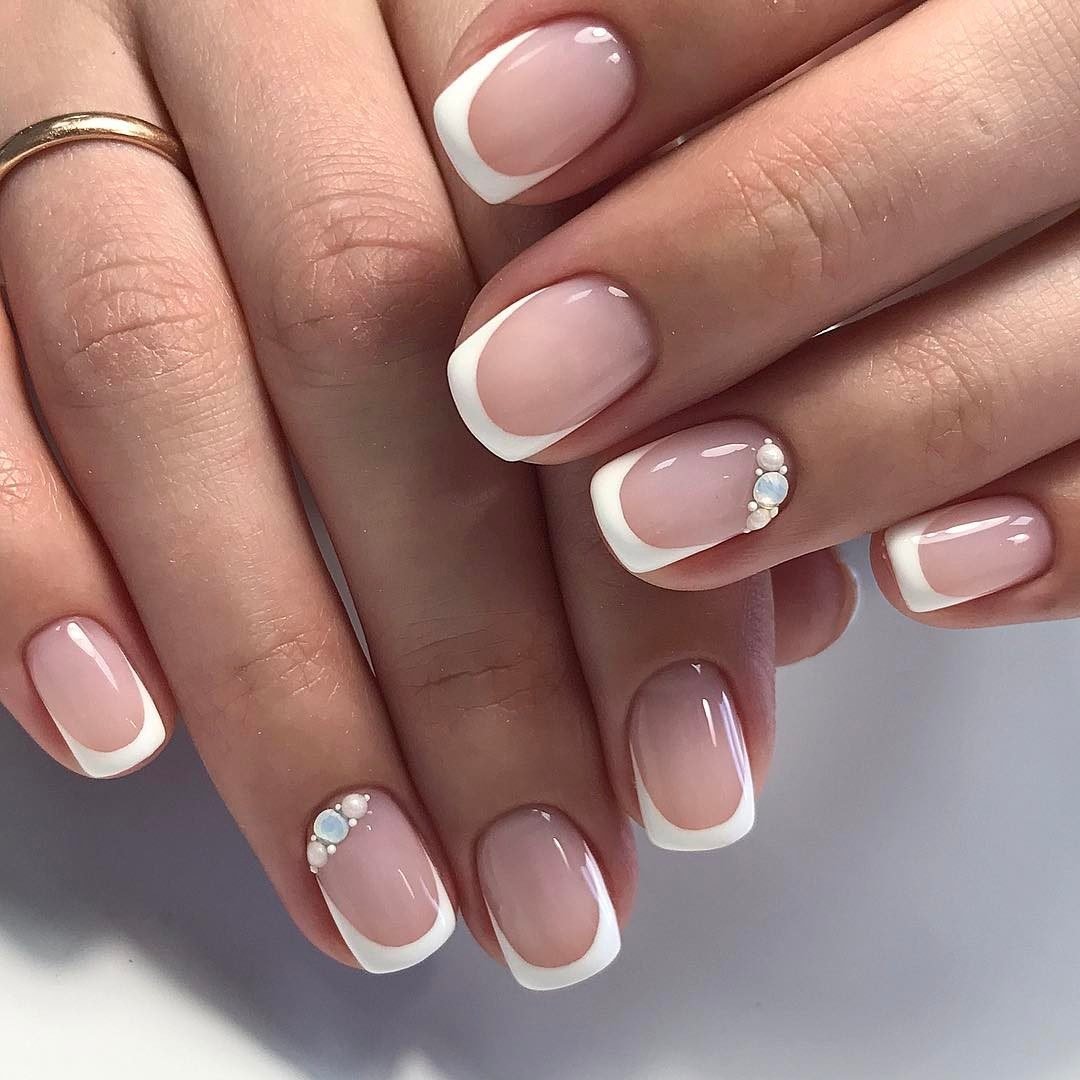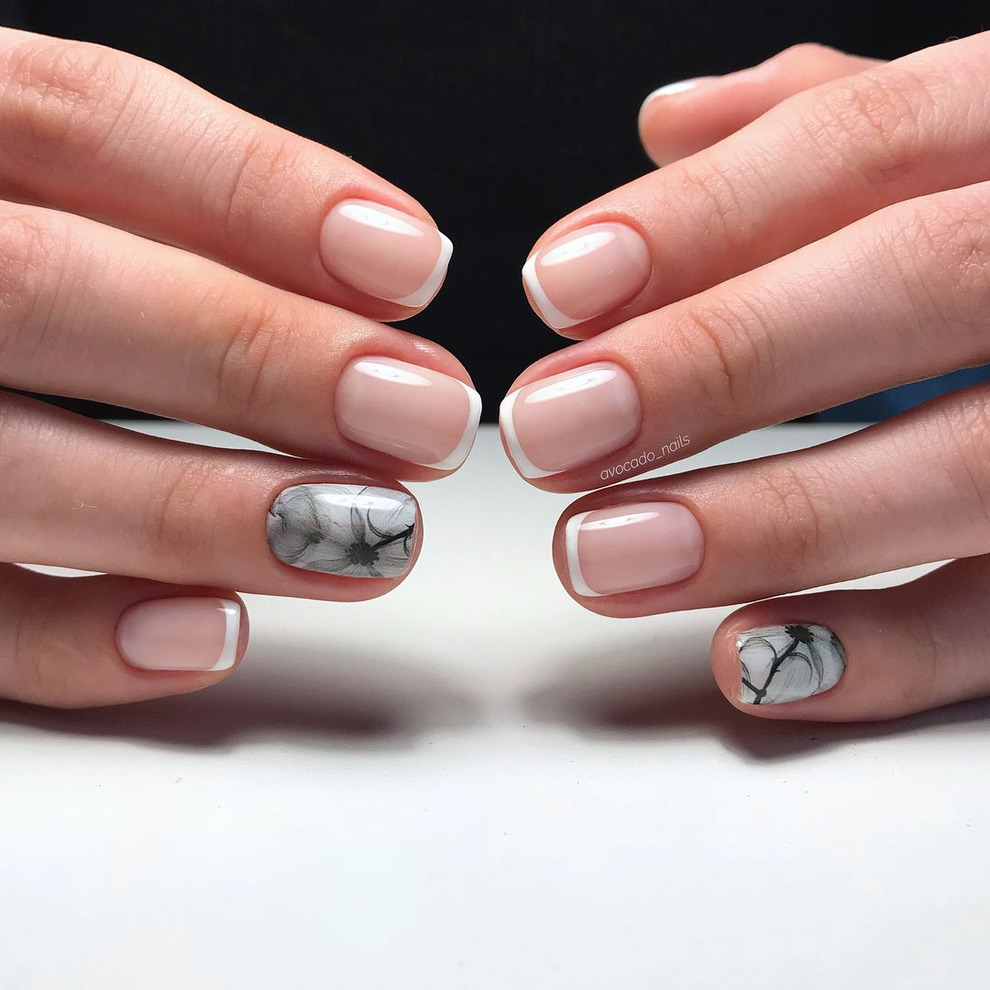- френч. Идея французского маникюра заключается в выделении свободного края пластины другим цветом. Здесь все будет зависеть от длины ногтя. Если она минимальна, френч лучше не делать. Такой маникюр будет выглядеть нелепо. Если получается сформировать край улыбки хотя бы 2-4 мм, можете смело делать френч. Но цвет улыбки стоит оставить классическим или светлым;