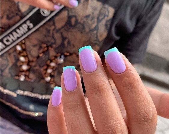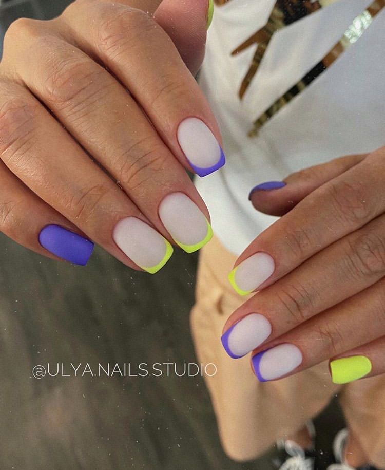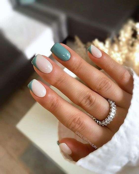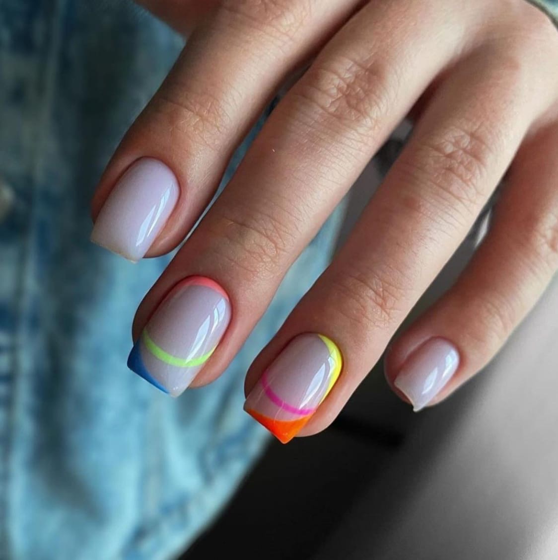 Мы уже отмечали, что французский маникюр на коротких ноготках должен выполнятся с соблюдением определенных правил. Все дело в том, что улыбку можно оформить не только на отросшем кончике пластины, но и на ней самой. Главное условие — ее ширина должны быть таковой, чтобы не возникало эффекта расширения пластины. В этом сезоне как никогда актуален цветной френч, но делать его стоит не на цветной, а молочной базе.