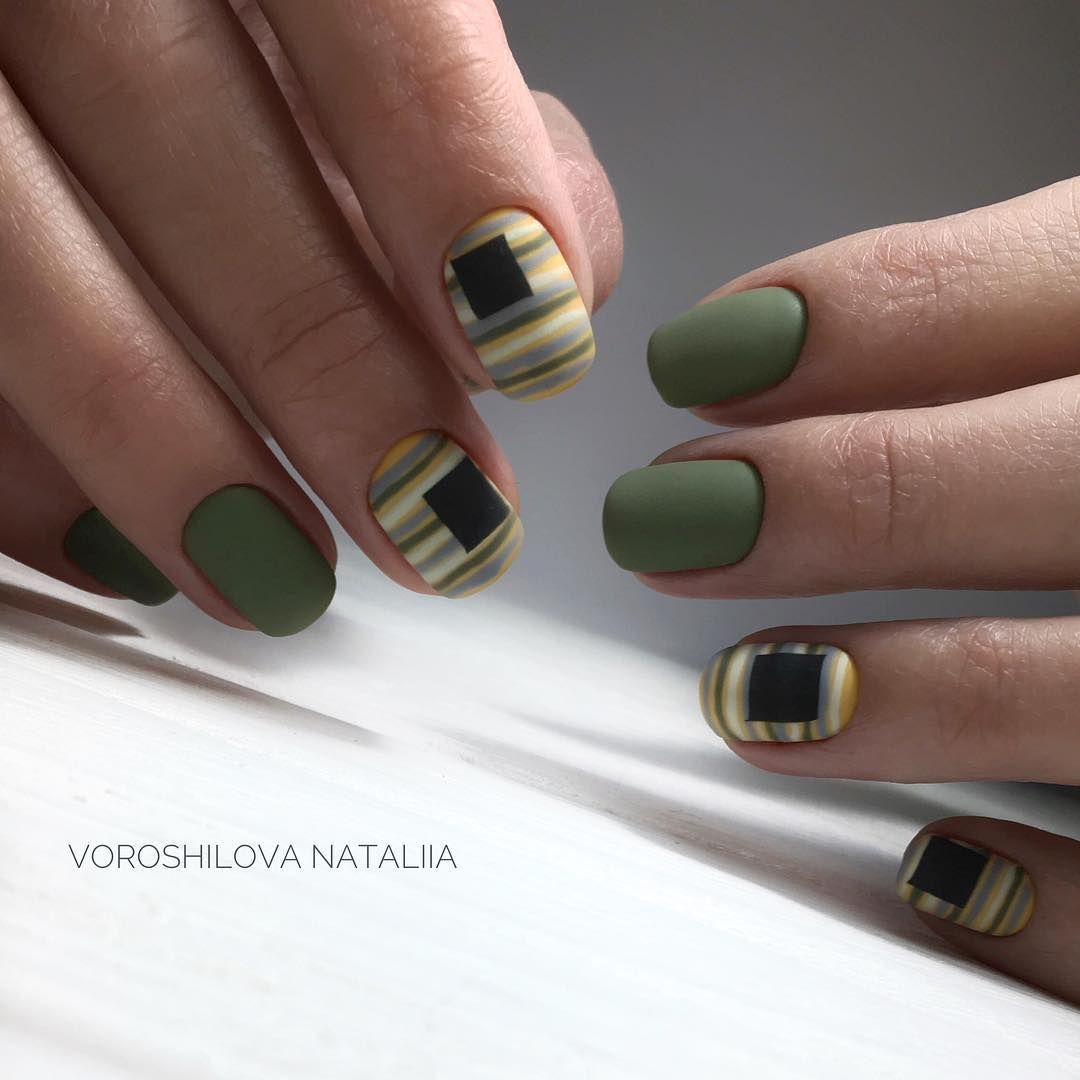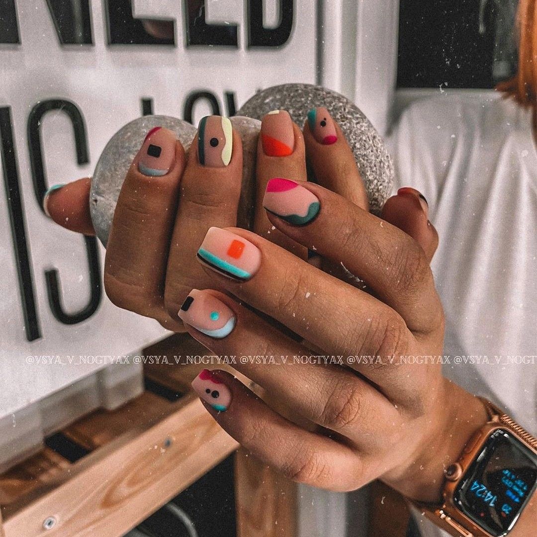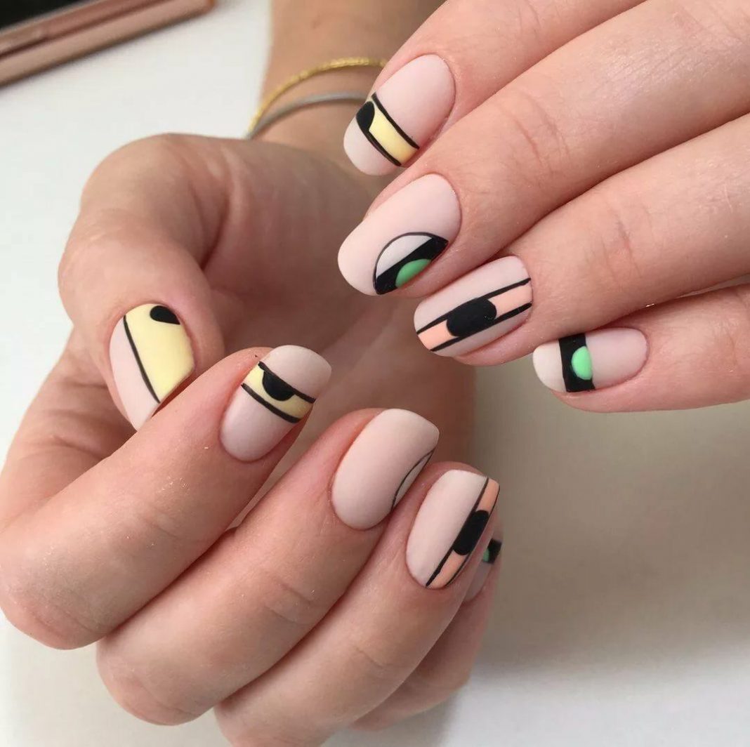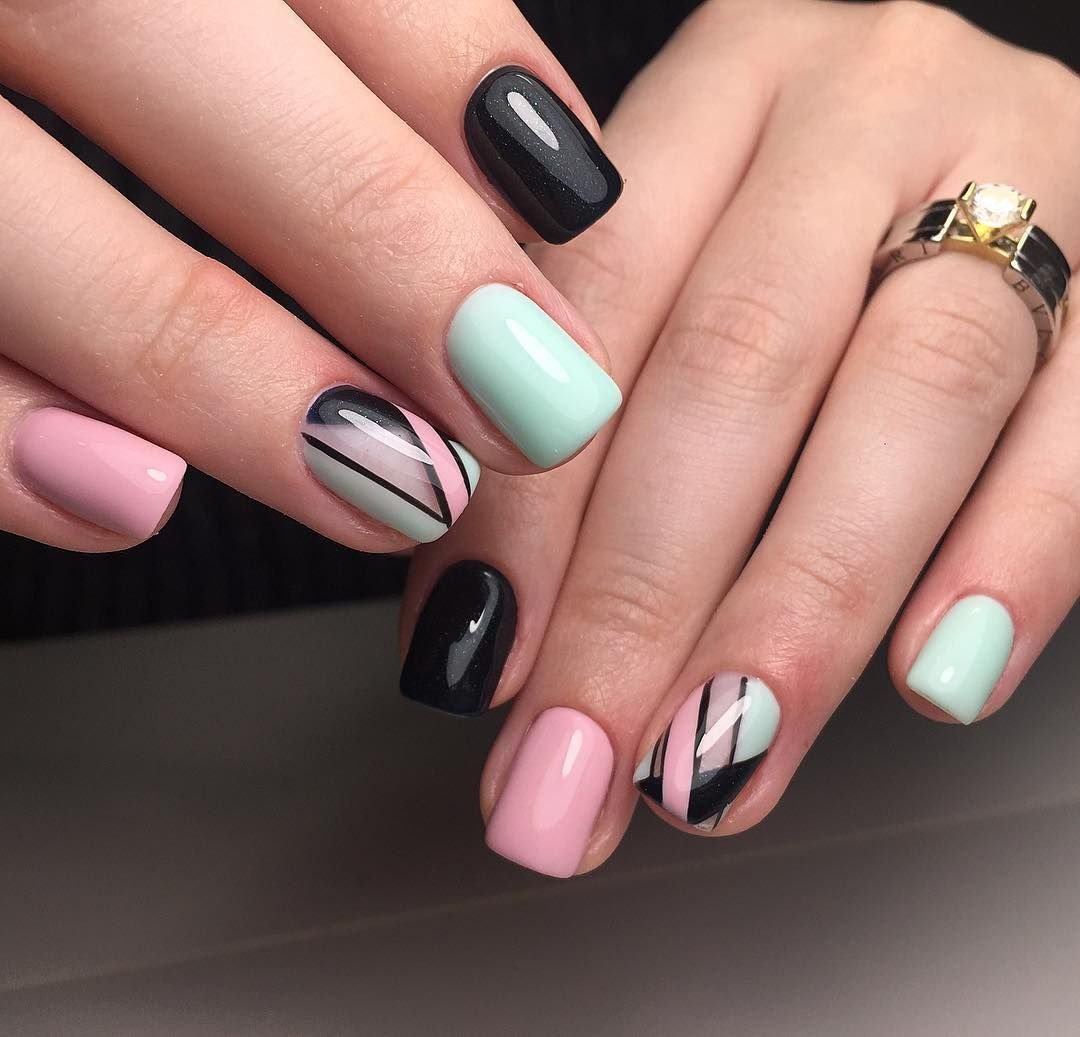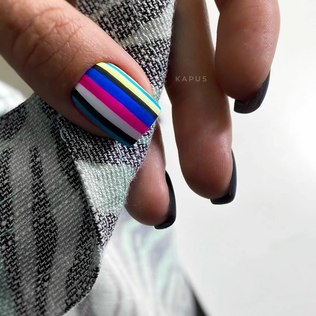 Геометрический дизайн — это стильно и современно. Но для короткой длины подобрать правильный рисунок, наверное, сможет только мастер. Если планируете сделать его дома, обратите внимание на вертикальные полоски. Они вытянут пластину и сделают пальцы более изящными. Полоски могут быть монохромными или разноцветными.