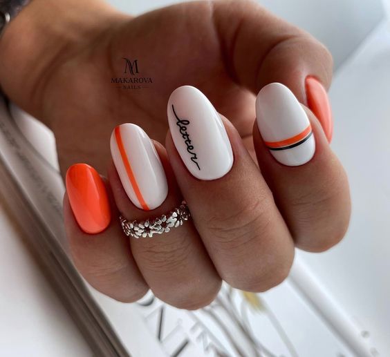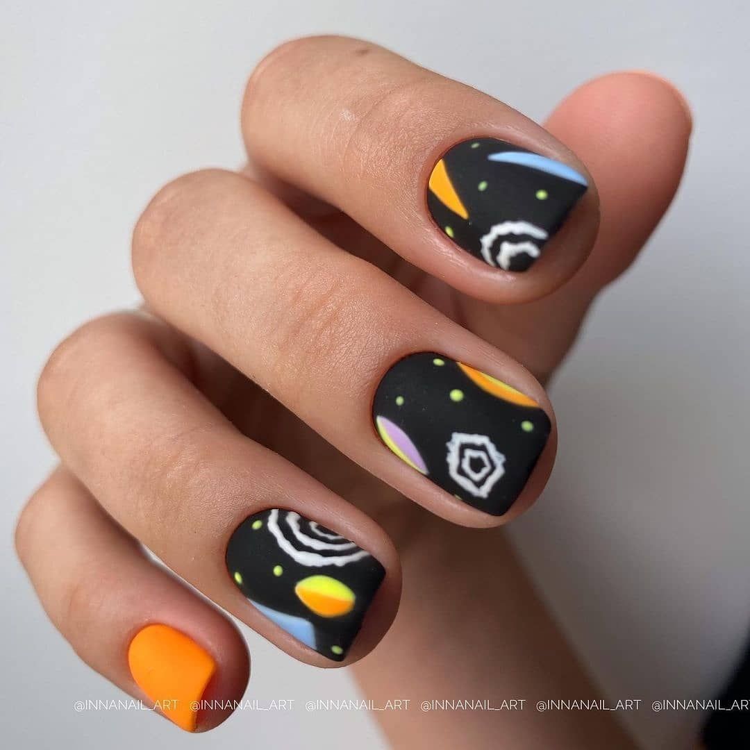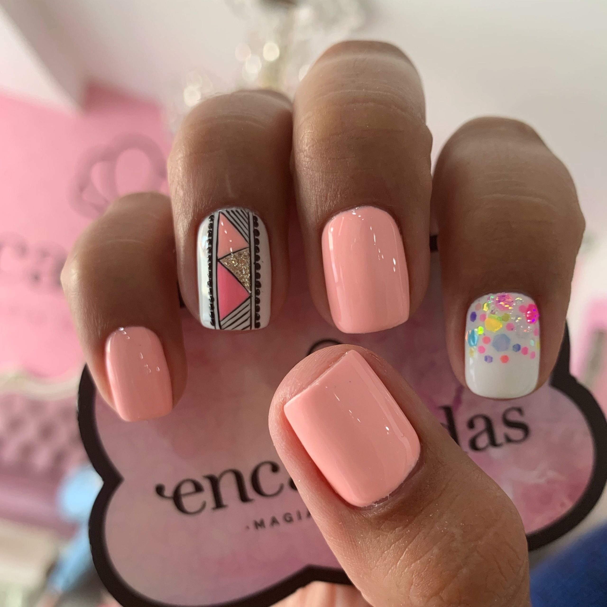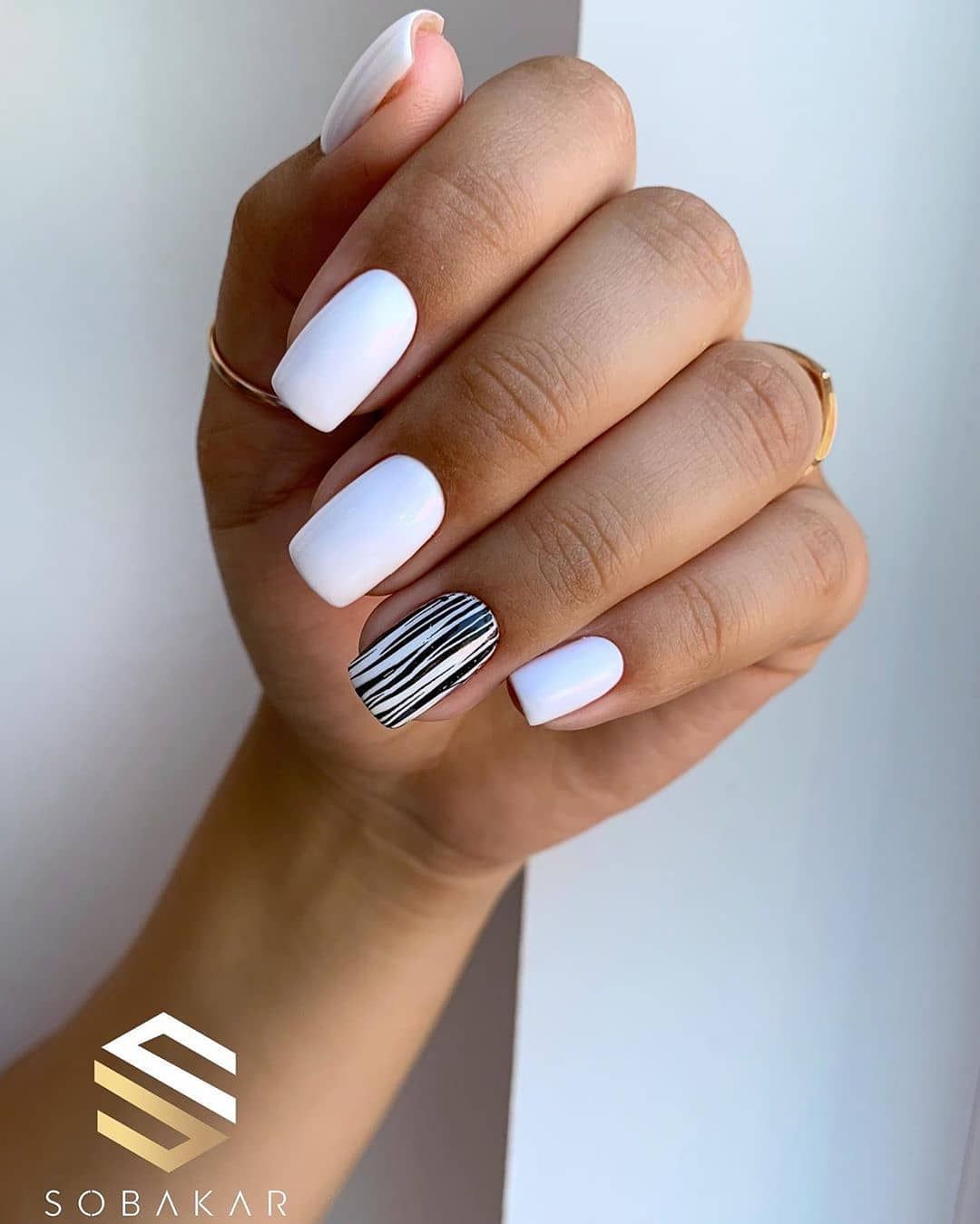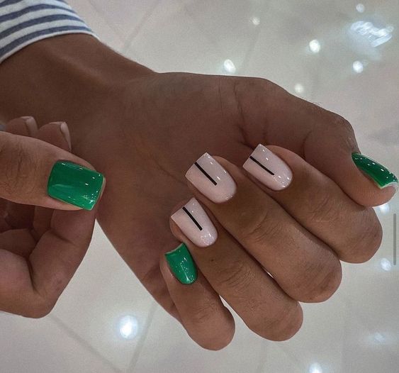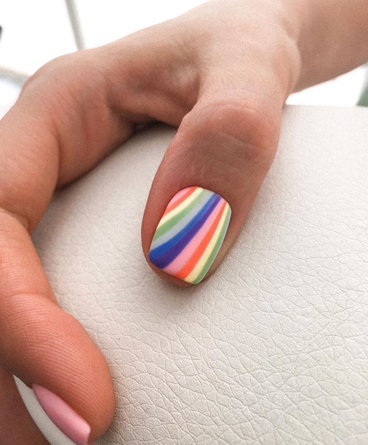 Геометрический дизайн — это стильно и современно. Но для короткой длины подобрать правильный рисунок, наверное, сможет только мастер. Если планируете сделать его дома, обратите внимание на вертикальные полоски. Они вытянут пластину и сделают пальцы более изящными. Полоски могут быть монохромными или разноцветными.