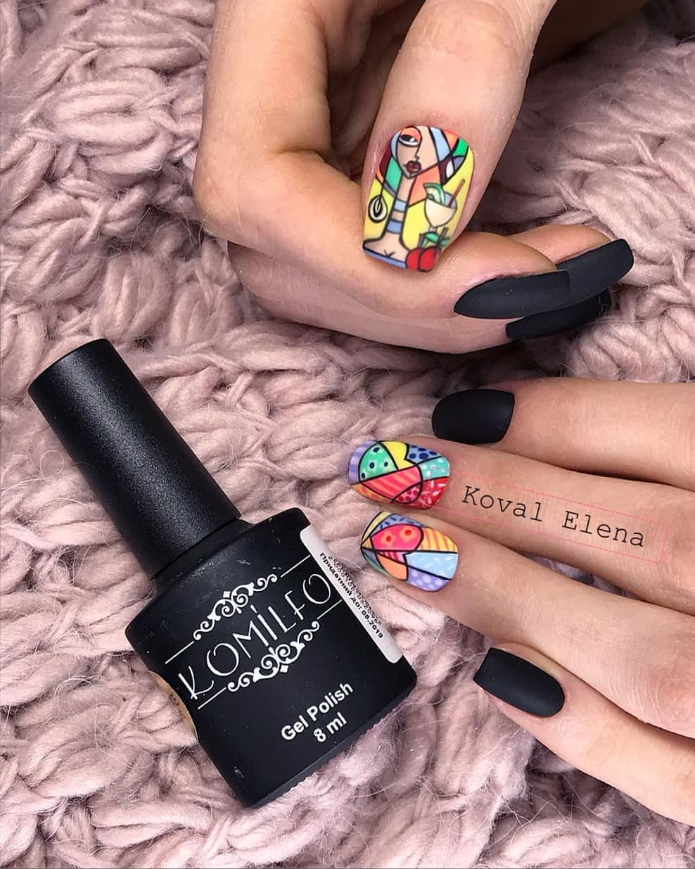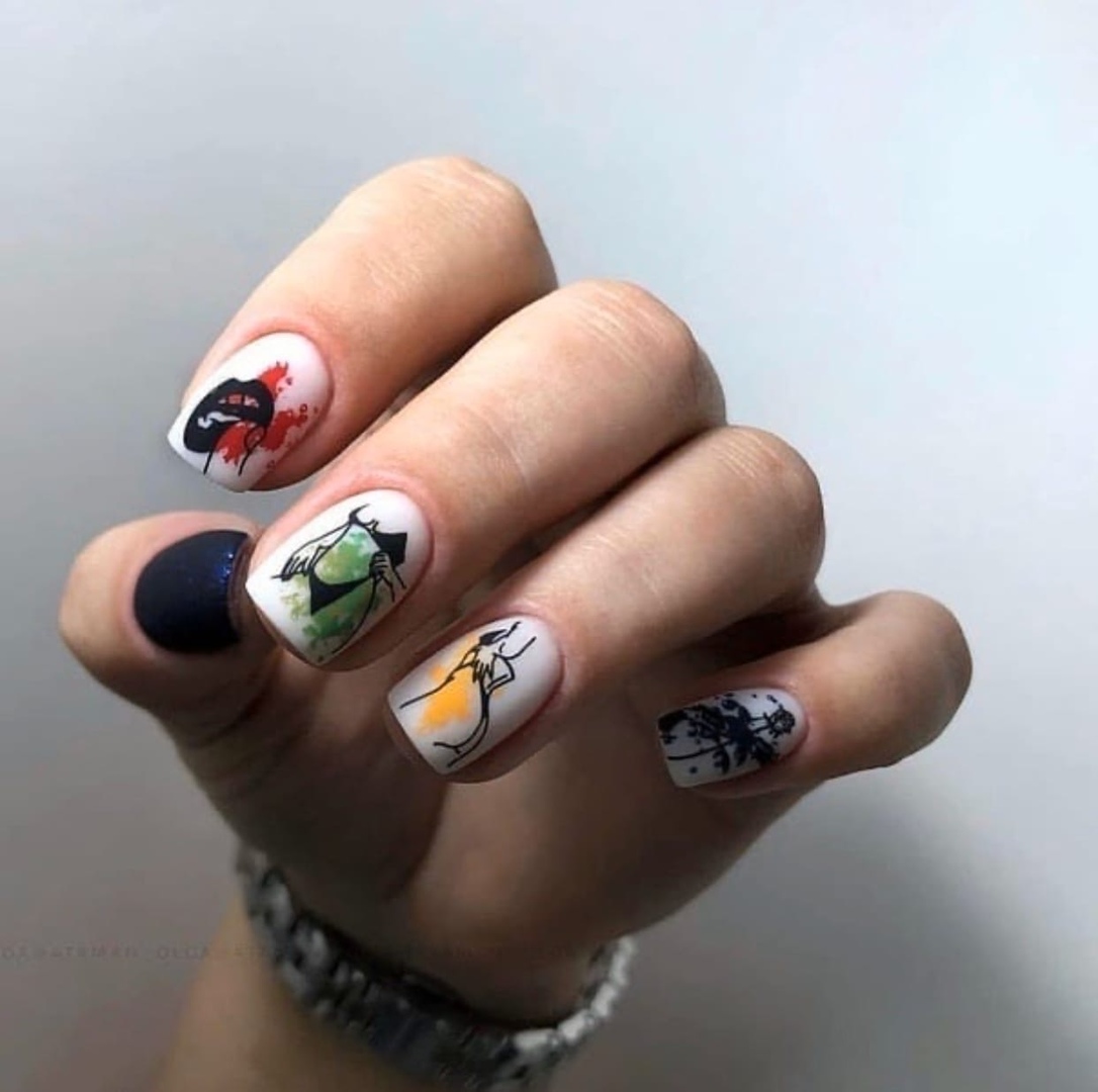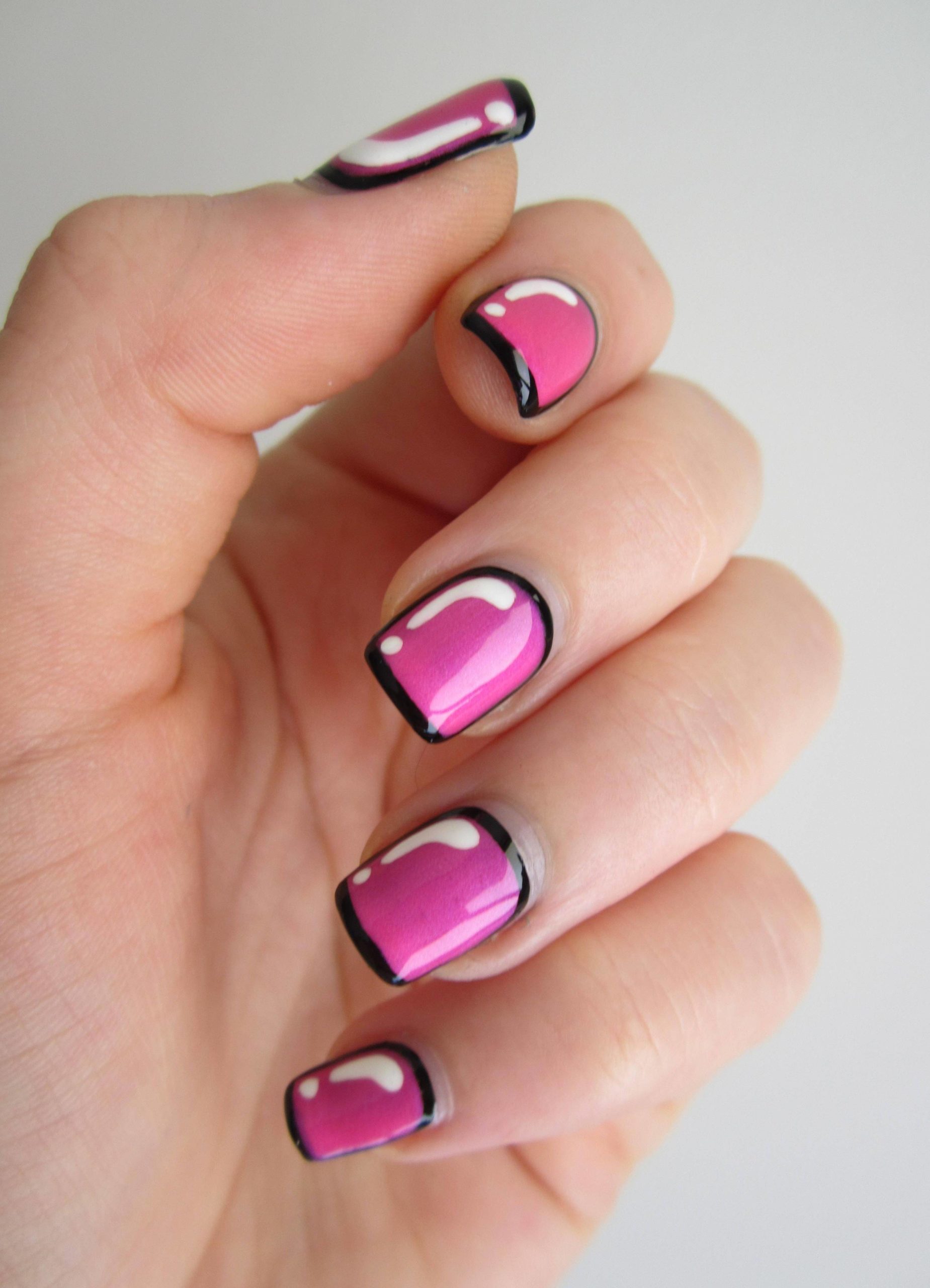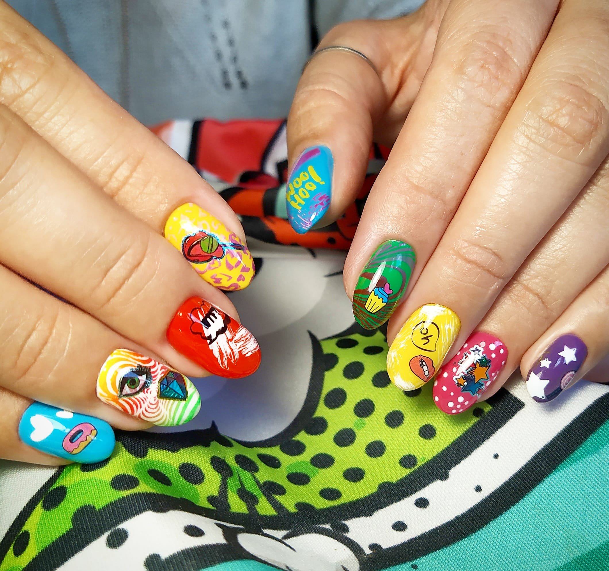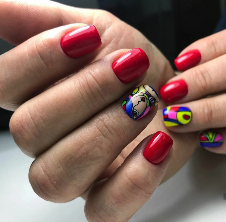 Если вам надоела однотипность, обратите внимание на маникюр в стиле поп-арт. Стоит отметить, что молодое поколение уже успело полюбить этот вариант дизайна и с удовольствием оформляет свои ноготки в этом стиле. В чем особенность pop-art? Это буйство красок, яркие принты, портреты и коллажи со звездами, комиксы и др. Интересно, что такой коллаж в ярком цвете отлично смотрится и на короткой длине.