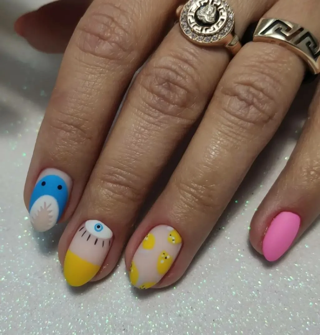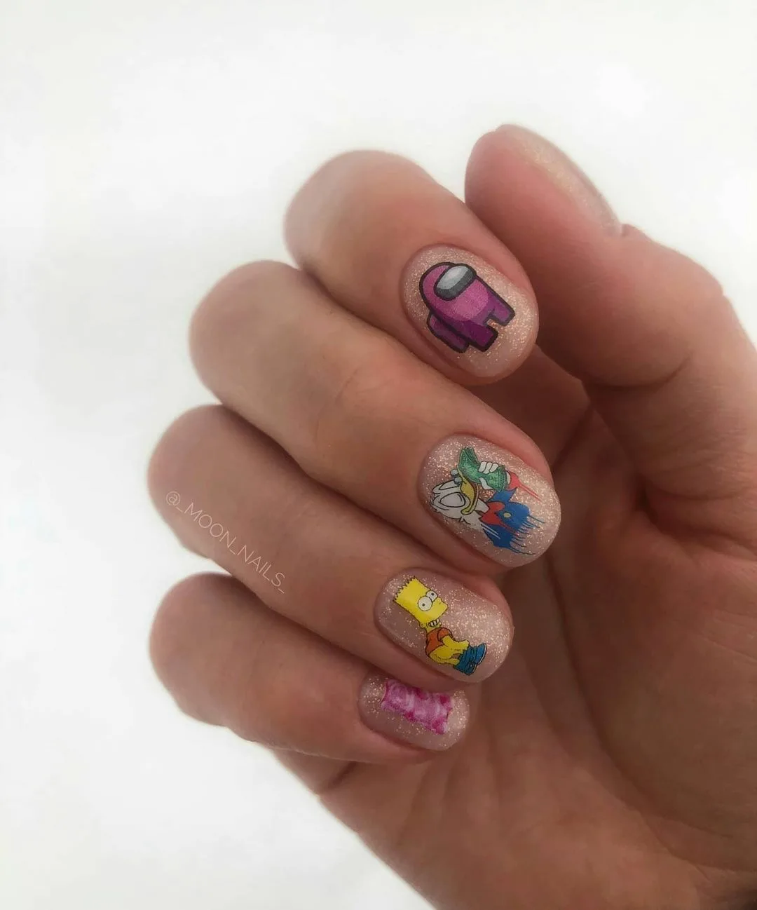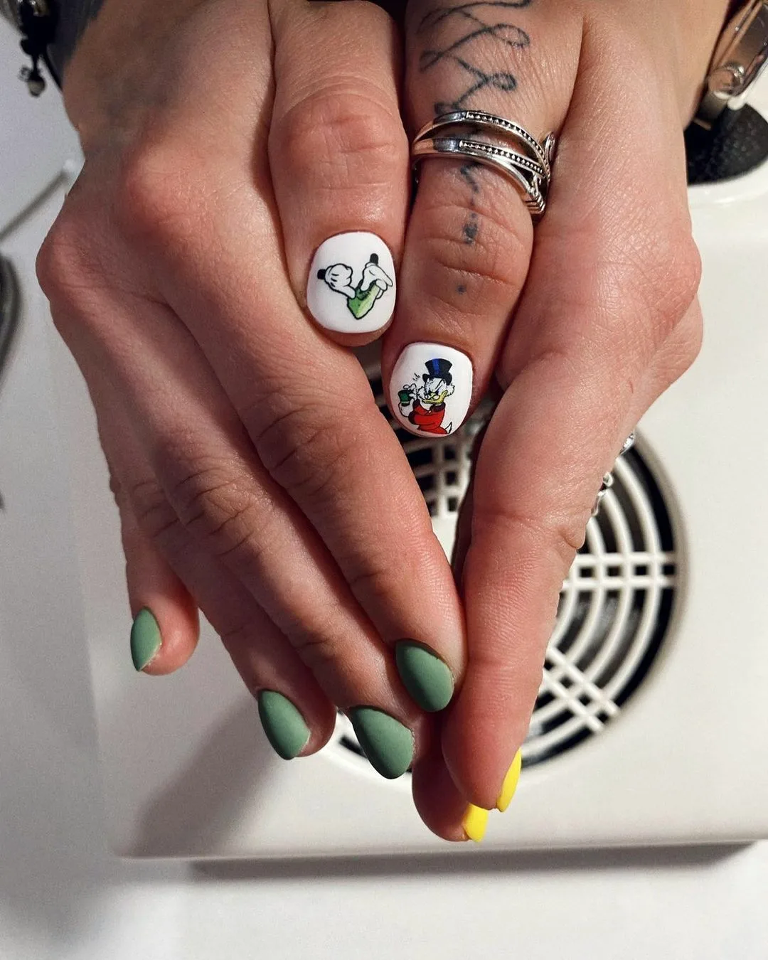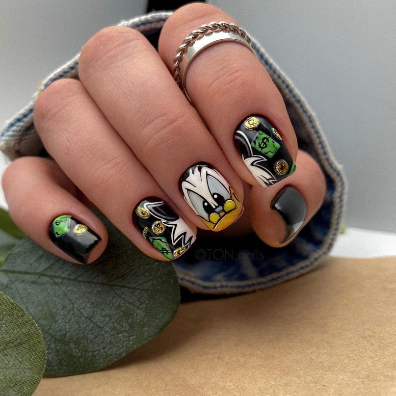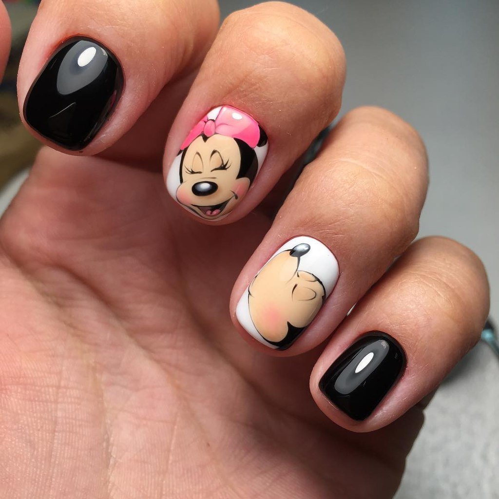 На короткой длине отлично смотрятся рисунки мультяшных героев или игрушек. Например, стильно и эффектно выглядит маникюр с Микки Маусом или Минни.