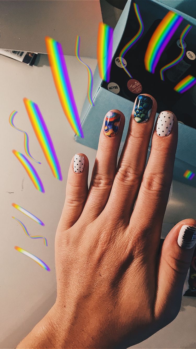 - создайте дизайн — рисунок, стразы, наклейка, растяжка цвета, фольга и др. Все то, что вы выберите для своего стильного маникюра. Не забывайте, что вы можете комбинировать техники. Даже для коротких ноготков;