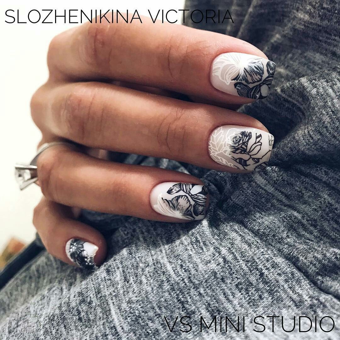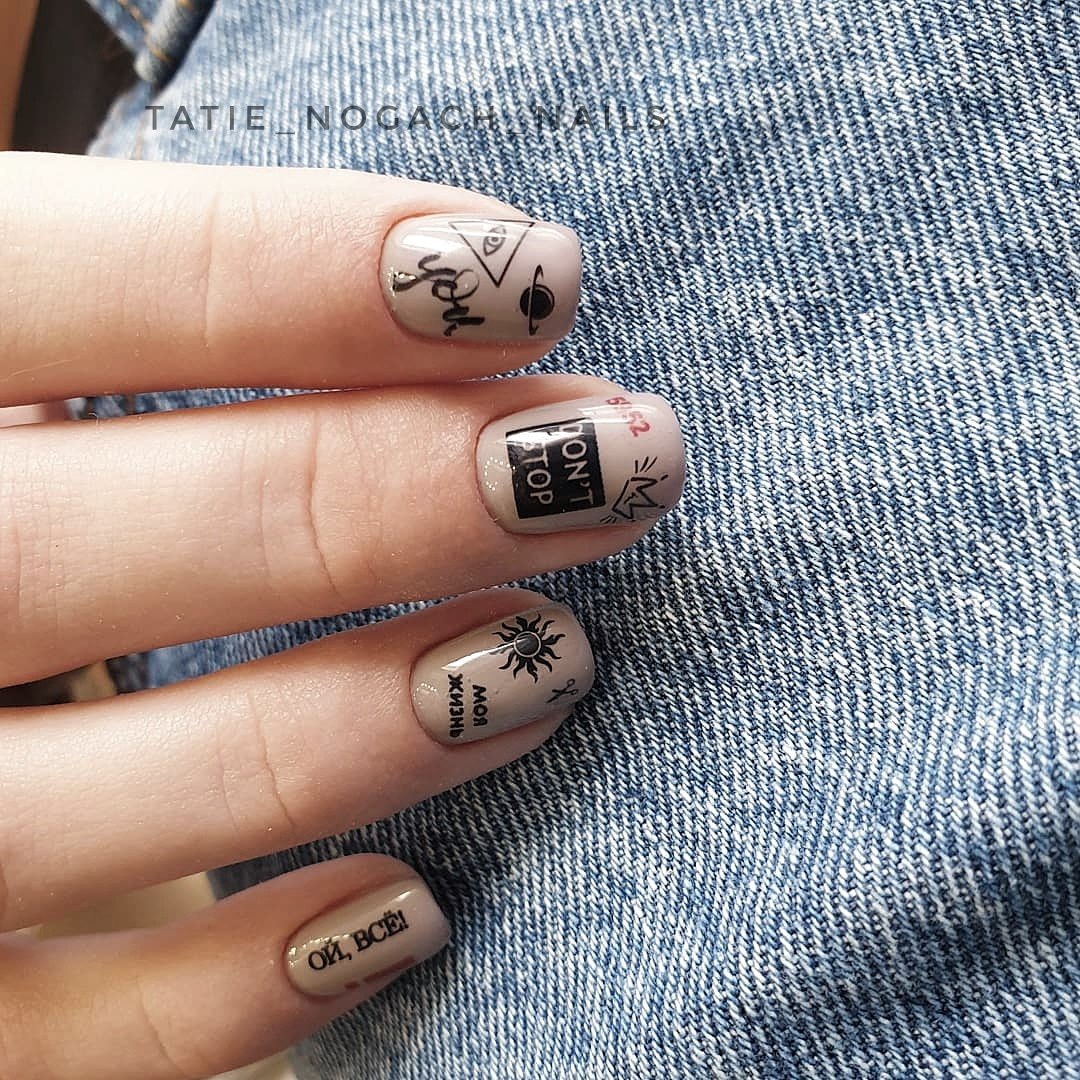 Нанести интересный рисунок можно не только с помощью кисти или наклеек, но и специальным штампом. Современные тренды предлагают сделать многослойный стемпинг. Это вариант, при котором мастер наносит слои стемпинга послойно, покрывая каждый из них базой — молочной, нюдовой и др.