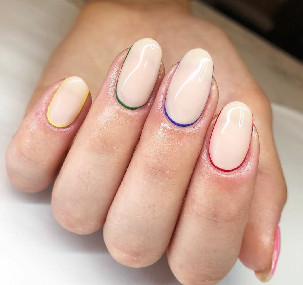 И еще один вариант — контурный или маникюр с окантовкой. Это дизайн ногтей, при котором мастер создает контур ноготка с помощью тонкой линии, камифубуки минимального размера, страз или рисунка.