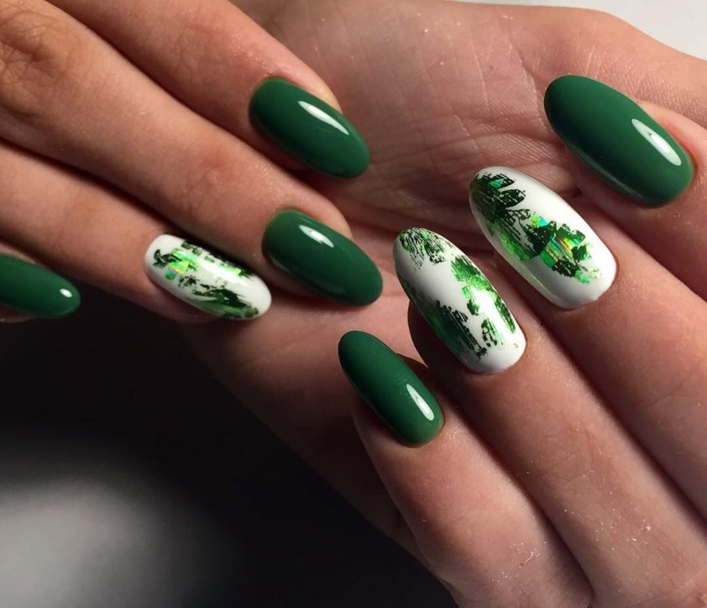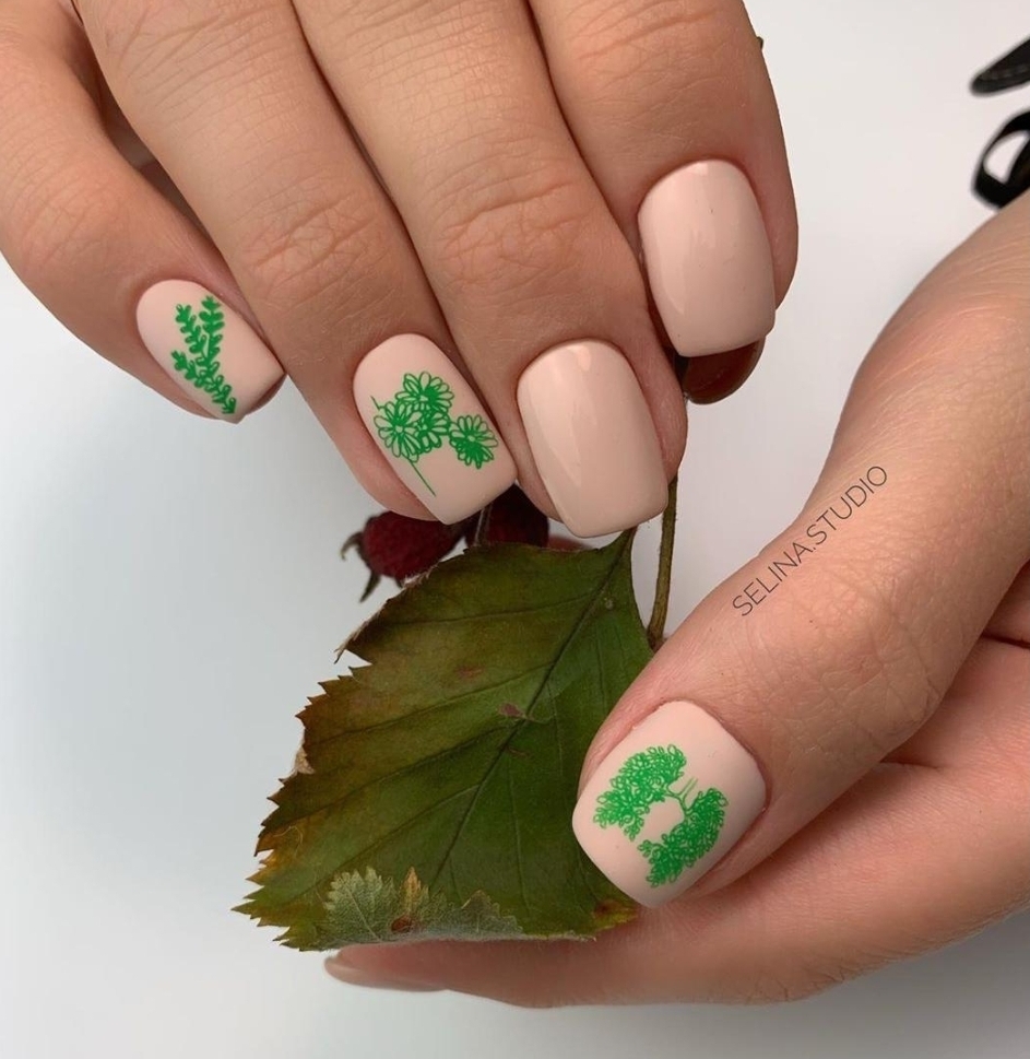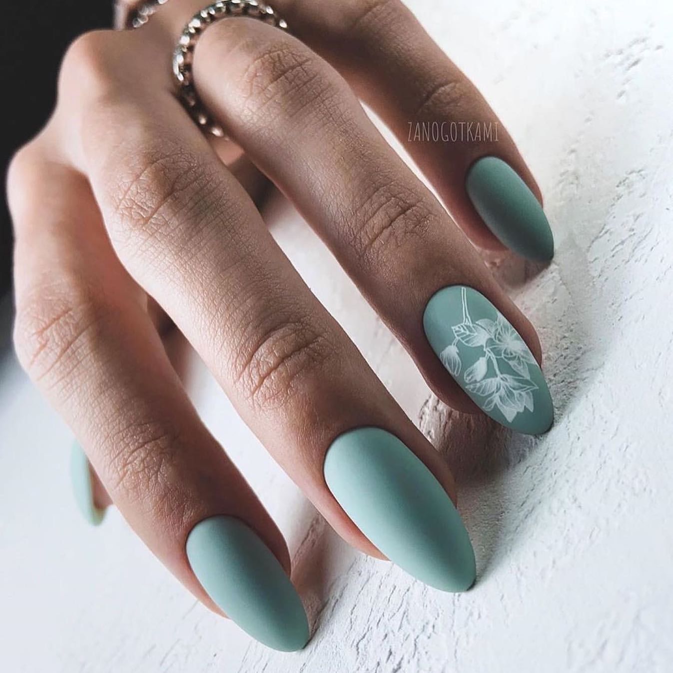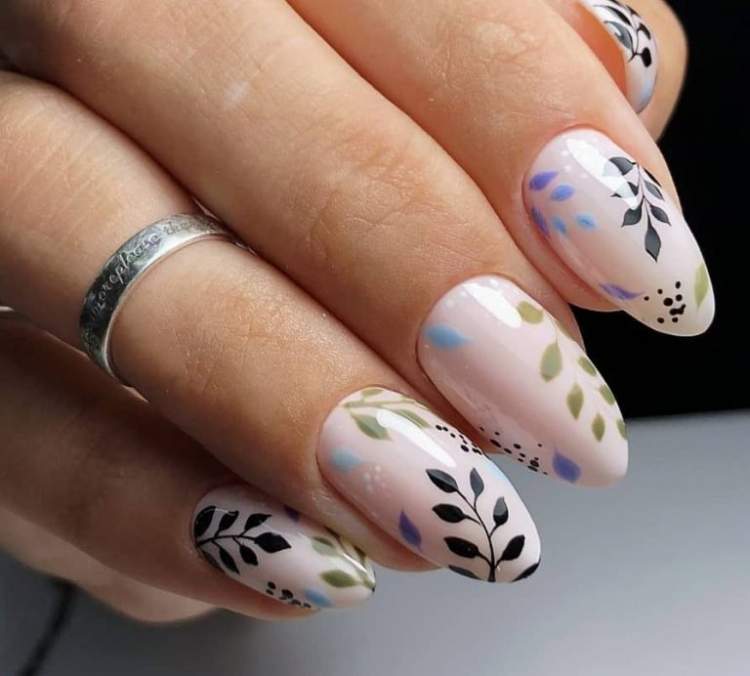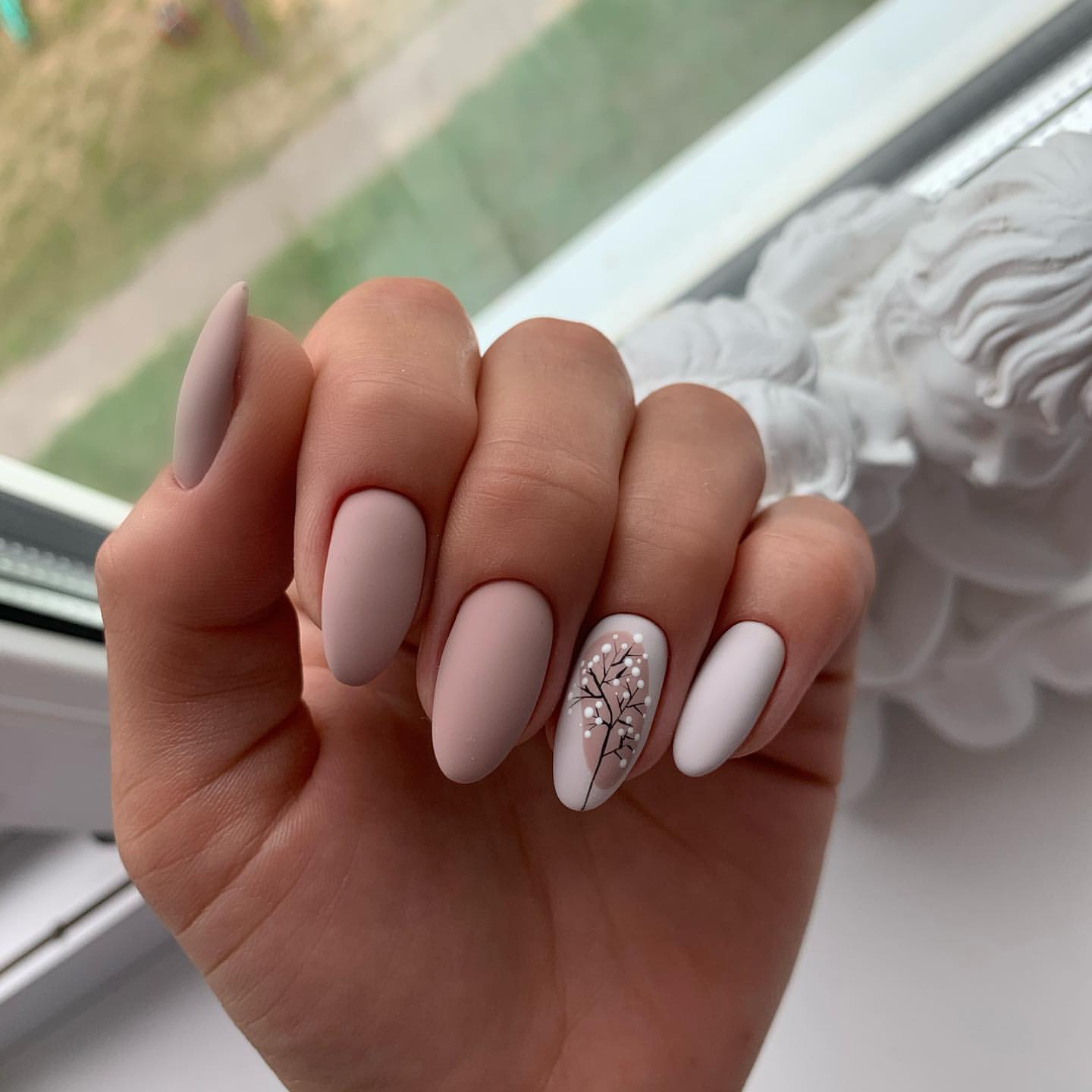 Еще одна очень удачная идея для маникюра в марте — рисунок листьев, веток и растений. Кстати, совсем не обязательно рисовать их зеленым цветом. Стильно и актуально ветки смотрятся в белом, коричневом и сером исполнении. Рекомендуем выбрать нежную базу для рисунка и дополнить дизайн ногтей в марте блестящим акцентом — фольгой или глиттером.