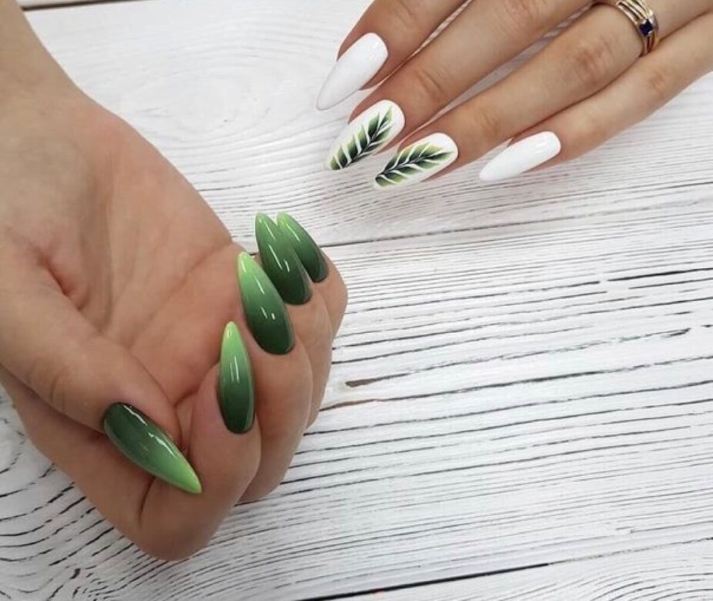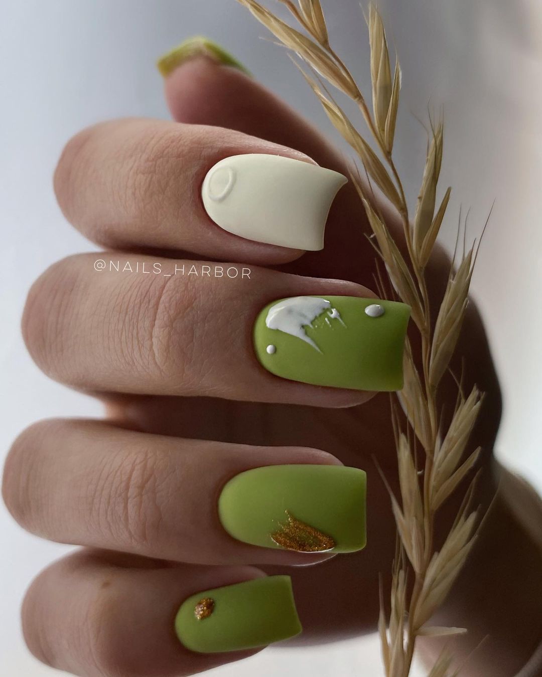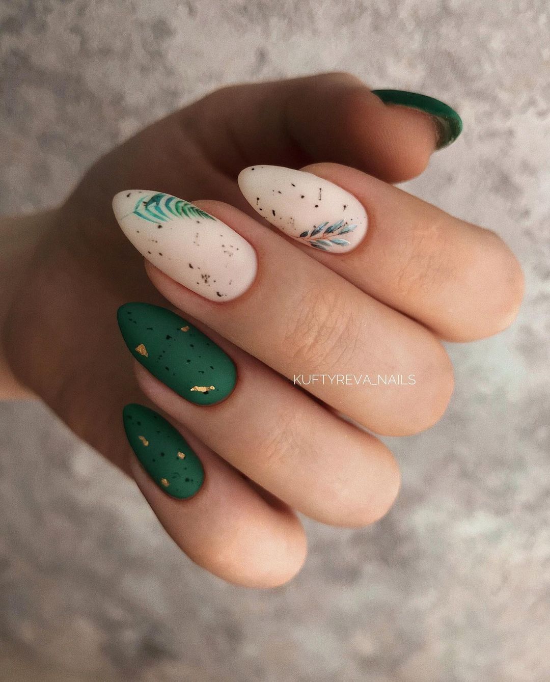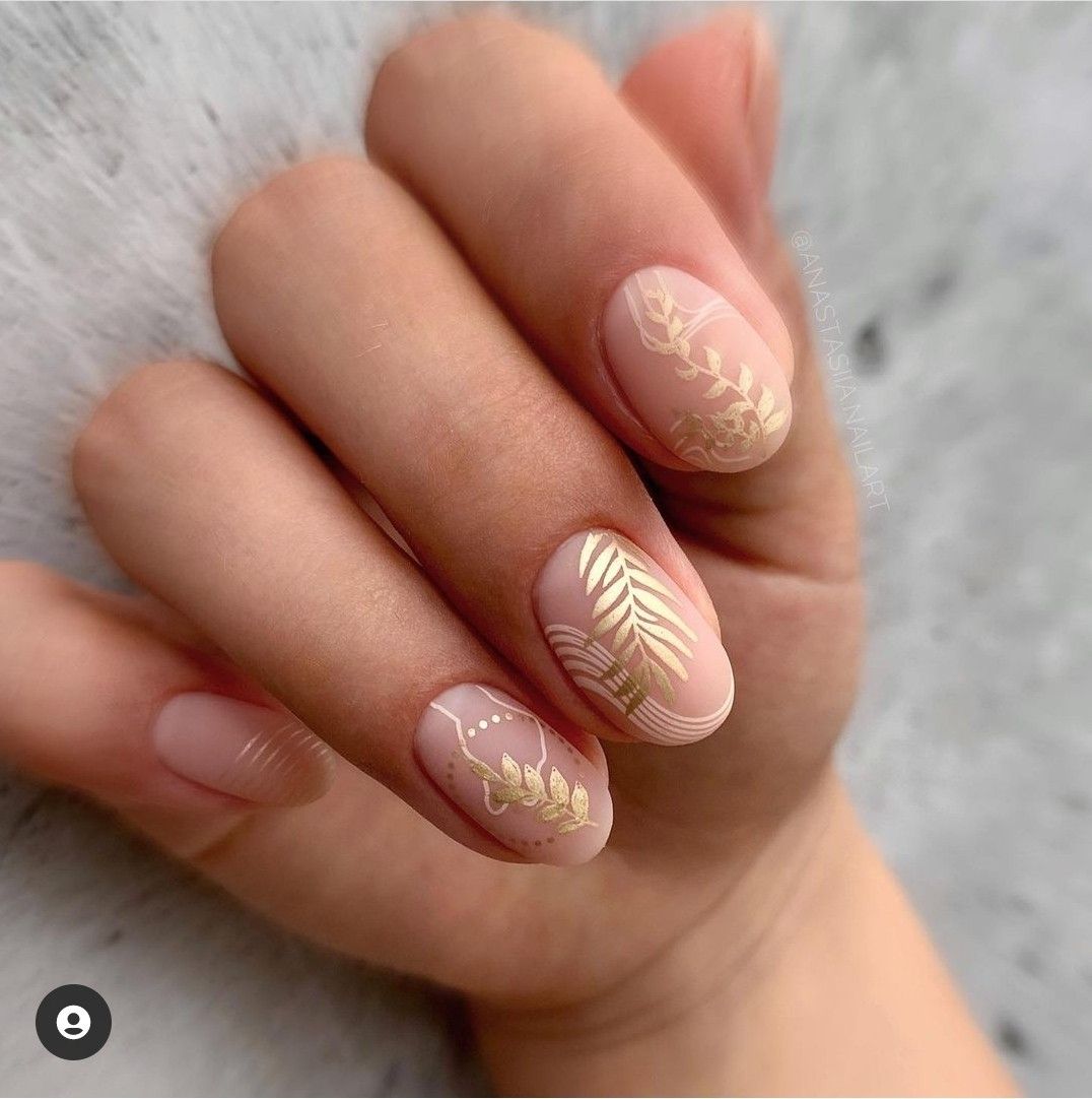Еще одна очень удачная идея для маникюра в марте — рисунок листьев, веток и растений. Кстати, совсем не обязательно рисовать их зеленым цветом. Стильно и актуально ветки смотрятся в белом, коричневом и сером исполнении. Рекомендуем выбрать нежную базу для рисунка и дополнить дизайн ногтей в марте блестящим акцентом — фольгой или глиттером.