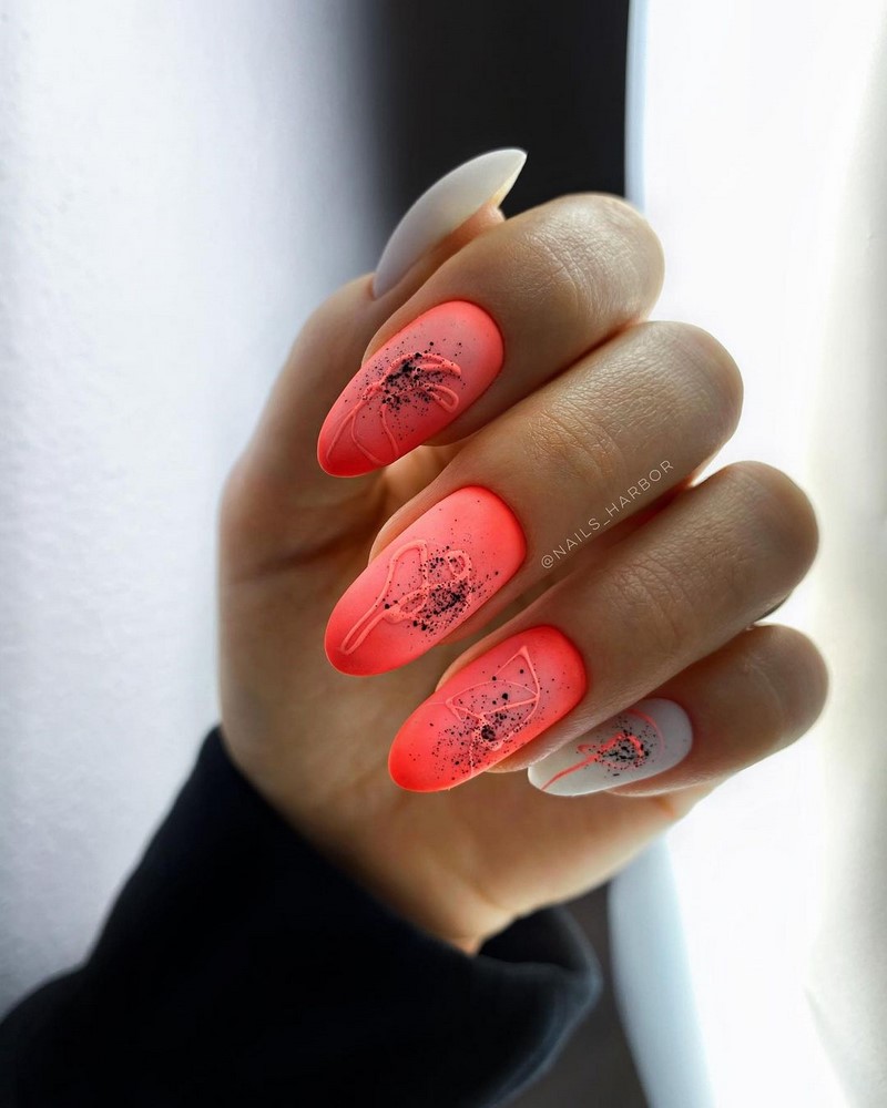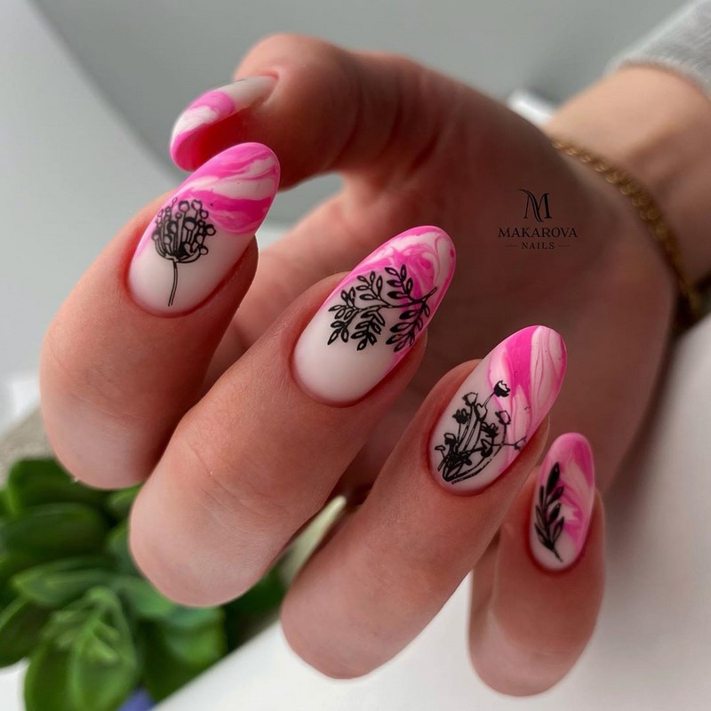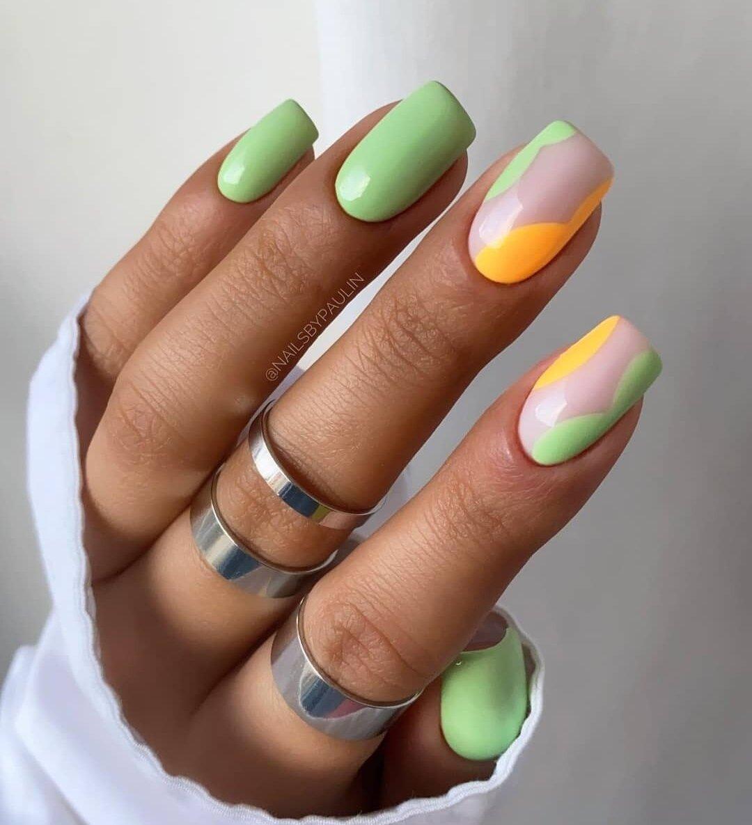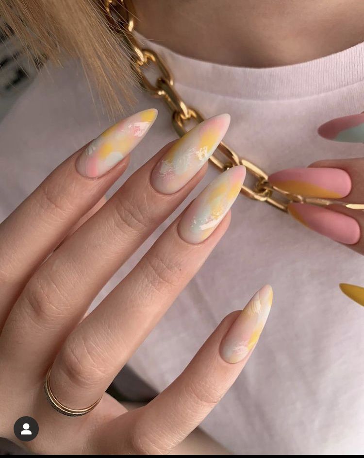 Если зимой была очень популярна геометрия, то весной в лидерах абстрактные рисунки. Никаких четких линий — ведь идет смена сезонов, когда лед и снег меняются на мягкую траву и яркое солнце. Так и в маникюре — смешались все краски и стили.