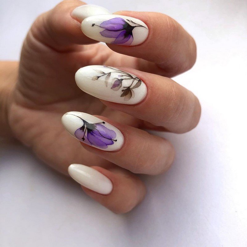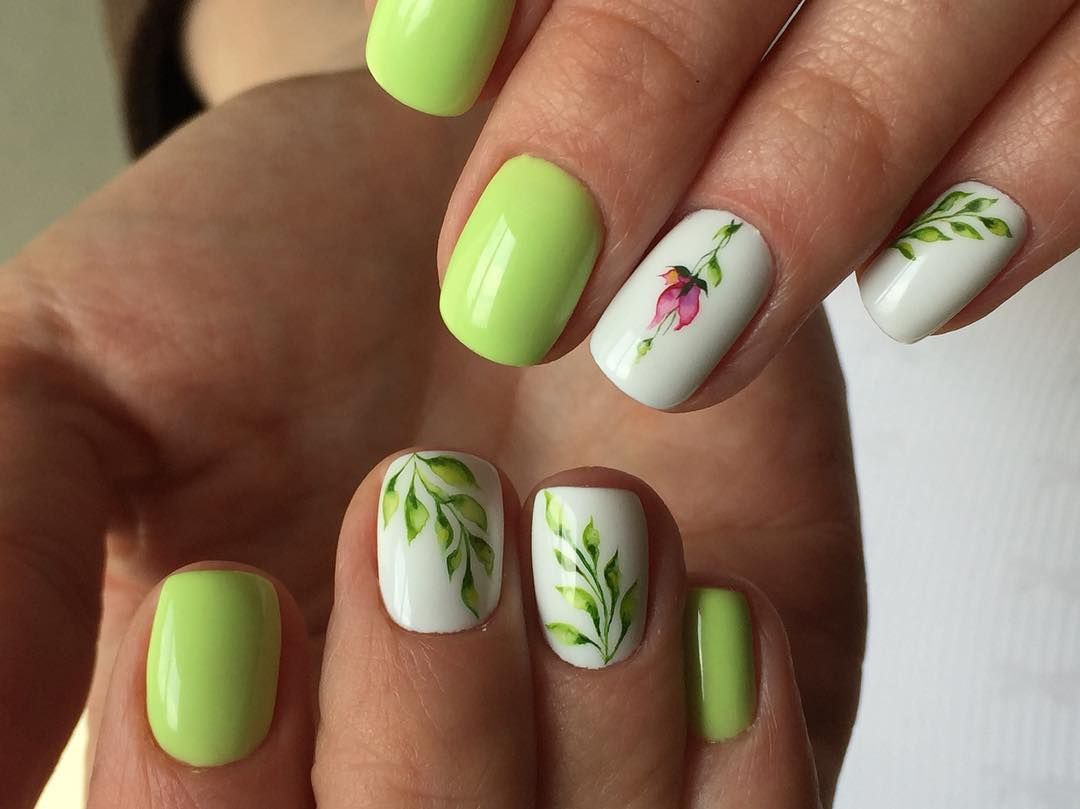 Рисунки актуальны в самое разное время года. Весной это прежде всего цветы — веточки мимозы, тюльпаны, нарциссы, подснежники и другие нежные первые дары природы. Обратите внимание — тренд нового сезона не предполагает ярких крупных рисованных цветов. Это дизайн в стиле минимализм, где цветы не выходят на первый план, а удачно дополняют общий замысел. Например, стемпинг или наклейка. Рисунок цветы можно сочетать с фольгой или блестками. А вот стразы и втирку лучше отложить до праздника.