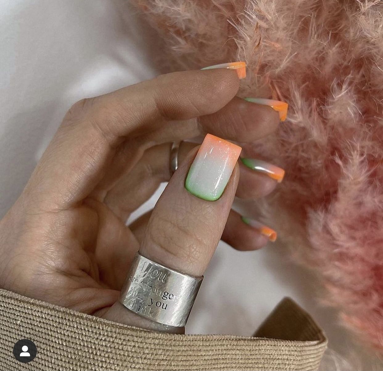 Яркое солнце в марте, ясное небо — почему бы не взять все лучшее у природы и не повторить в маникюре. Модным оттенком этой гаммы дизайнеры назвали танжело. Он полностью соответствует цвету, который в природе имеет шкурка танжерина — гибрида мандарина и грейпфрута. Танжело составит отличную пару в маникюре с коричневым, шоколадным, кофейным, бежевым и розовым.