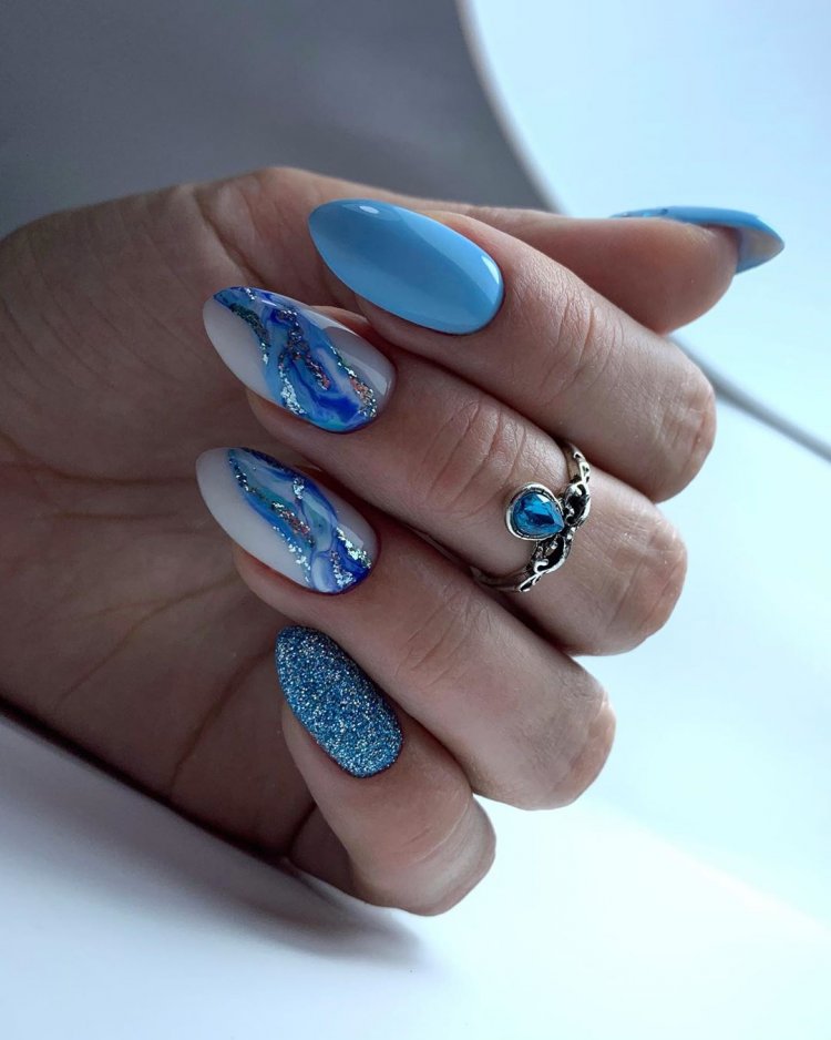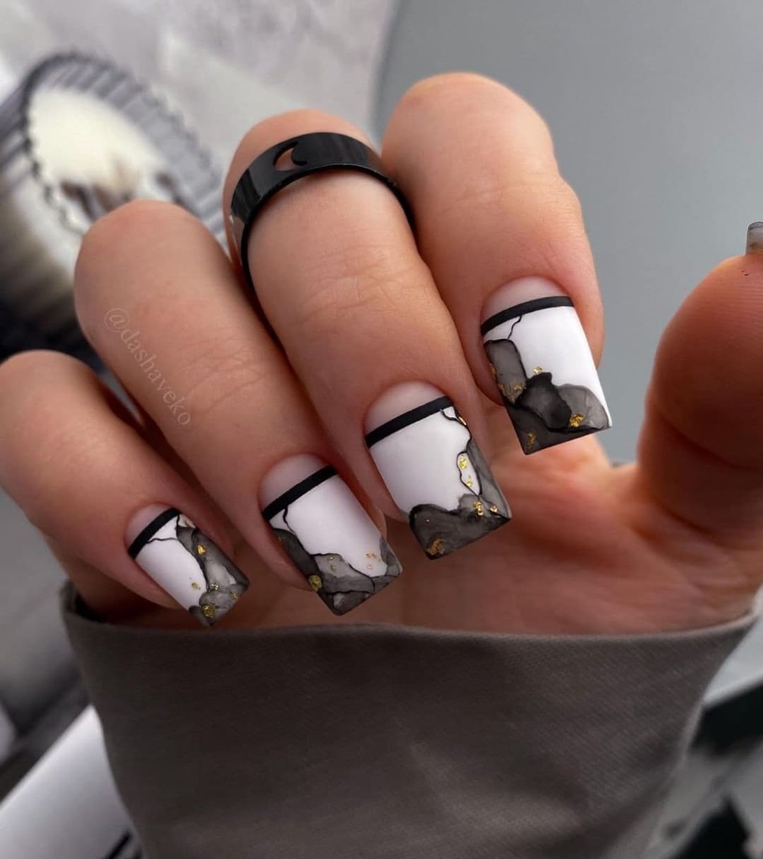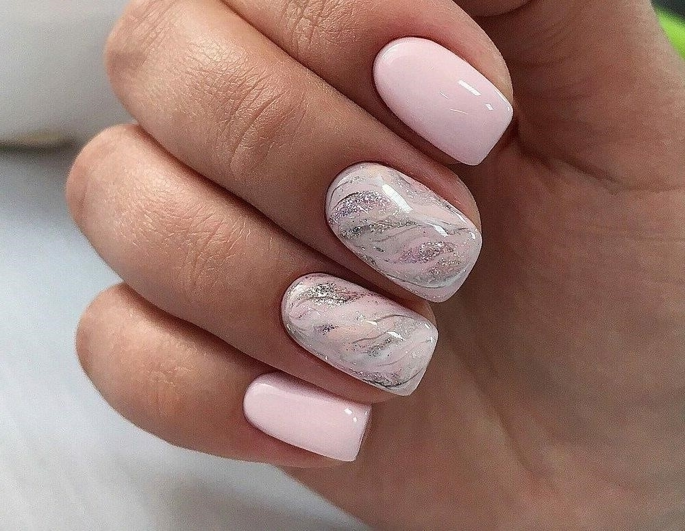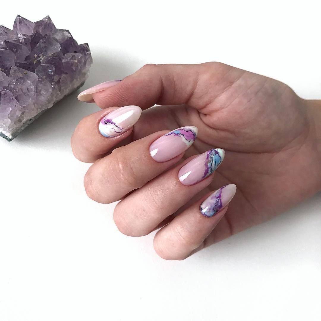 Это актуальный дизайн, но в марте рекомендуем отказаться от контрастных оттенков. Обратите внимание на нежные варианты мрамора, где ноготки скорее напоминают лед. Для вдохновения можно использовать кристаллы кварца — нежные и полупрозрачные с белыми прожилками.