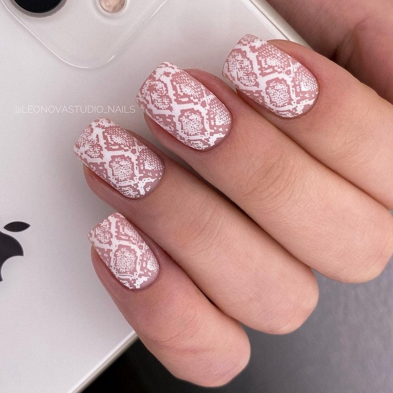 Техника позволяет быстро нанести на ногти затейливый узор. Выбирайте растительные мотивы или абстрактные узоры. В тренде многослойные варианты — мастер наносит рисунок стемпингом, покрывает его молочной базой, а затем снова формирует узор. Создается довольно интересный эффект 3д.