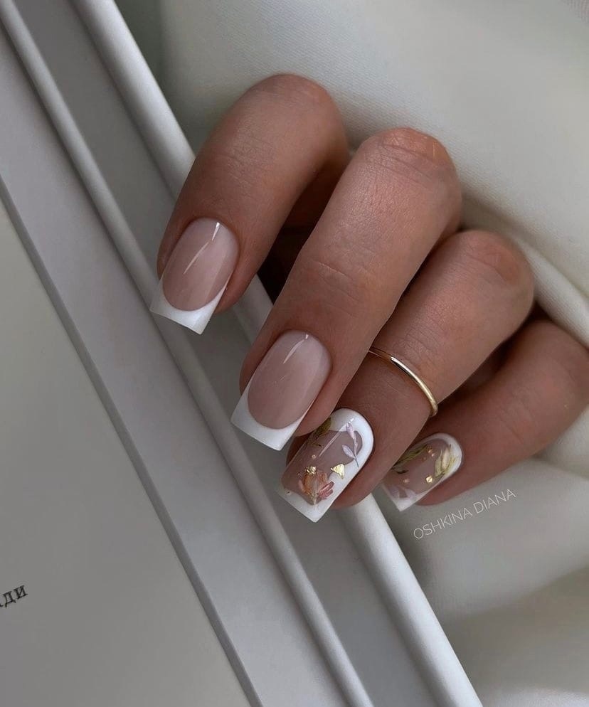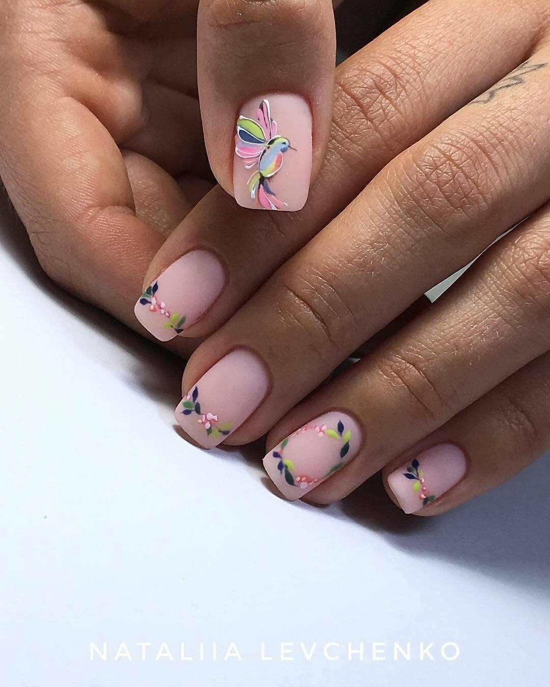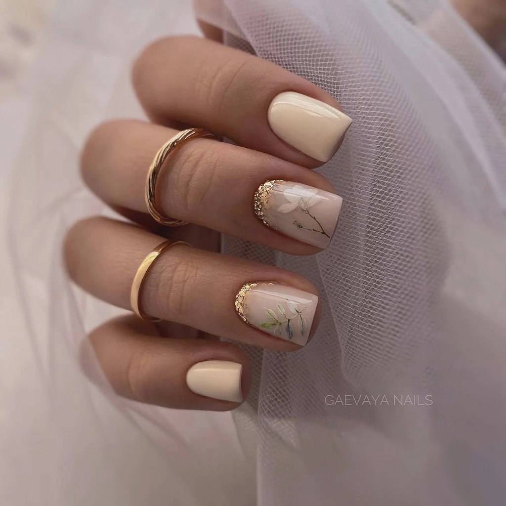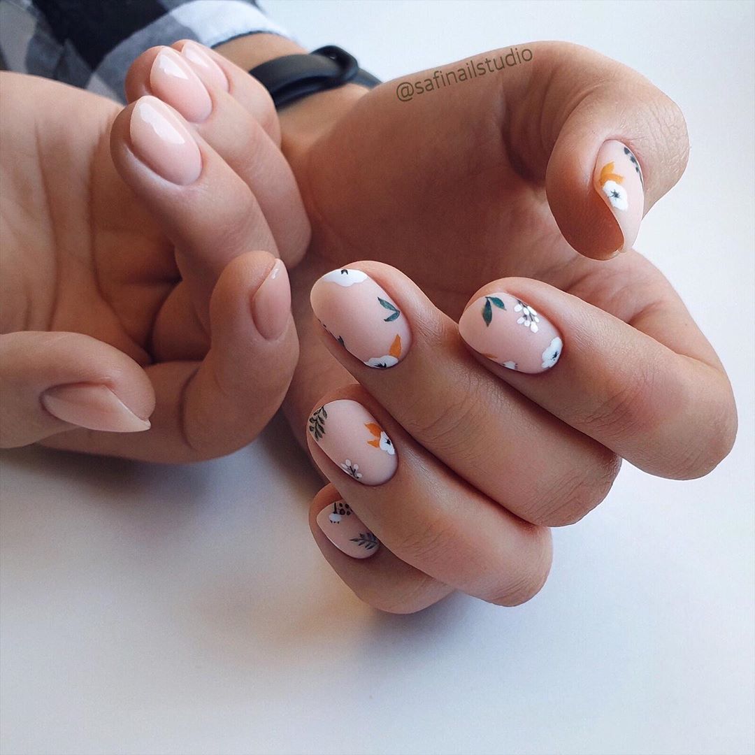 Короткие ноготки не стоит перегружать дизайном. Достаточно будет рисунка веточки или цветы, небольшого акцента фольгой или стразами. Помните — чем короче пластины, тем мельче должен быть декор.