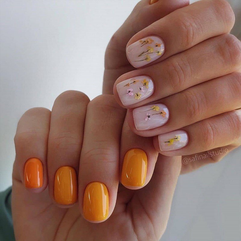 Один из трендов весны — маникюр с засушенными цветами. Для базы мастера используют прозрачный, нюдовый или пастельный лак. Сухоцветы распределяют по всей пластине, дополняя, например, фольгой. Таким образом можно оформить все ноготки и дизайн все равно не будет смотреться чрезмерно.