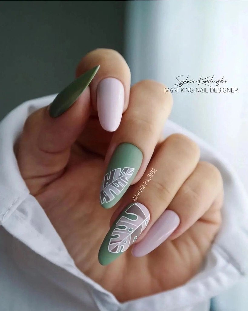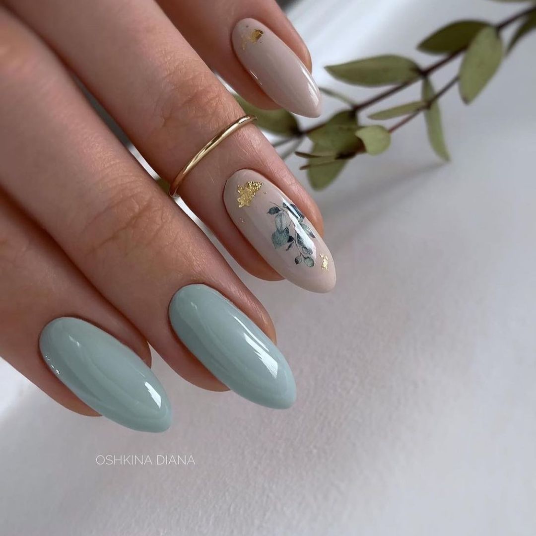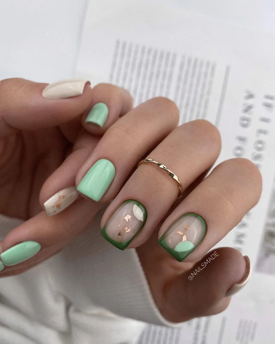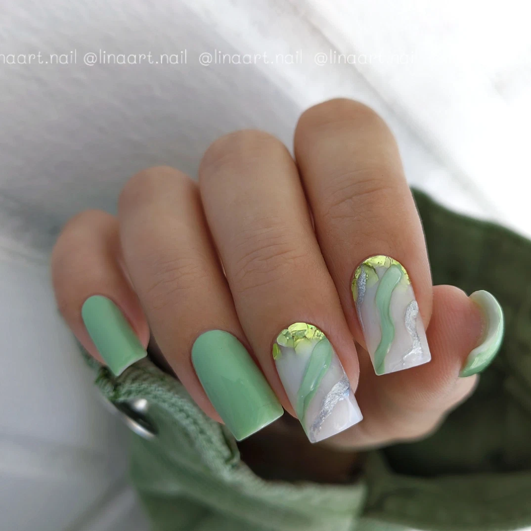 Без зеленого лака весенний маникюр создать довольно сложно. Обратите внимание на яркую молодую зелень. Но самым актуальным в мае считается оттенок мяты. Его можно выбрать для базы и украсить белыми цветами в стиле стемпинг. Отличное сочетание — мята и серебристый дизайн.