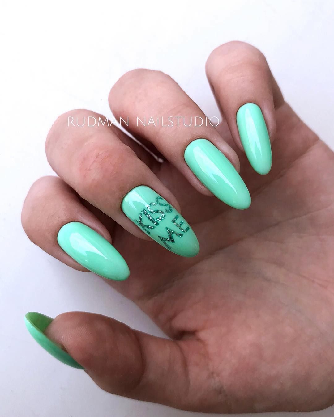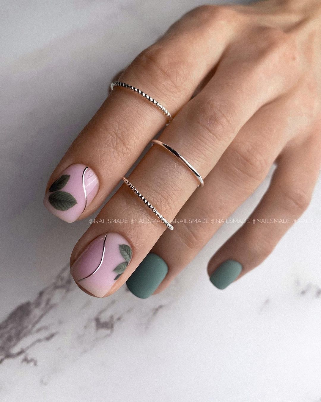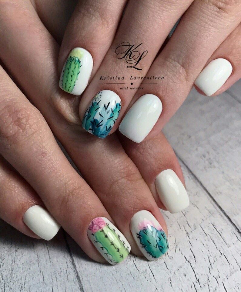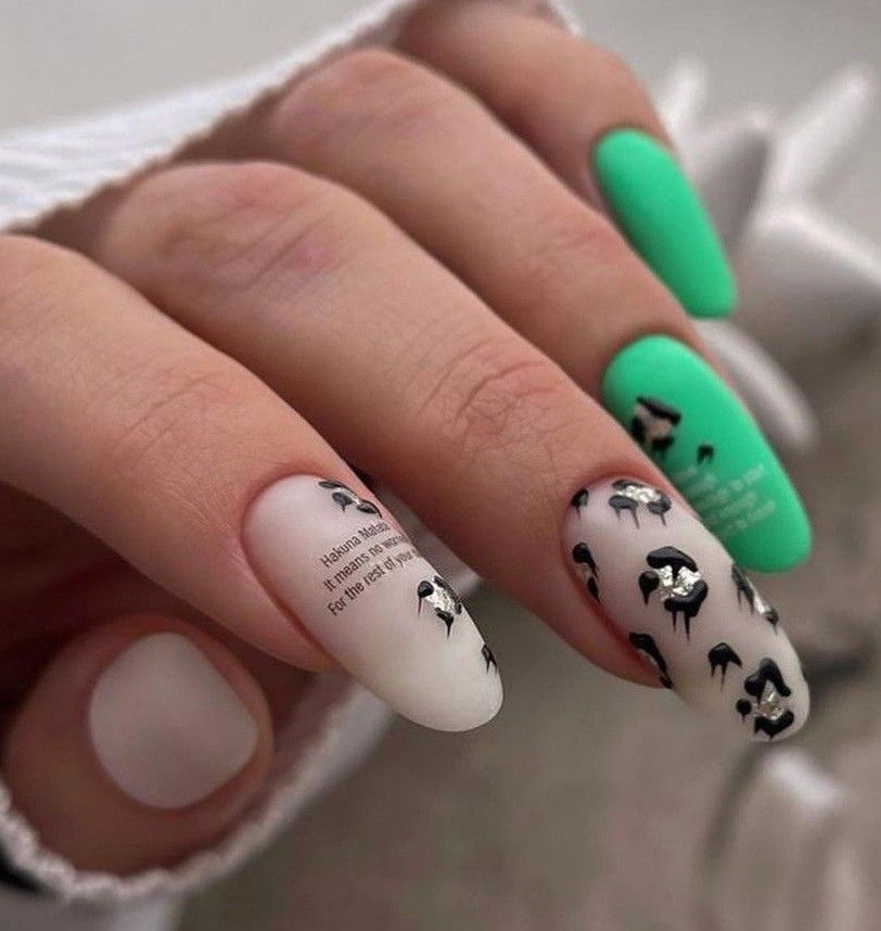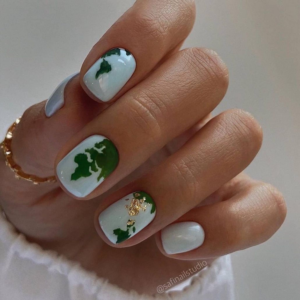 Без зеленого лака весенний маникюр создать довольно сложно. Обратите внимание на яркую молодую зелень. Но самым актуальным в мае считается оттенок мяты. Его можно выбрать для базы и украсить белыми цветами в стиле стемпинг. Отличное сочетание — мята и серебристый дизайн.