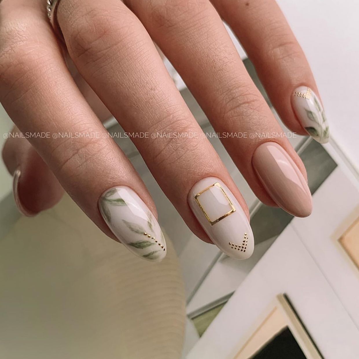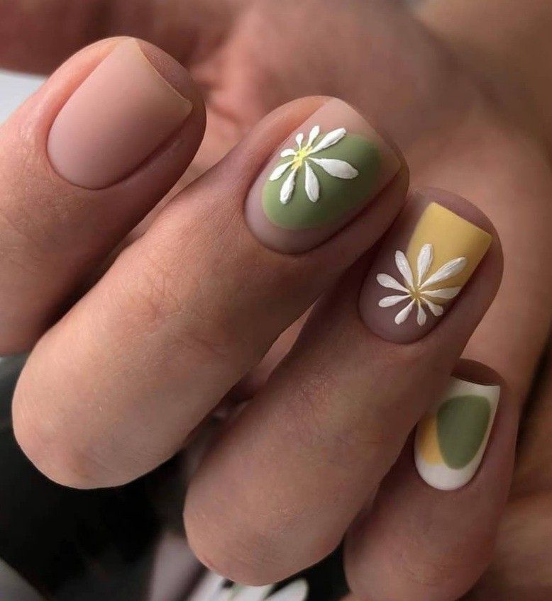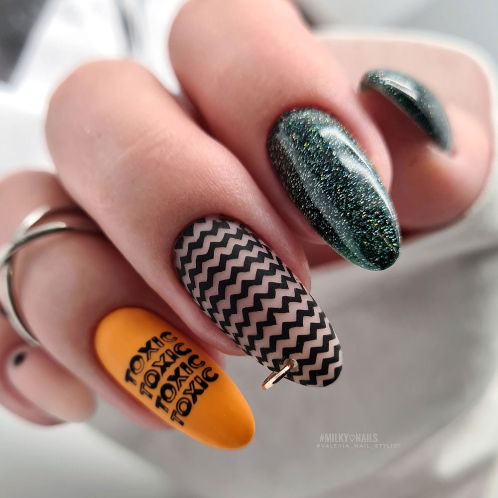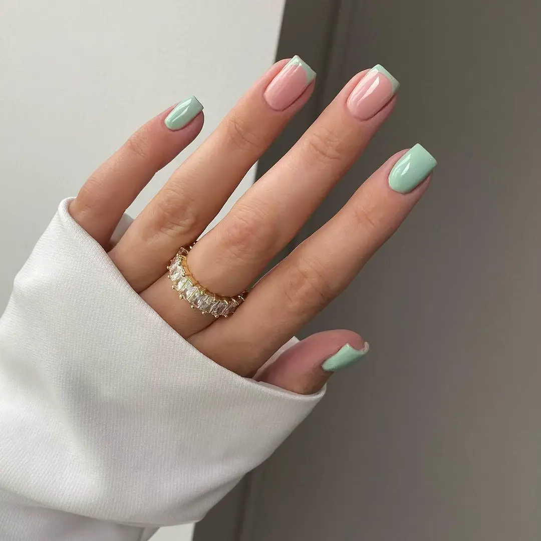 Без зеленого лака весенний маникюр создать довольно сложно. Обратите внимание на яркую молодую зелень. Но самым актуальным в мае считается оттенок мяты. Его можно выбрать для базы и украсить белыми цветами в стиле стемпинг. Отличное сочетание — мята и серебристый дизайн.