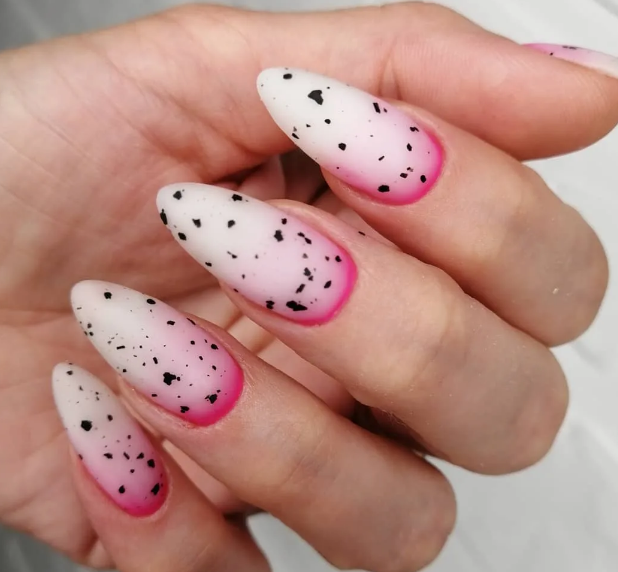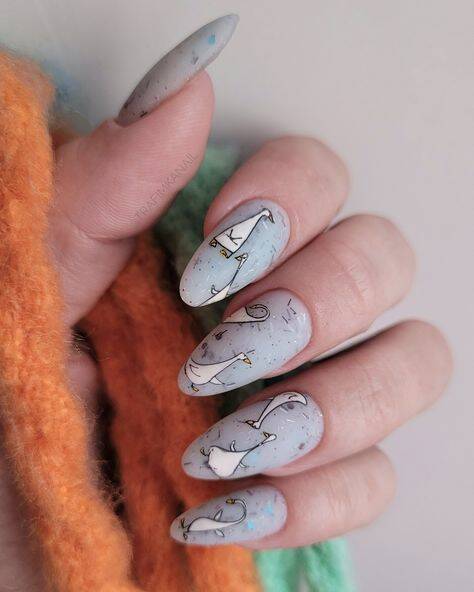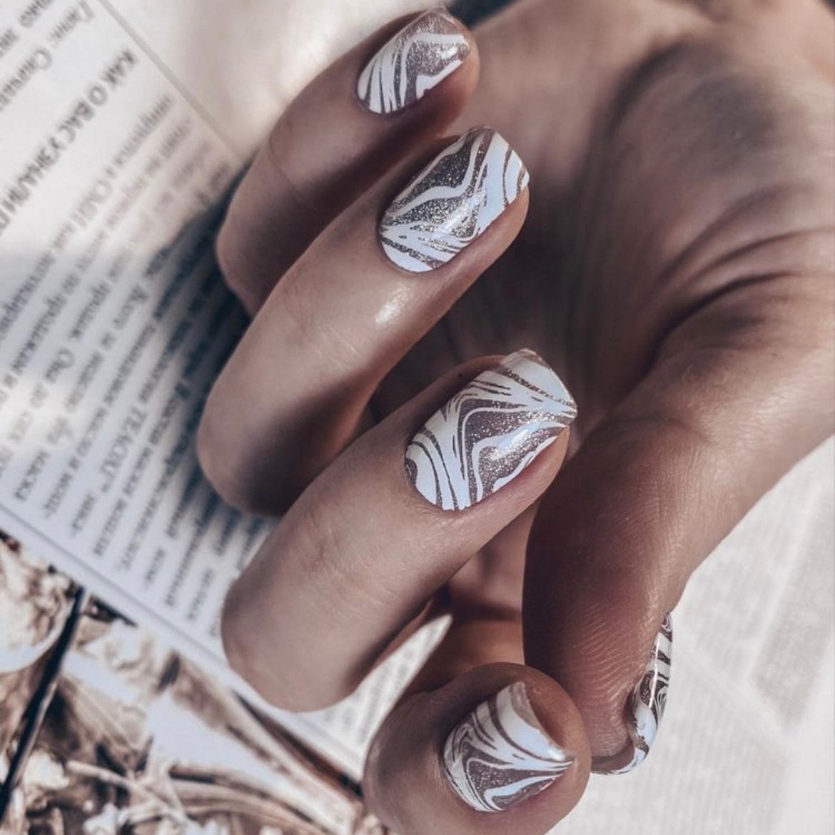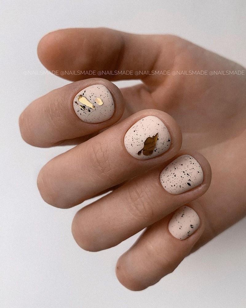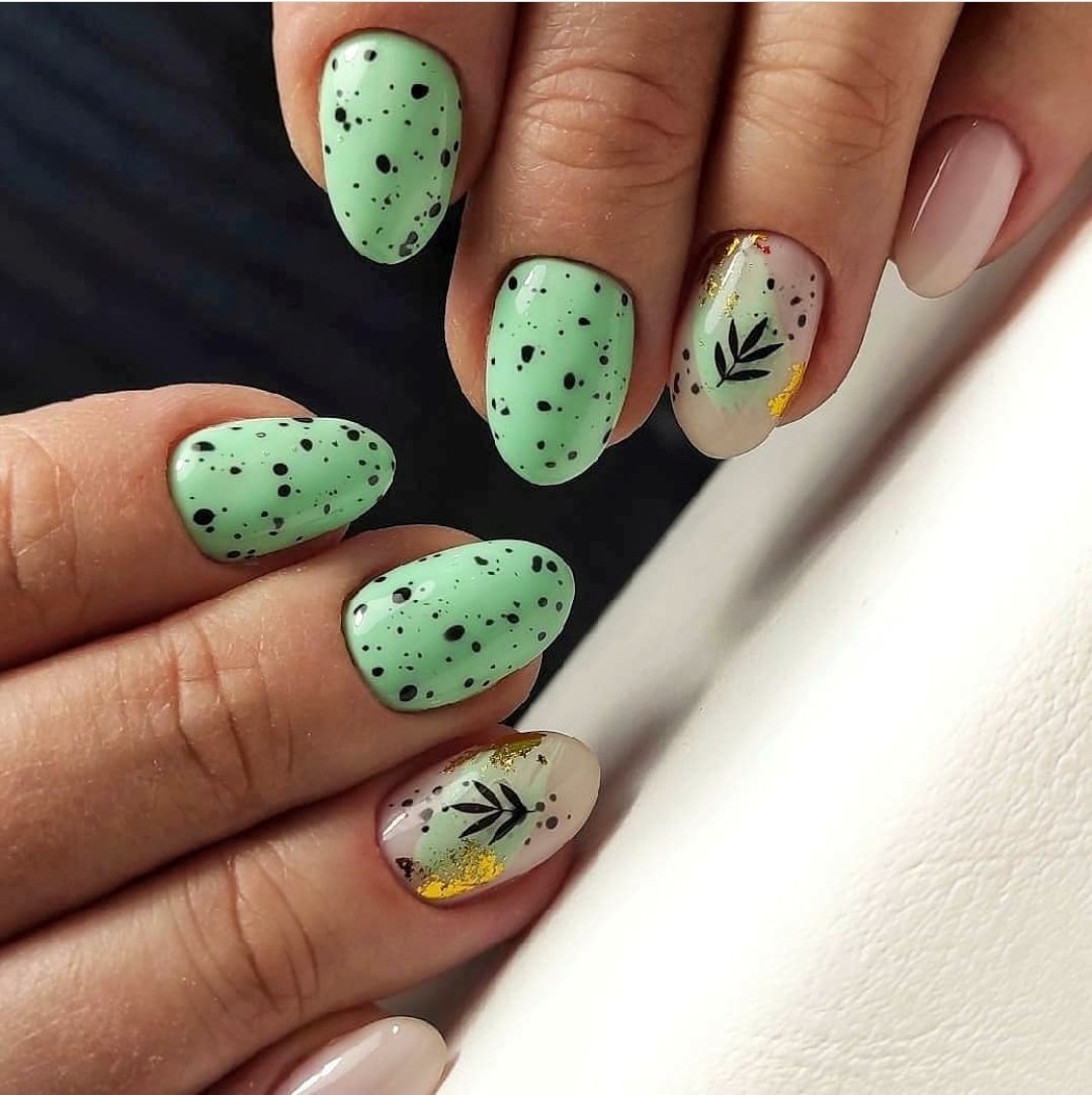 Необычна и очень простая текстура, имитирующая скорлупу перепелиного яйца. Удивительно, но этот незатейливый рисунок делает ногти интересными и очень стильными. Выбирайте любые оттенки лака для базы, а точки наносите привычным коричневым или серым лаком.