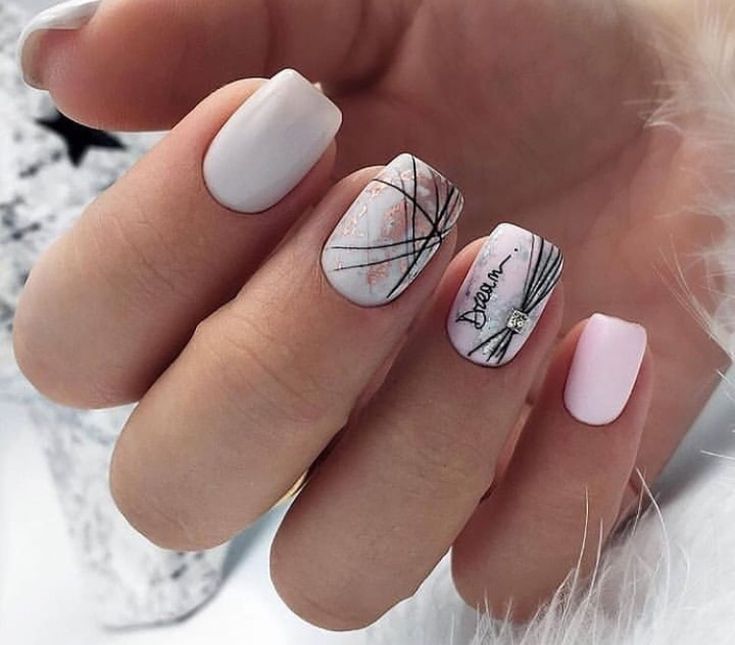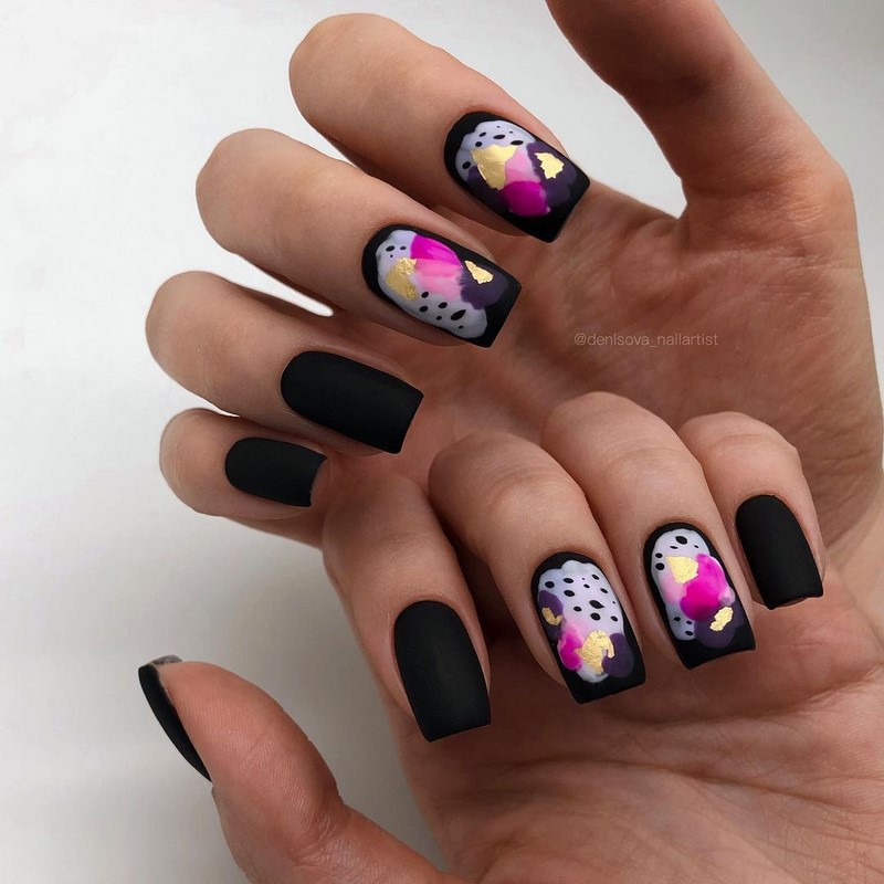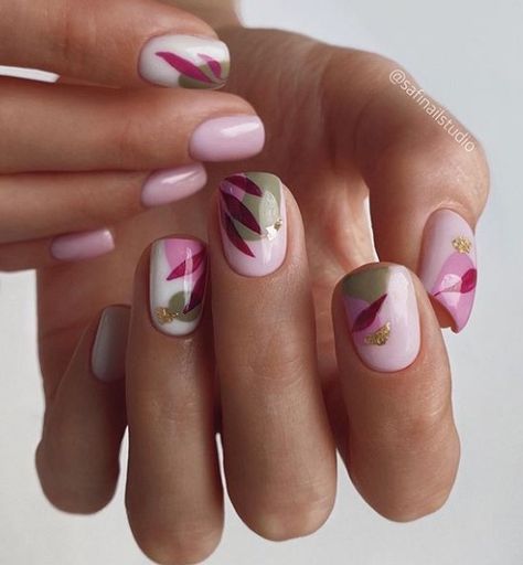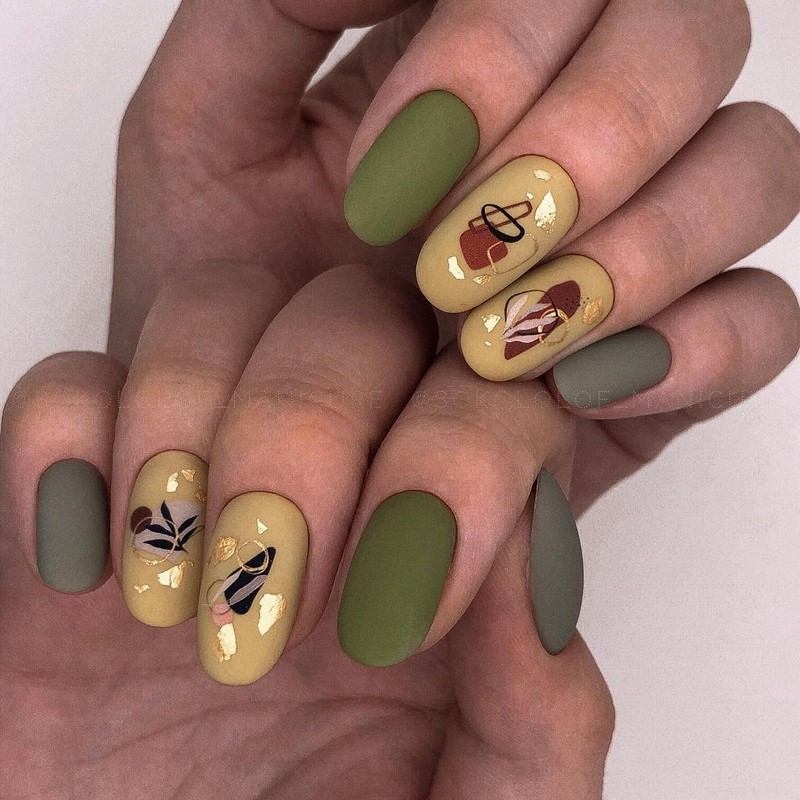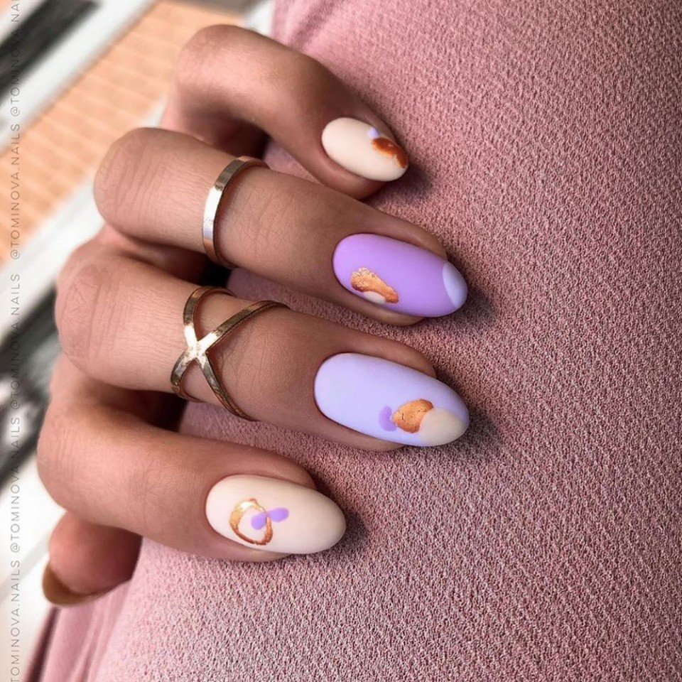 Те, кто не хочет использовать флористическую тему, может обратить внимание на абстрактные рисунки. Цвета лака для создания такого дизайна можно выбрать близкие или, наоборот, контрастные. Эффектно смотрится ат абстрактный рисунок на матовой базе с делением на зоны с помощью фольгированных полосок.
