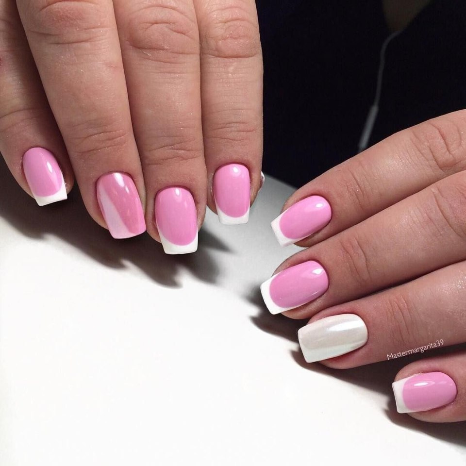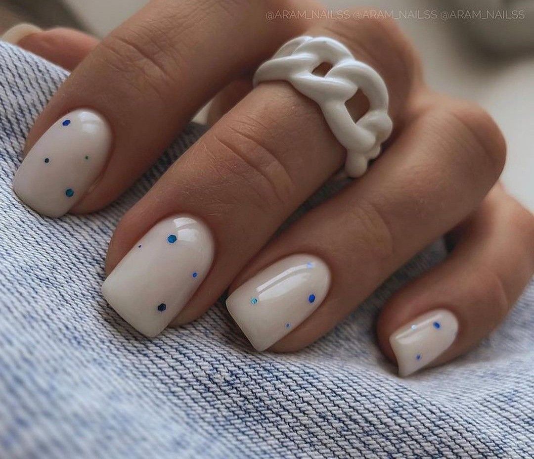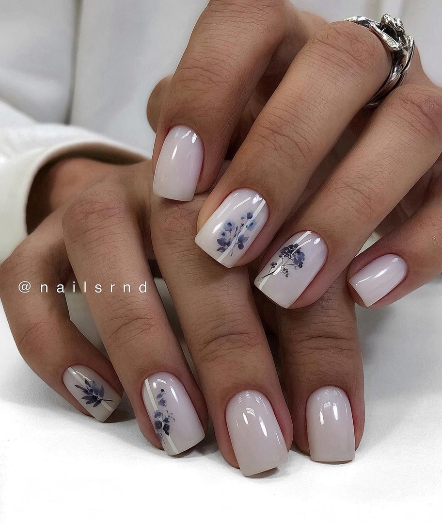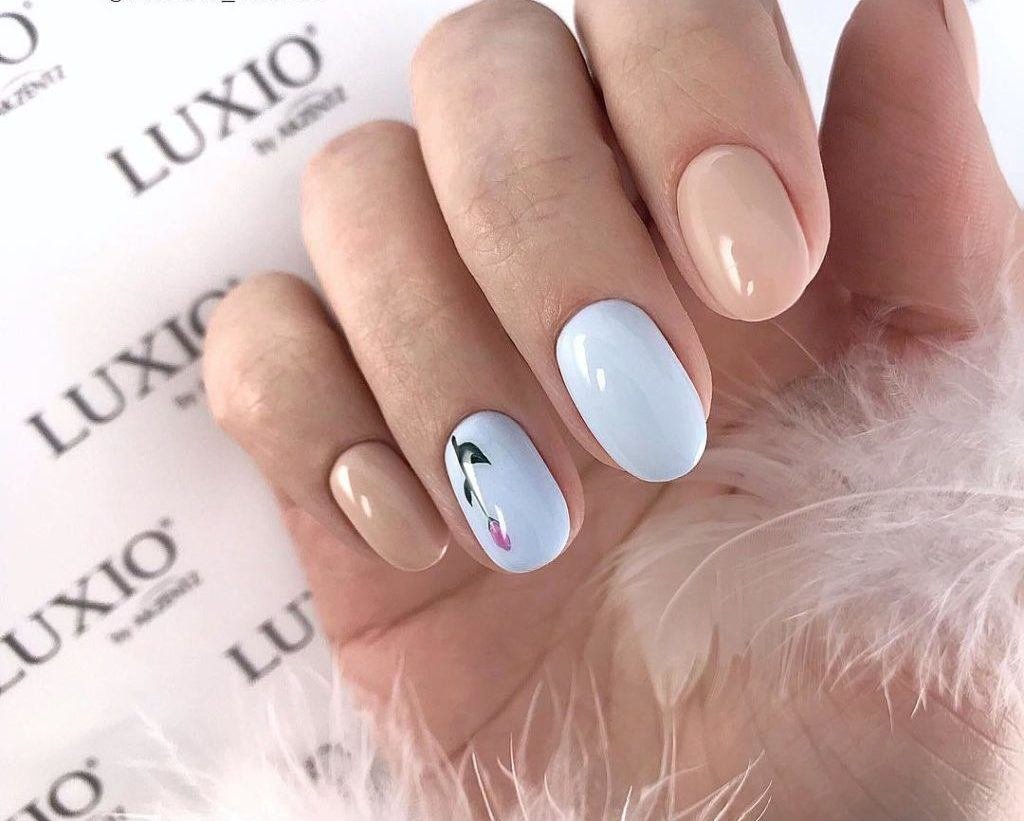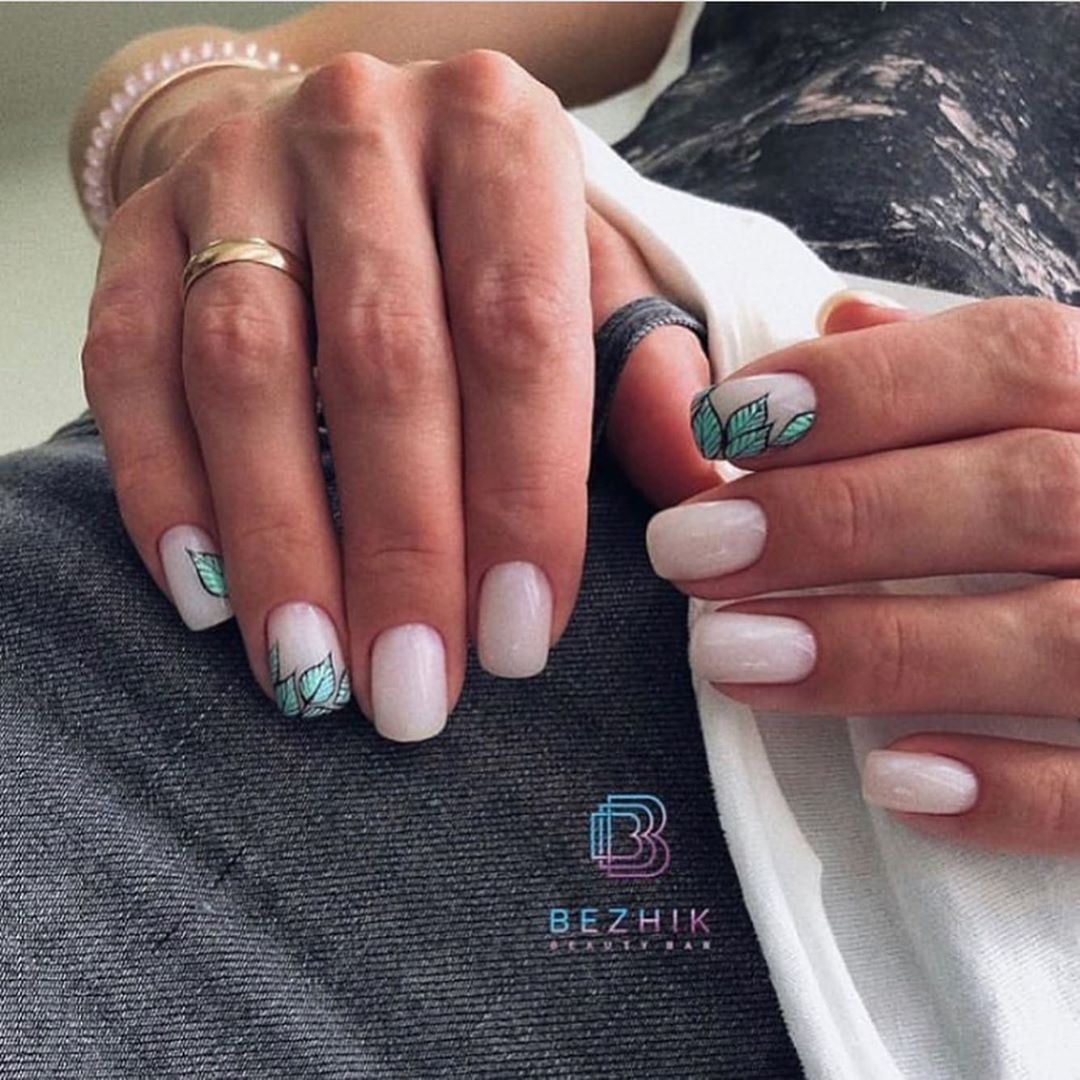 Это один из самых востребованных цветов в майском маникюре. Обратите внимание на то, что база не должна быть кипельно белой. Лучше сделать ее молочно и полупрозрачной. На такой базе отлично будет смотреться любой вариант дизайна.