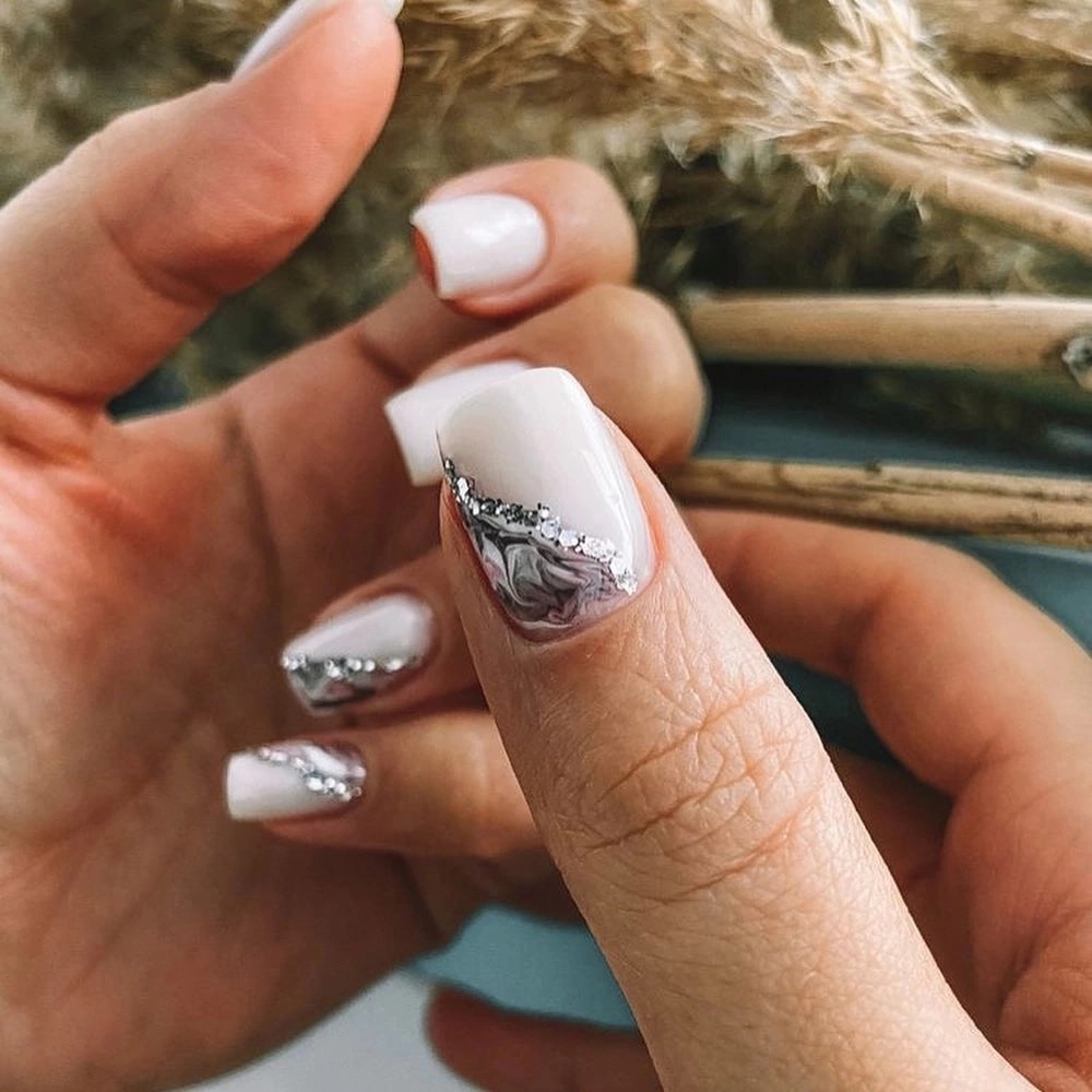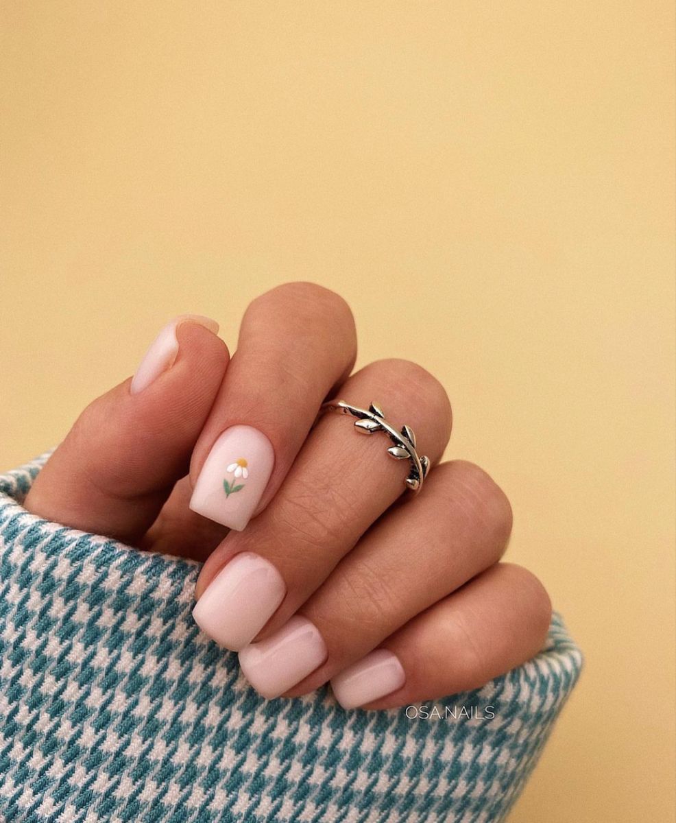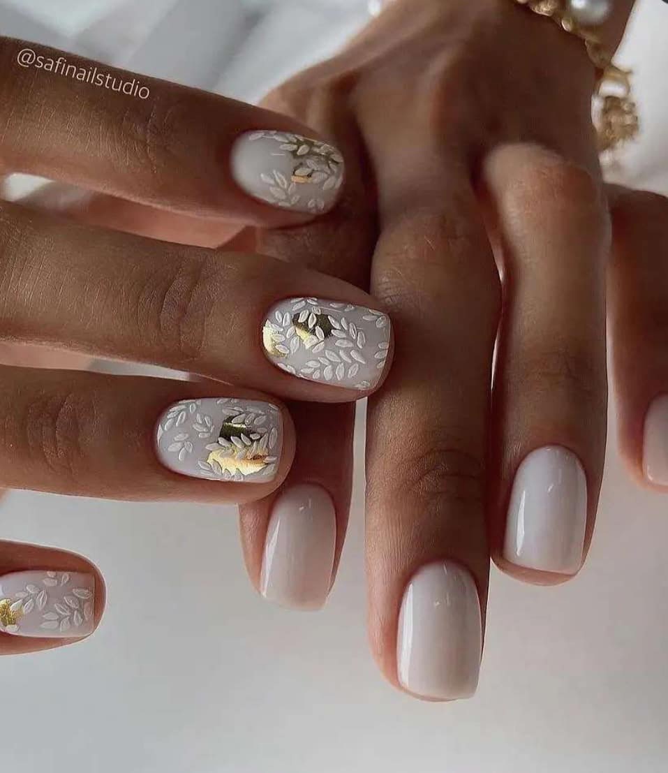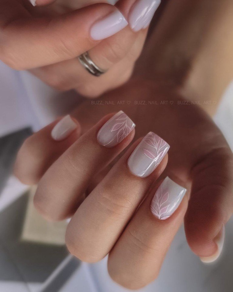Это один из самых востребованных цветов в майском маникюре. Обратите внимание на то, что база не должна быть кипельно белой. Лучше сделать ее молочно и полупрозрачной. На такой базе отлично будет смотреться любой вариант дизайна.
