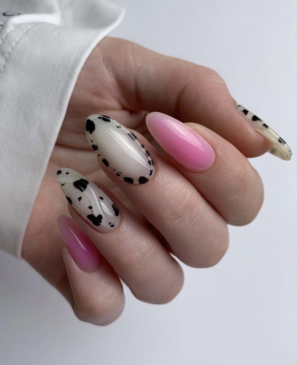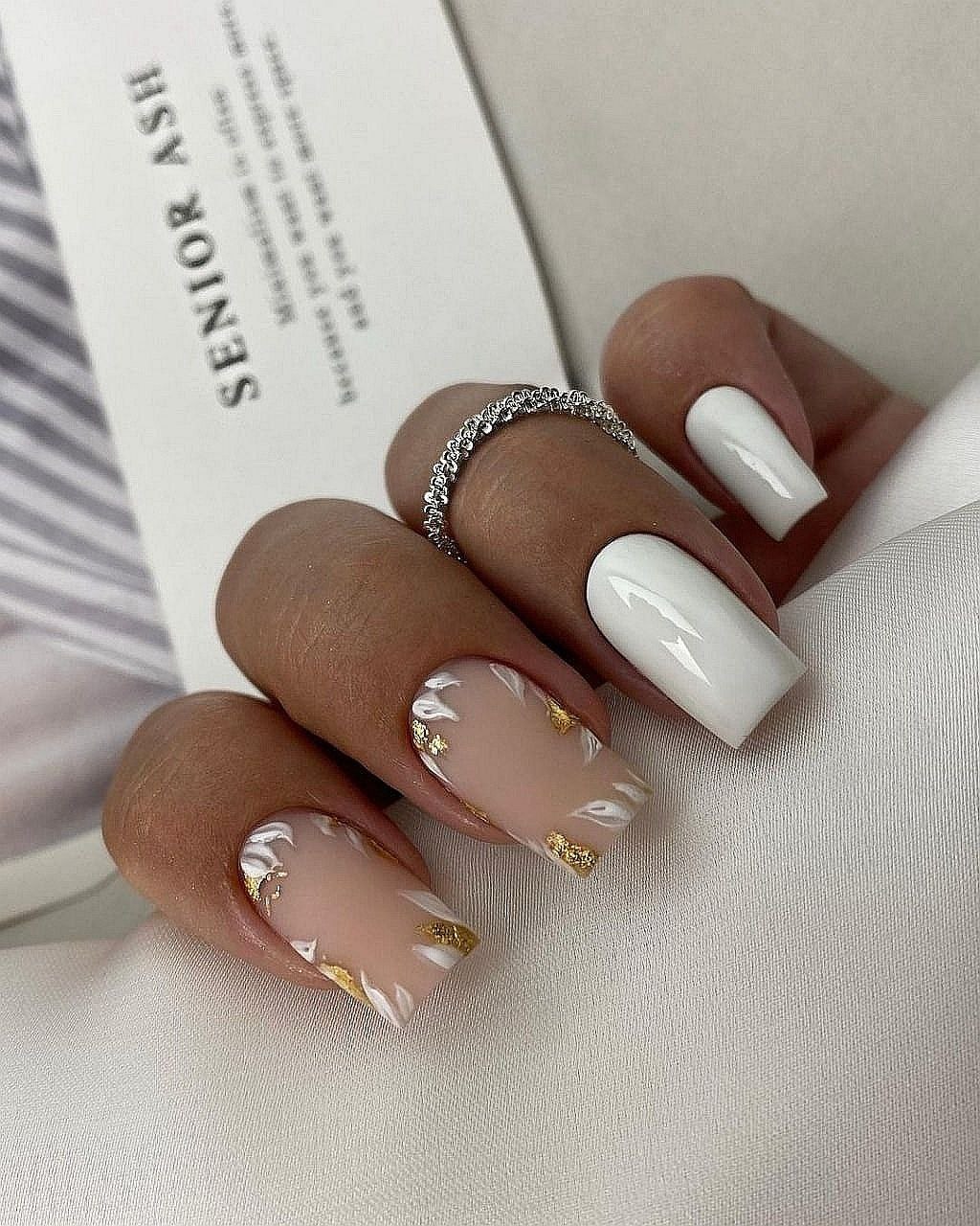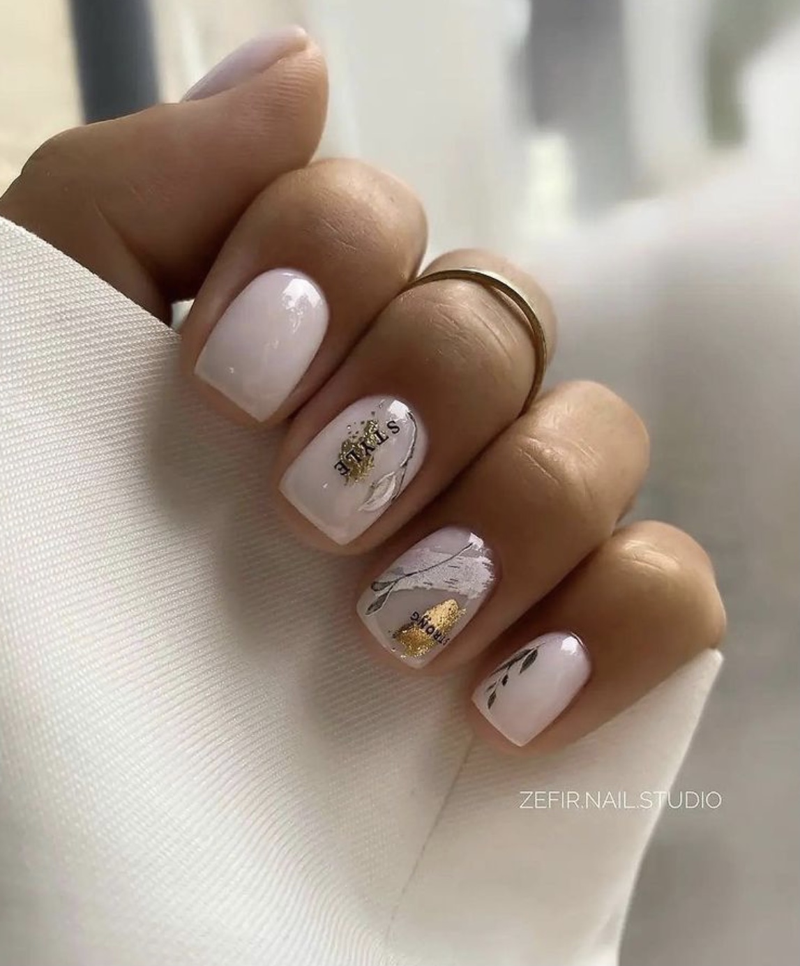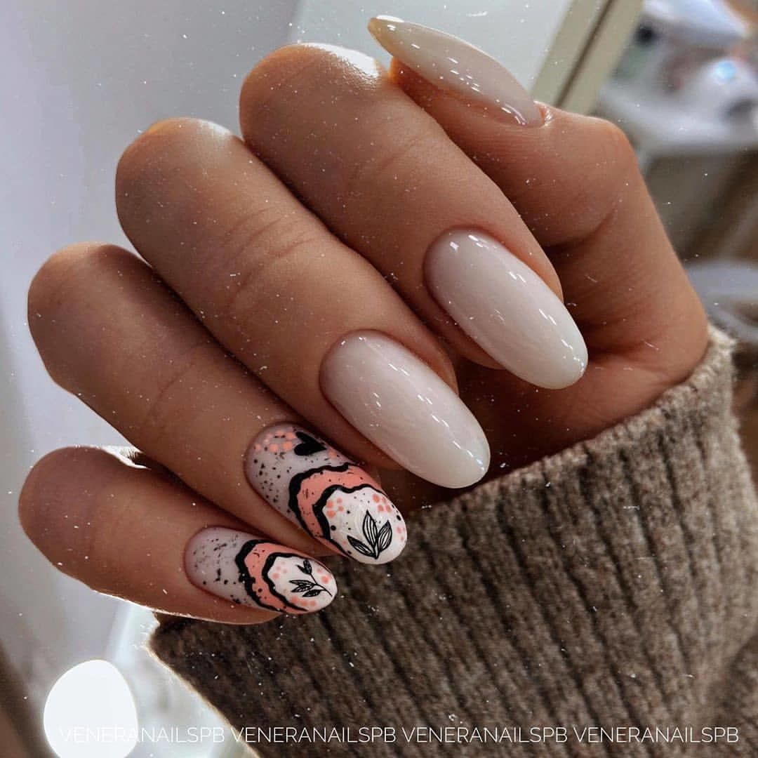 Это один из самых востребованных цветов в майском маникюре. Обратите внимание на то, что база не должна быть кипельно белой. Лучше сделать ее молочно и полупрозрачной. На такой базе отлично будет смотреться любой вариант дизайна.