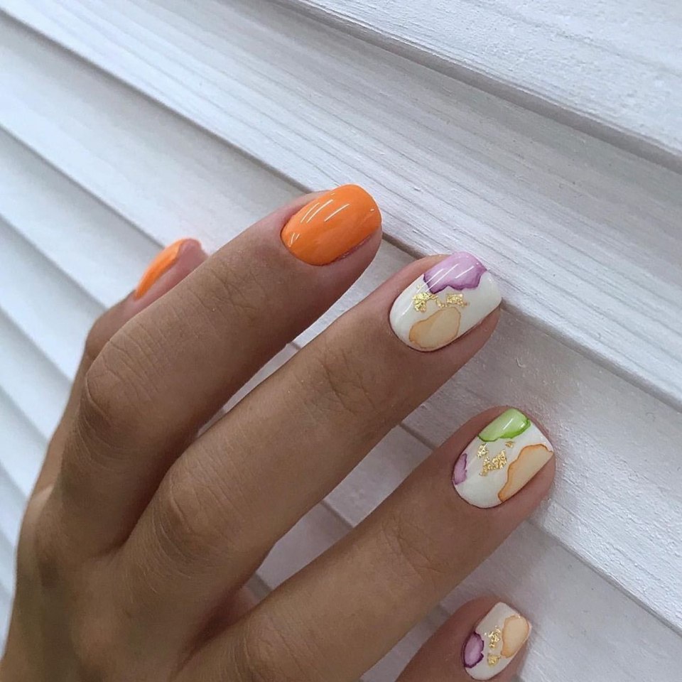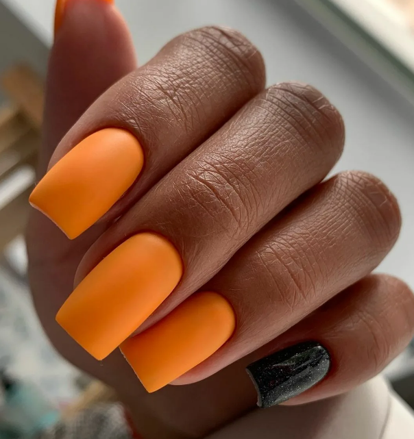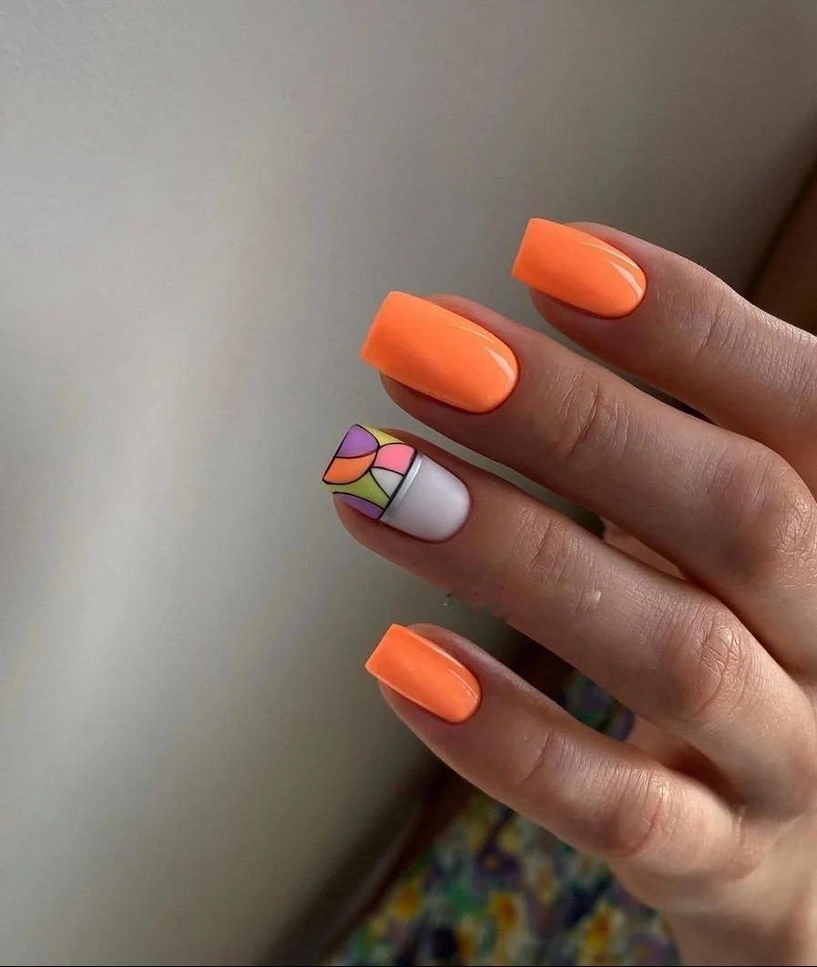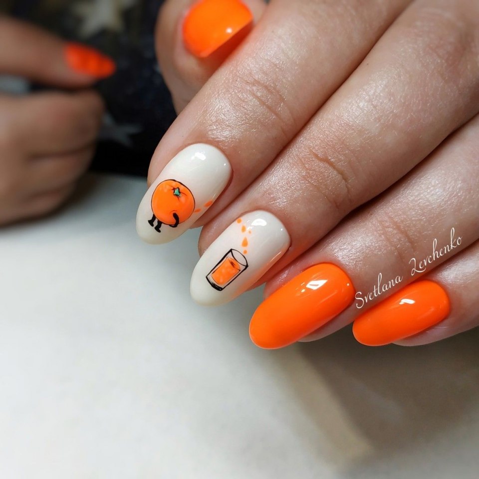 Оттенок спелого цитруса отлично смотрится на ногтях в мае. Обратите внимание на вариант с омбре, где сочетаются красный, оранжевый желтый оттенок. На оранжевой базе отлично смотрятся любые активные рисунки и наклейки.