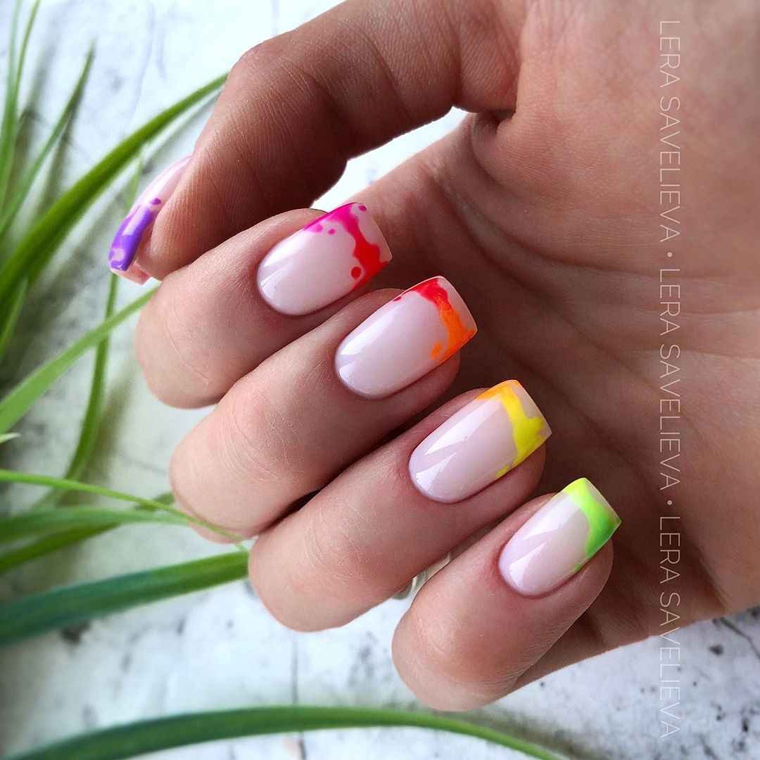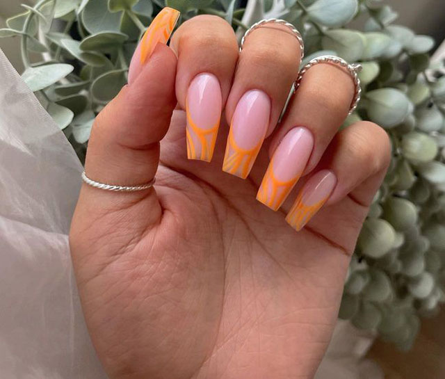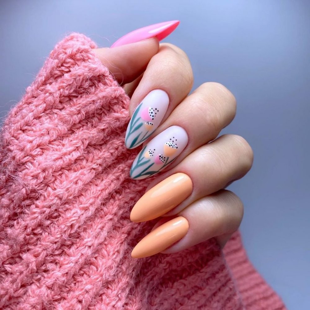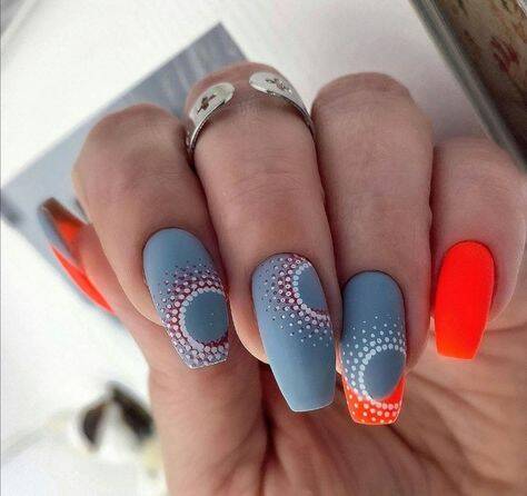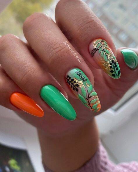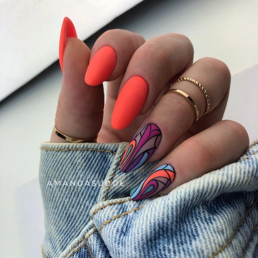 Оттенок спелого цитруса отлично смотрится на ногтях в мае. Обратите внимание на вариант с омбре, где сочетаются красный, оранжевый желтый оттенок. На оранжевой базе отлично смотрятся любые активные рисунки и наклейки.