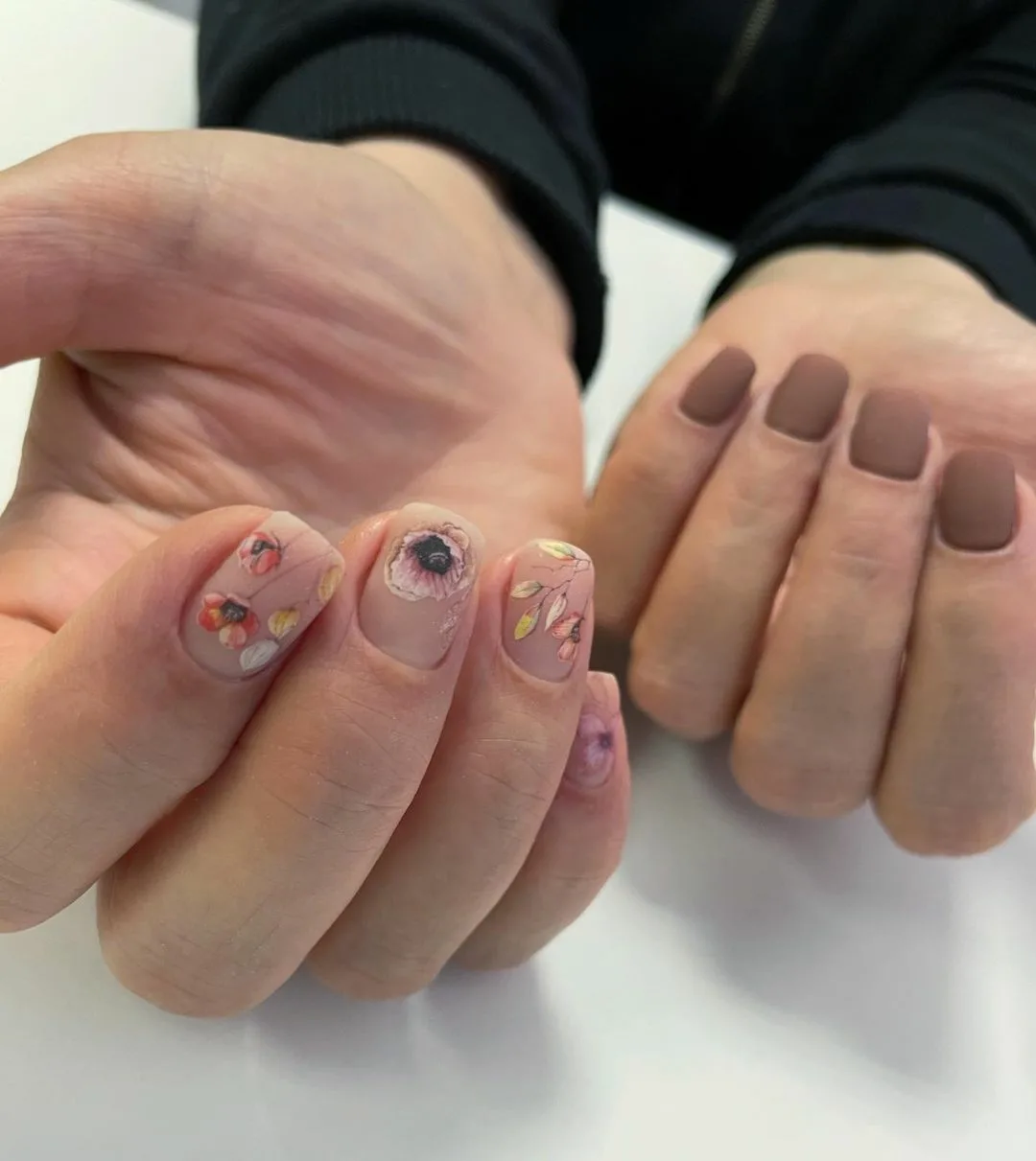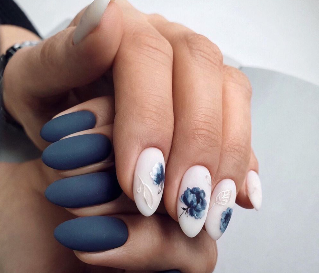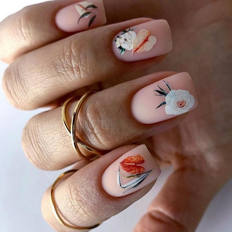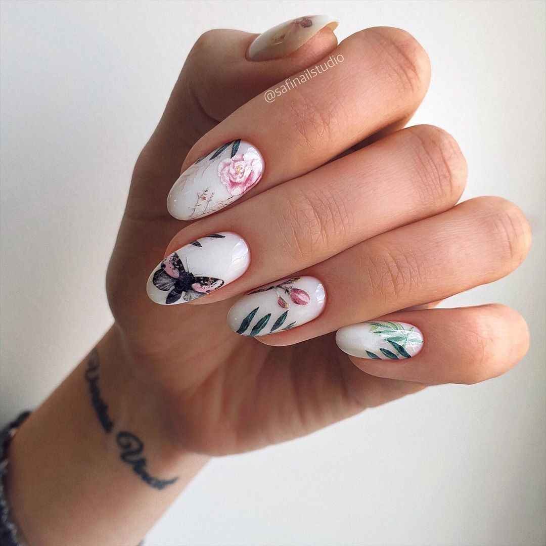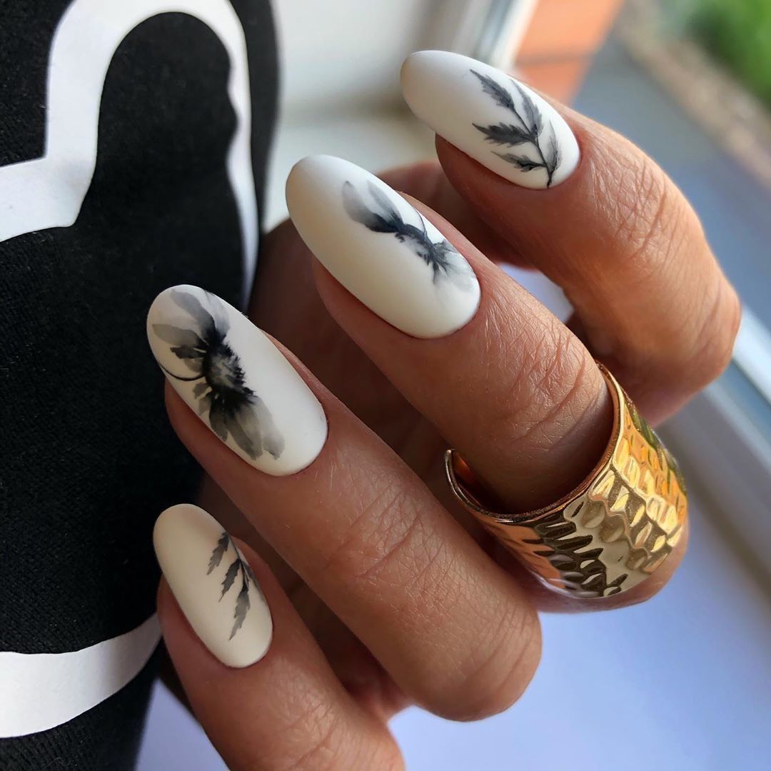 Цветы и другая флористика — самый актуальный вариант для маникюра в мае. Вы можете отдать предпочтение скромным минималистичным рисунками или сделать дизайн «под обои», когда на ноготки наносят богатый густой рисунок цветов с симметричным исполнением. Такой дизайн лучше всего смотрится на матовой темной основе.